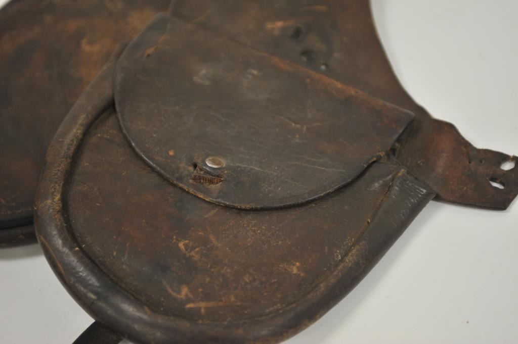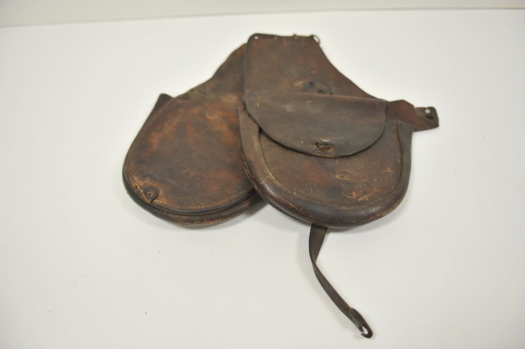 Small pair of leather flap cover unmarked saddle bags, overall fair condition; uncleaned broken tie down straps; leather thong linking the two bags is mostly missing. Est.: $125-$175.