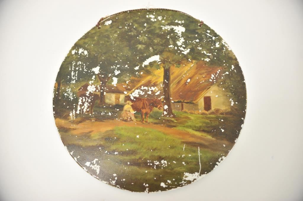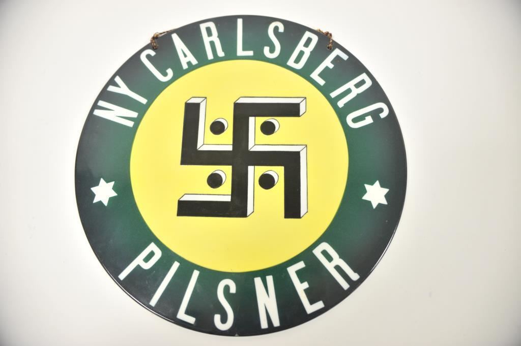 NY Carlsberg Pilsner porcelain advertiser with painting on backside of farm scene; some flaking to scene; advertising side is overall fine. Est.: $50-$75.