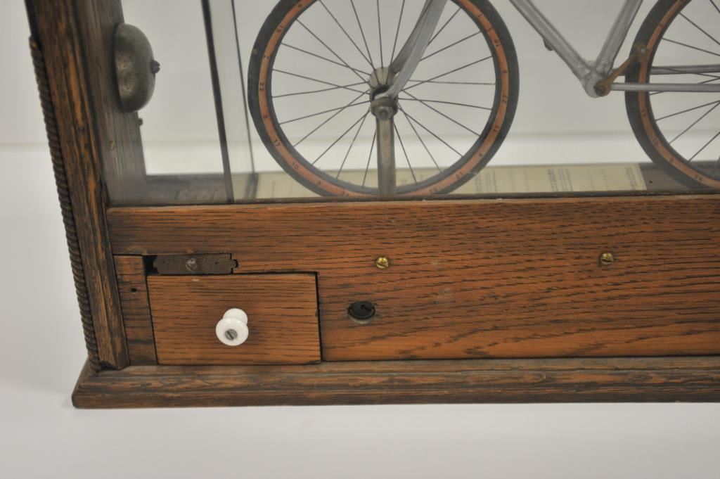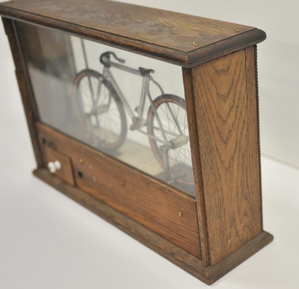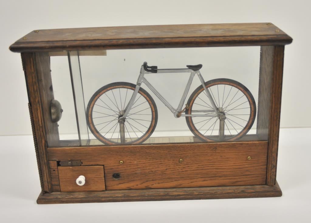 Antique countertop 5 cent trade stimulator, approximately 13.5” in height, 20” wide and 6” deep; casing is oak and glass with bicycle mechanism and instructions “DROP A NICKEL IN THE SLOT/Turn the lever full sweep to the right and release/Add together the numbers to which the indicators point, and get the above rewards”. Brass maker’s tag fron The Sun Mfg. Co., Columbus, Ohio; good condition and working at time of description. Est.: $400-$800.