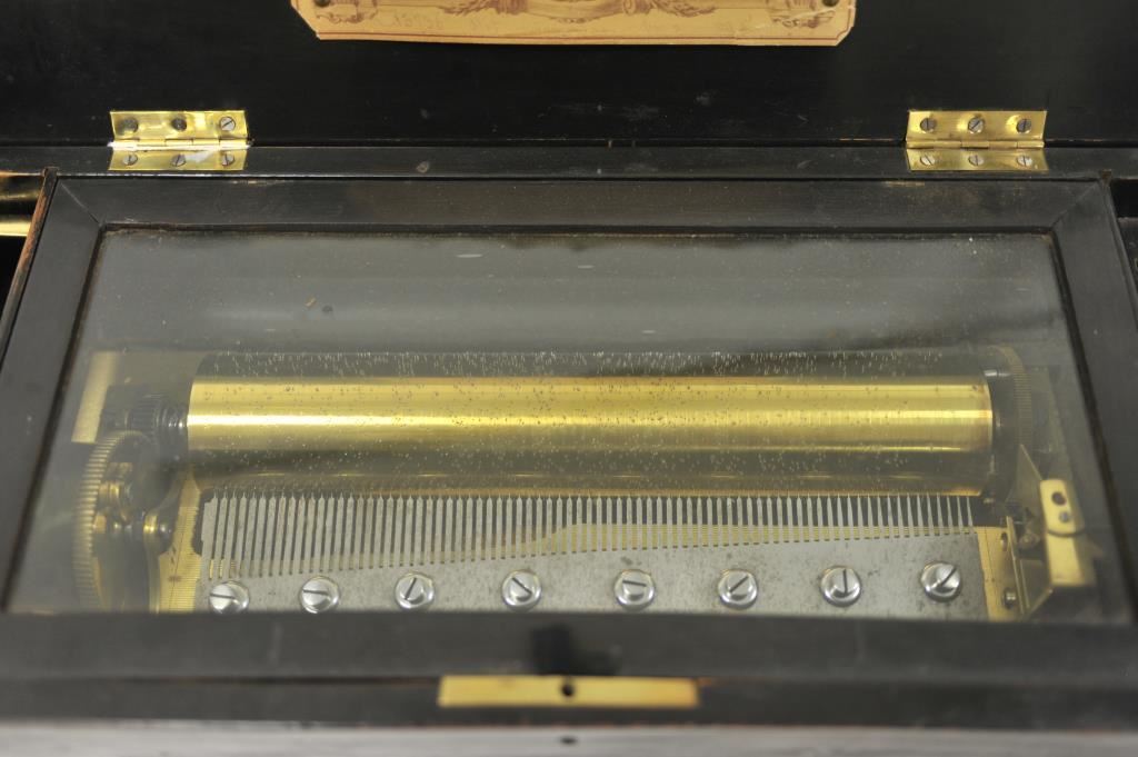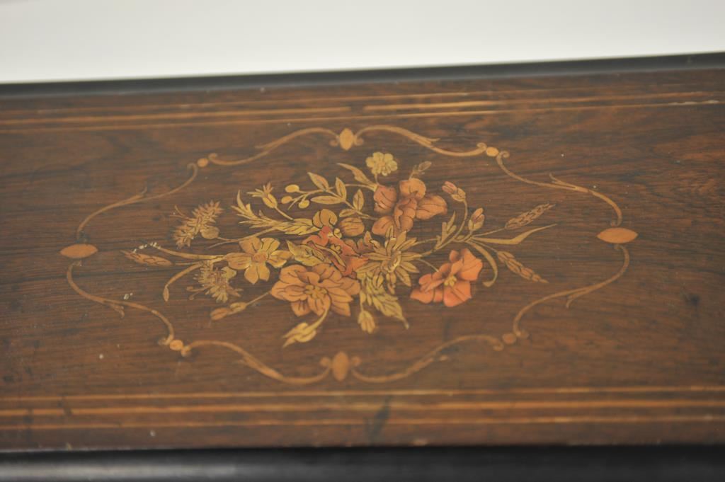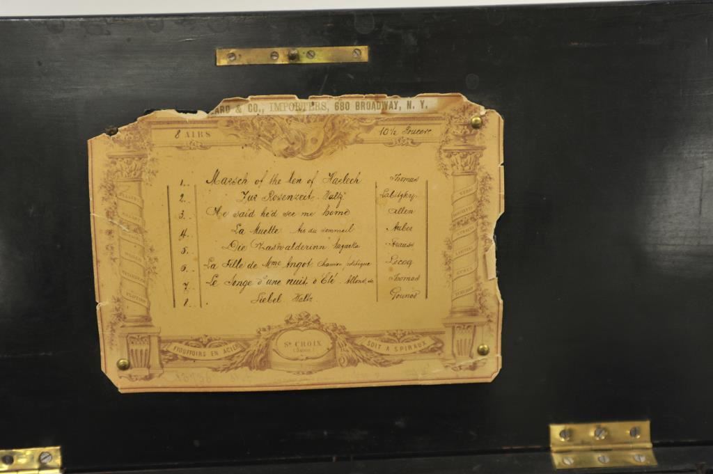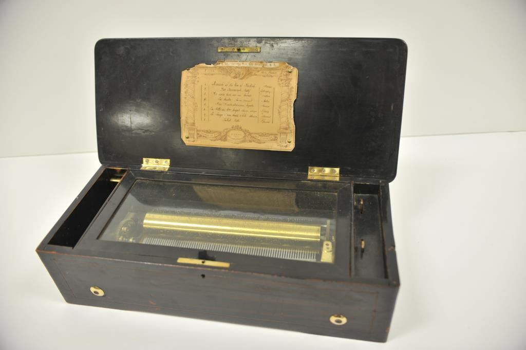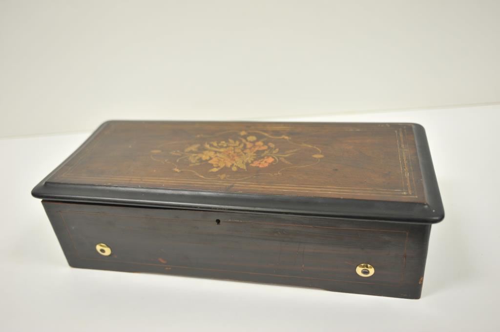 Beautiful antique music box, approximately 5.5” in height, 20.5” long and 9” wide; wood casing with flower and borderline inlays to lid; working at time of description; eight tunes listed on label affixed to inside of lid. Est.: $400-$800.