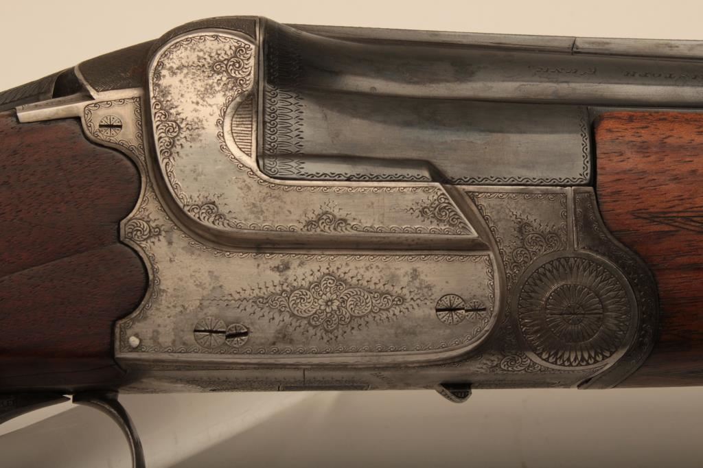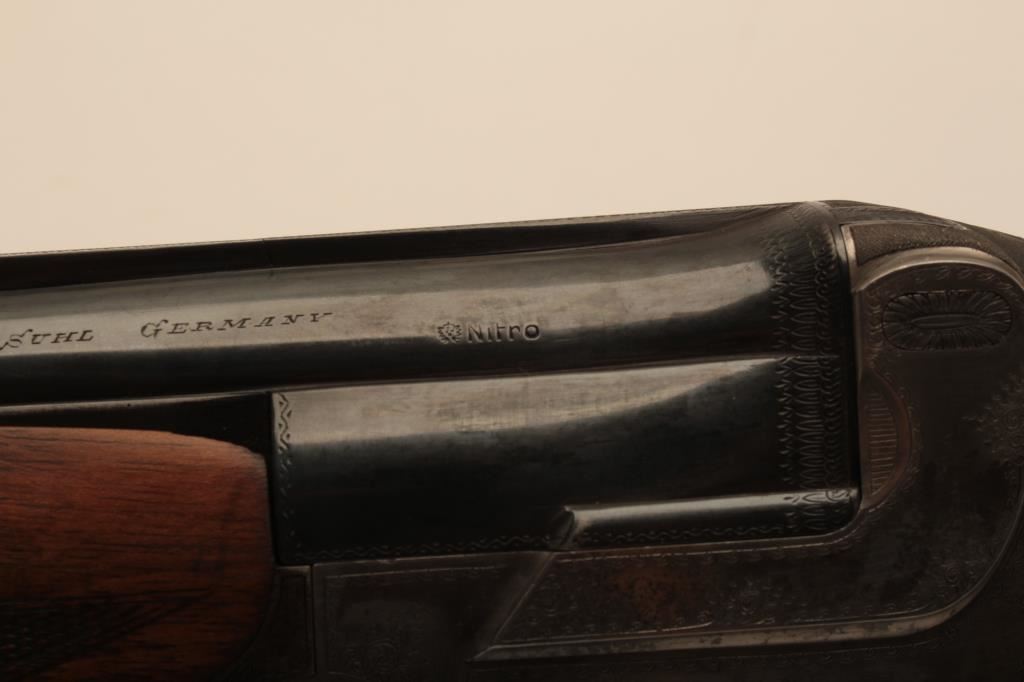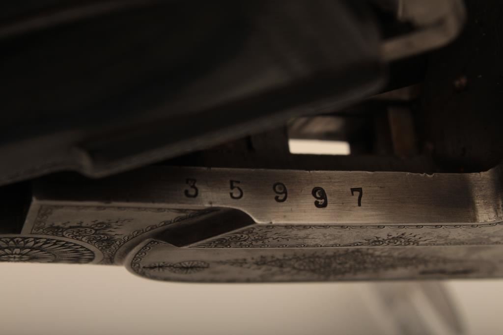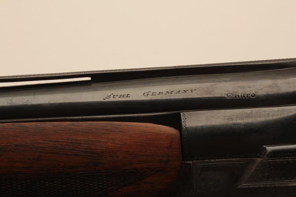 German O/U shotgun, 12 gauge, 32” ventilated rib barrels marked “Christoph Funk”, single trigger, blued barrels, engraved receiver, checkered wood stocks with flame graining to butt stock and added Pachmayr hard rubber butt pad, S/N 35997; overall very good + condition with crisp actions, tasteful engraving, near fine bores; wood is overall very good with two old wood strength pegs added to wrist. (Modern/NO PPT). Est.: $900-$1,800.