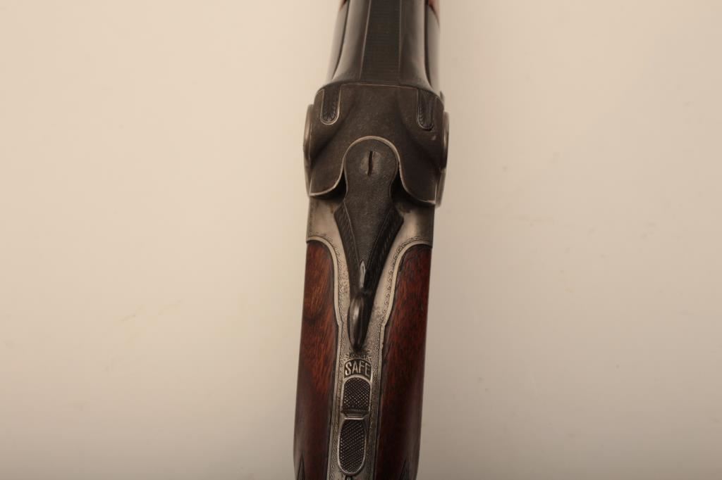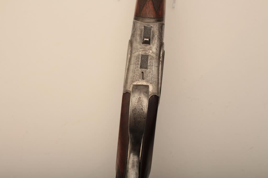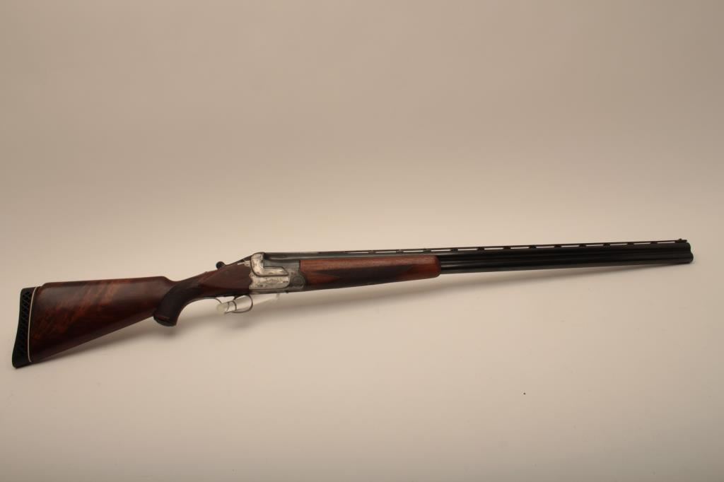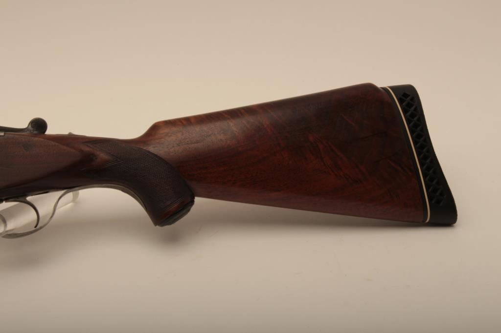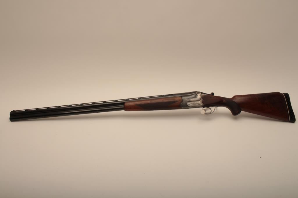 German O/U shotgun, 12 gauge, 32” ventilated rib barrels marked “Christoph Funk”, single trigger, blued barrels, engraved receiver, checkered wood stocks with flame graining to butt stock and added Pachmayr hard rubber butt pad, S/N 35997; overall very good + condition with crisp actions, tasteful engraving, near fine bores; wood is overall very good with two old wood strength pegs added to wrist. (Modern/NO PPT). Est.: $900-$1,800.