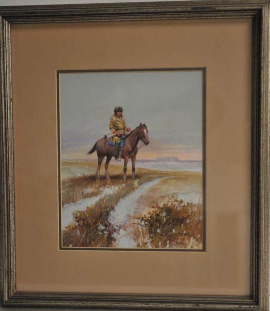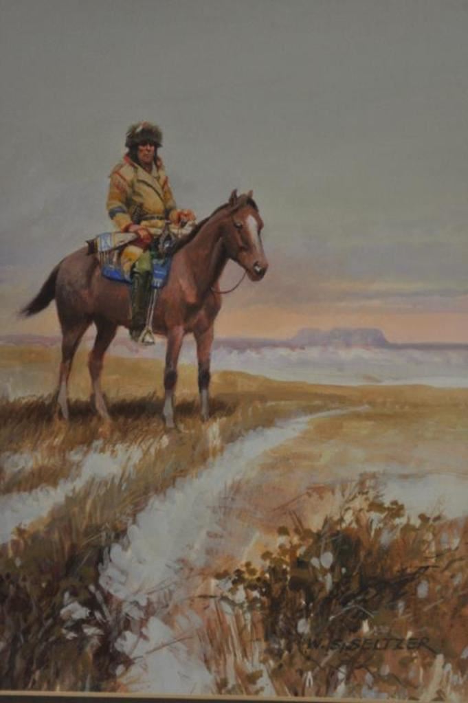 Framed and matted work by W. S. Seltzer of Montana (Grandson of O.C. Seltzer) depicting an American Indian on horseback in the winter acting as a “Sentinel”; beautiful colors and detail; approximately 19” x 17” overall. Est.: $1,500-$3,000.