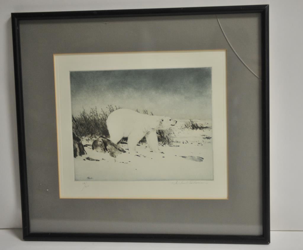 Framed and matted limited edition colored etching of Polar Bear (18/25) by noted Western and Wildlife artist Michael Coleman; approximately 16” x 17.5” overall; crack to glass upper right hand corner. Est.: $400-$800.