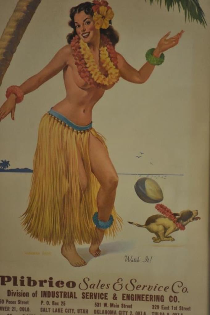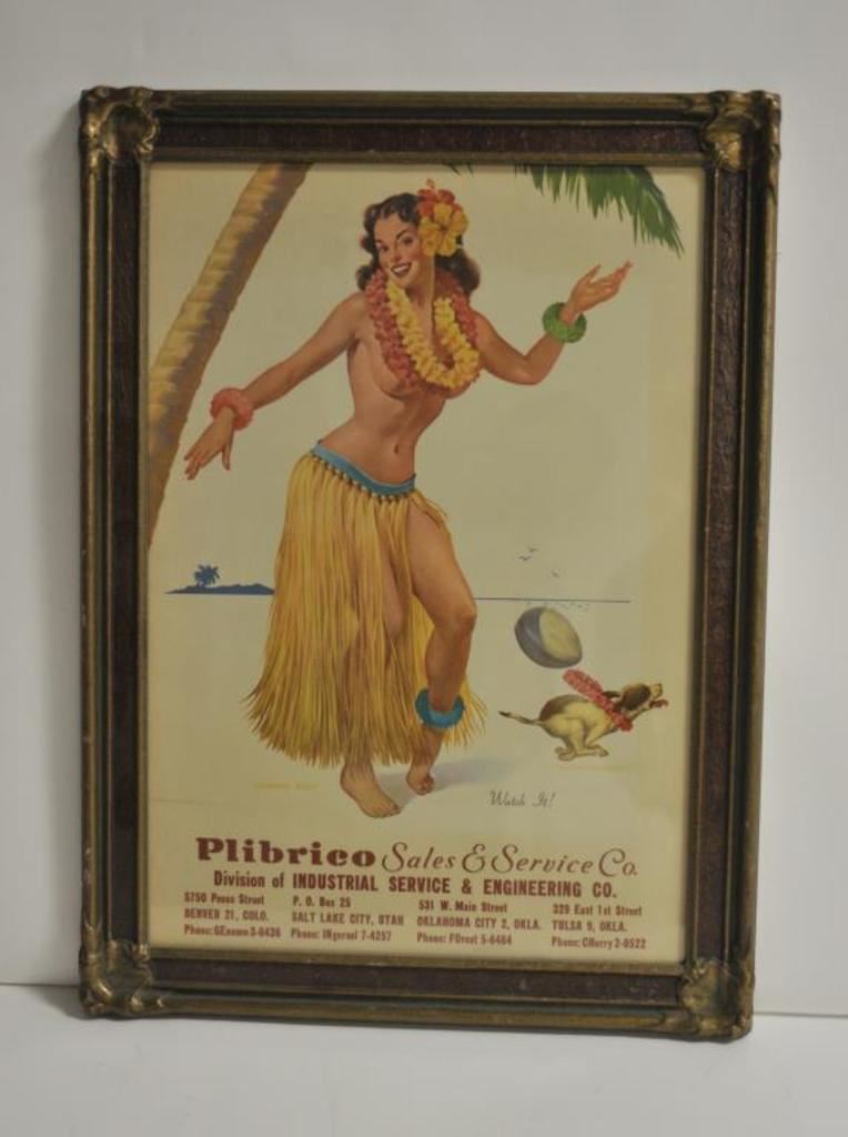 Framed vintage advertiser of hula girl entitled “Watch it!” by Baughan Bass; ca. 1940’s. Est.: $150-$300.