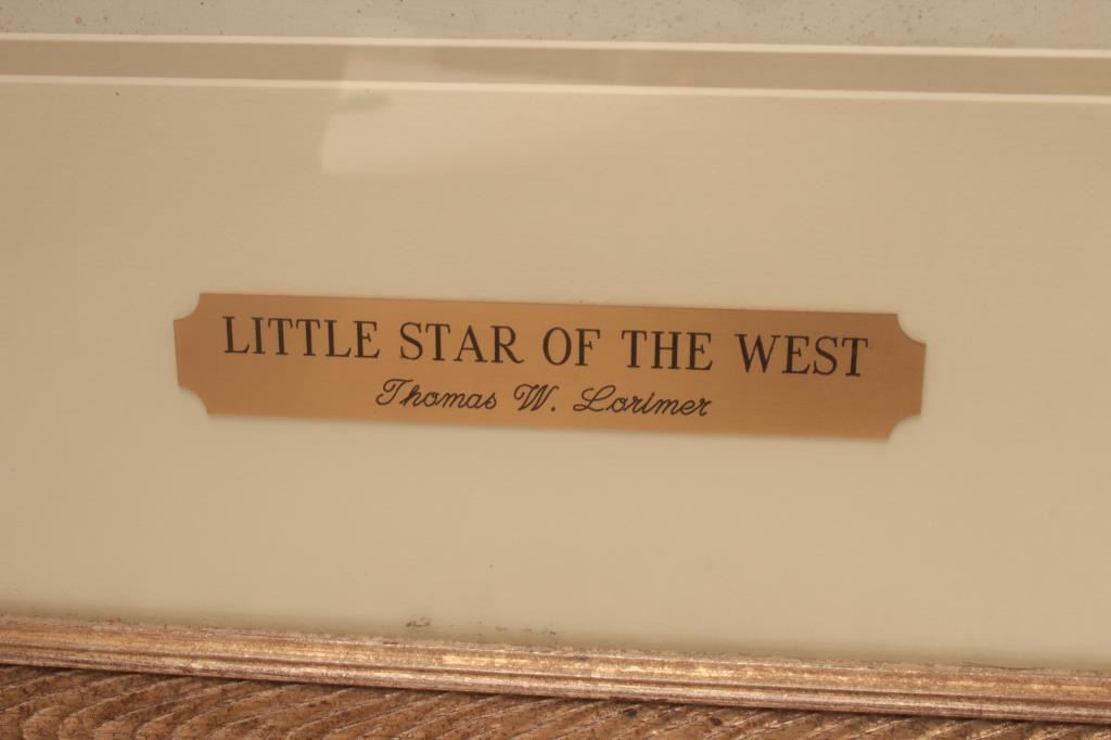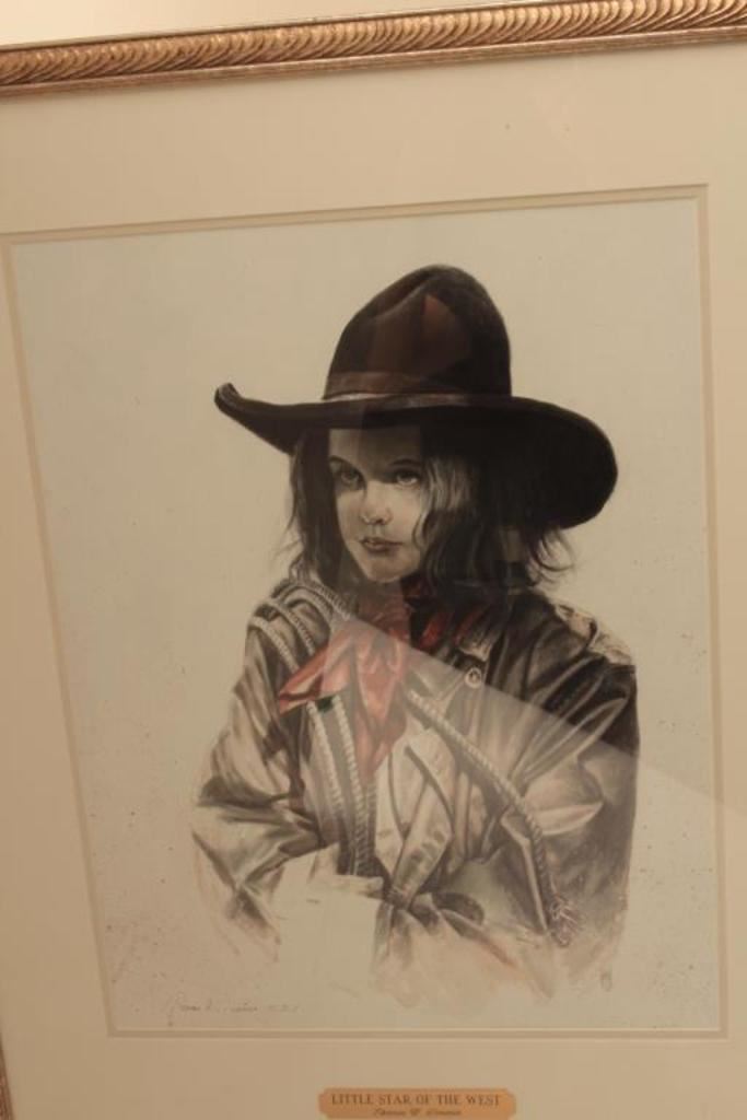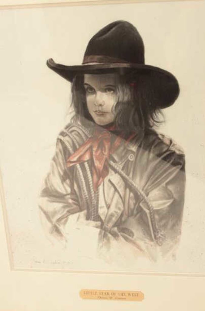 Framed and matted work by Thomas Lorimer entitled “Little Star of the West” showing a determined cowgirl with rope thrown over her shoulder and black Montana Peak cowgirl hat; approximately 27” x 22” overall. Est.: $500-$1,000.
