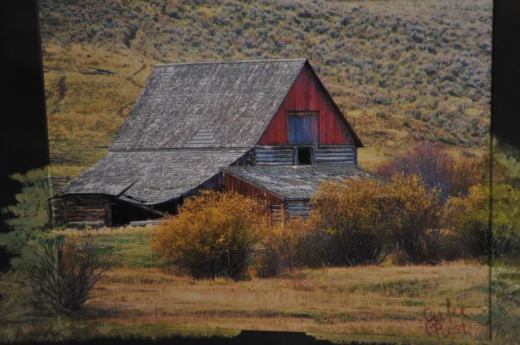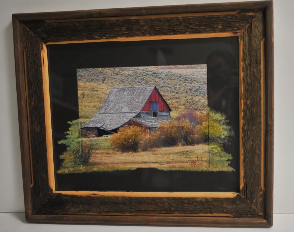 Barnwood framed mixed media painting of a classic old barn by Jerlee Pastione; approximately 22.5” x 26” overall; beautifully accomplished. Est.: $500-$1,000.