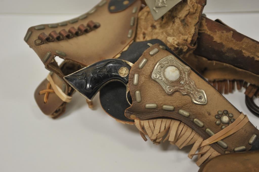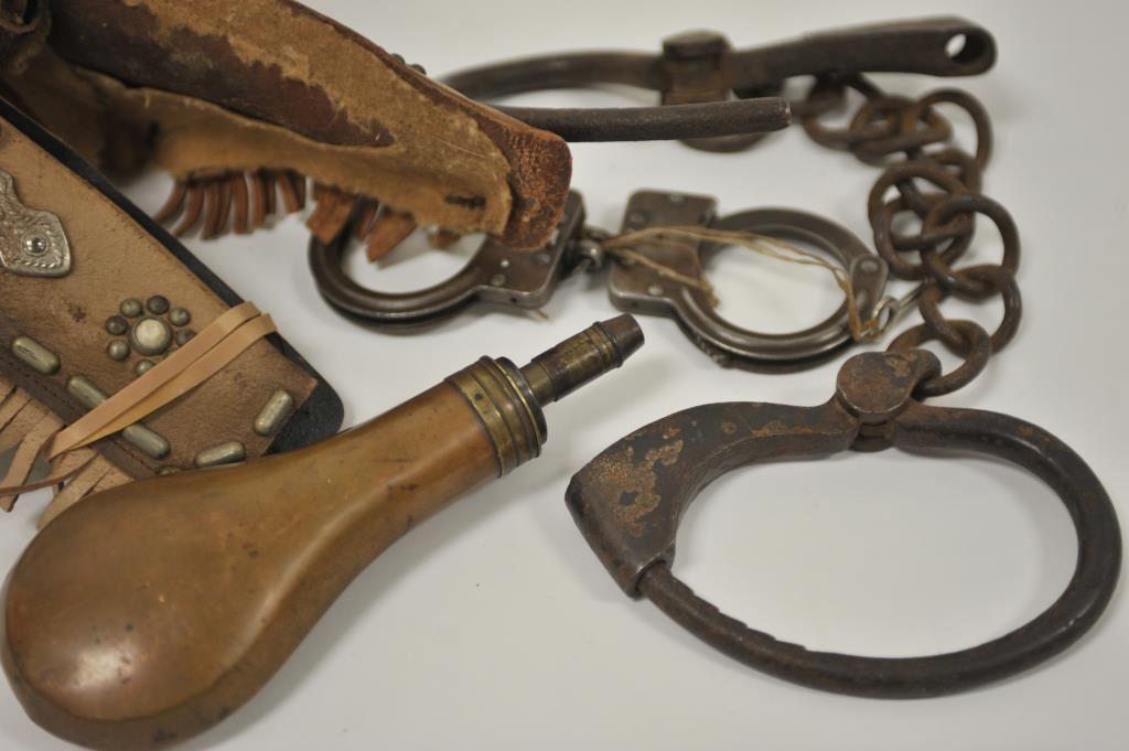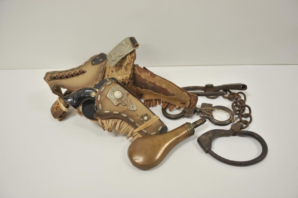 Lot of misc. collectibles including a pair of Texan, Jr. medal cap guns in shape of SAA revolvers with holsters and cartridge belt, a brass shotgun powder flask, a pair of unmarked handcuffs with key and a relic pair of old leg irons. Est.: $150-$300.