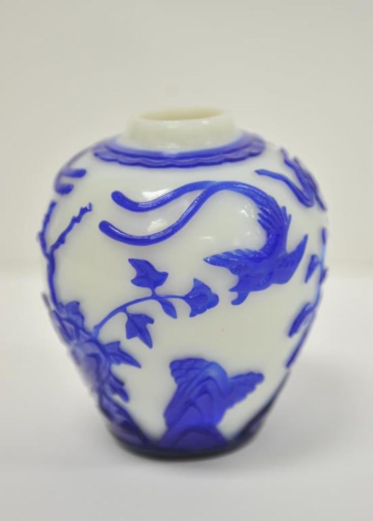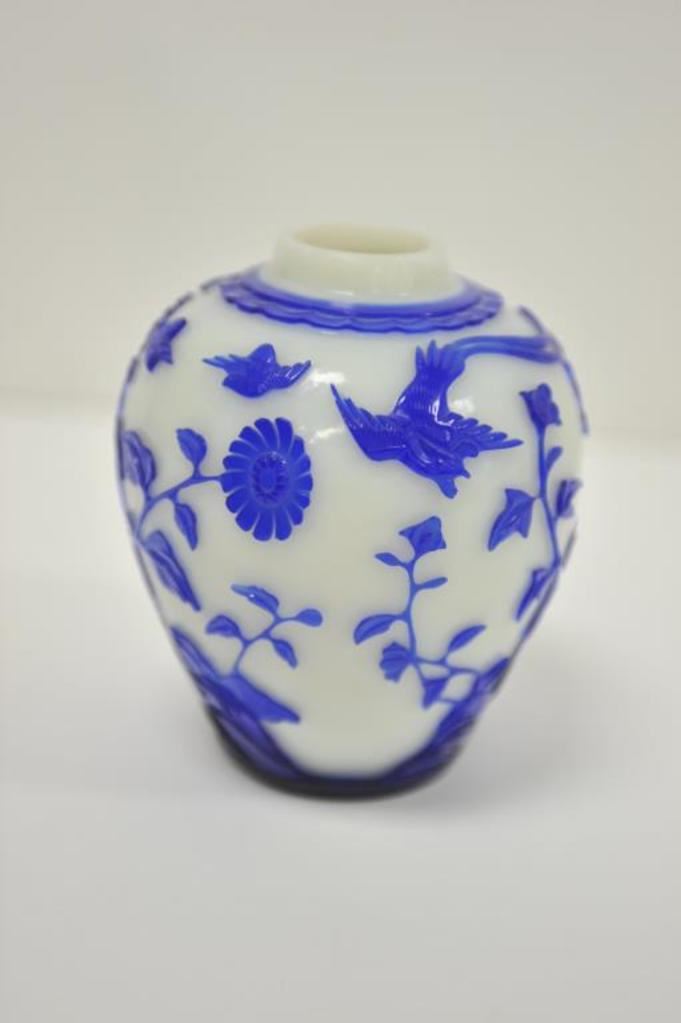 Peking glass blue on white vase; approximately 6” in height, 100 years old or older; estate piece; very good condition. Est.: $750-$1,500.