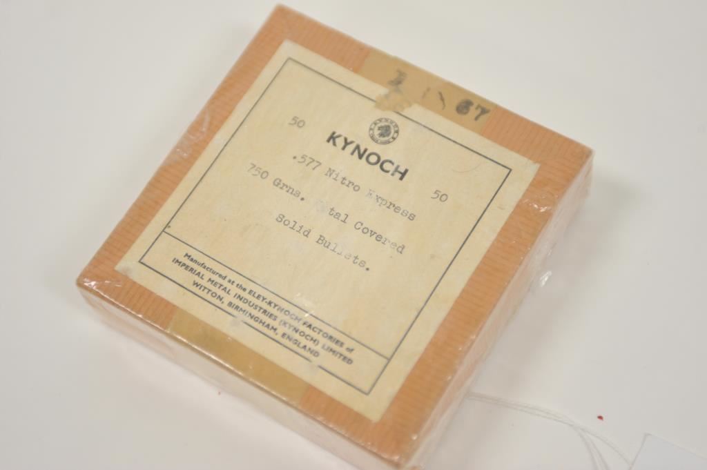 Box of 50 Kynoch .577 Nitro Express 750 Grns solid bullets only. Est.: $150-$300.