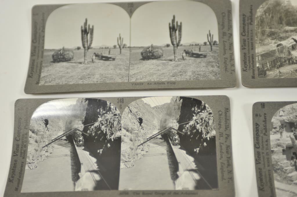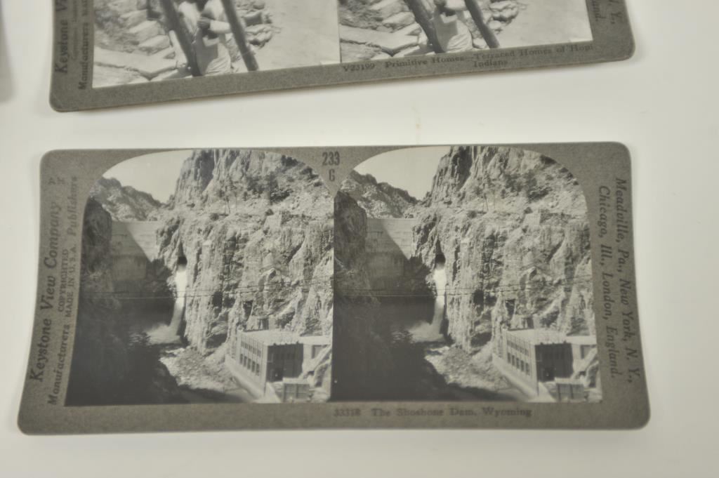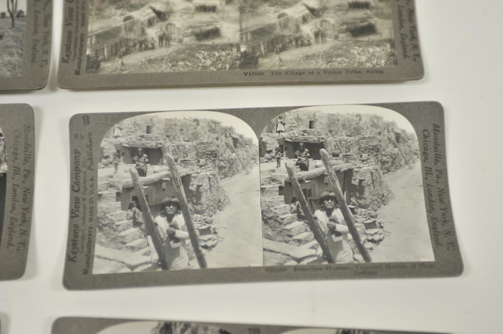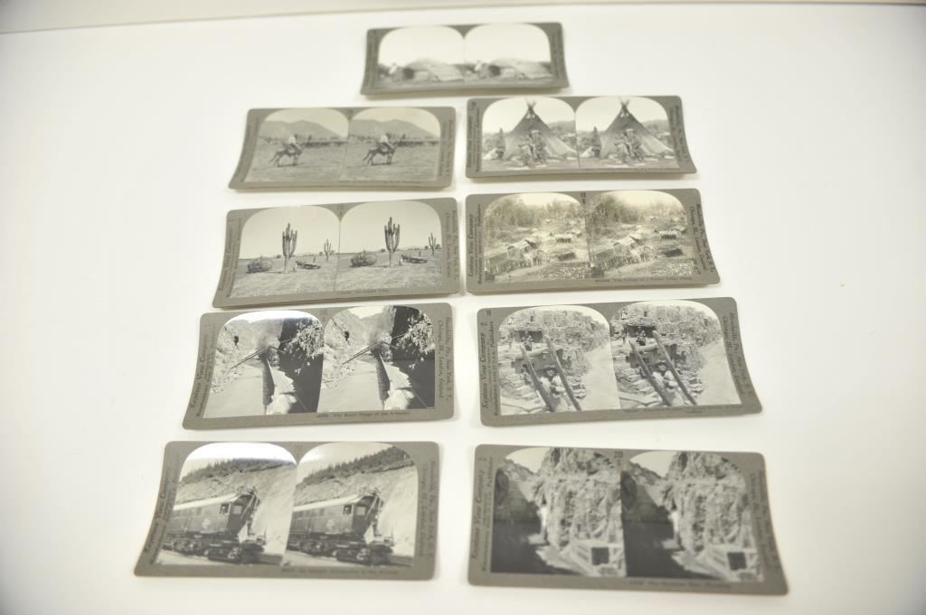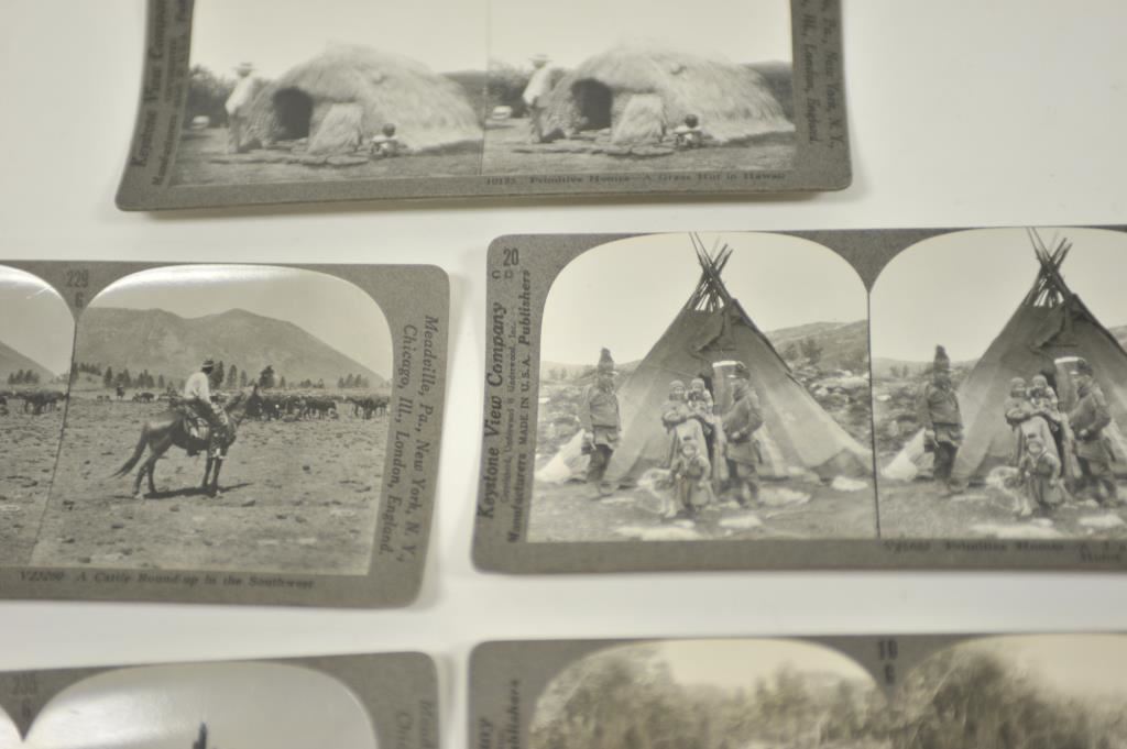 Lot of 9 Stereoptic cards including American Indian scenes, Western theme scenes, Hawaii and Africa scenes. Est.: $150-$300.
