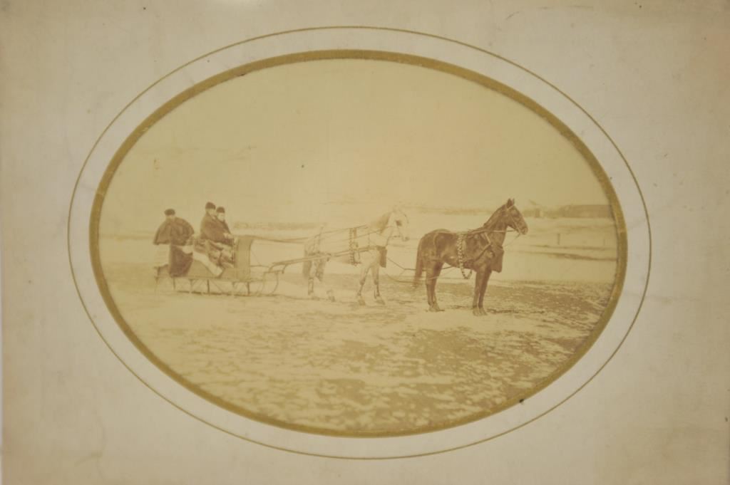 Two original cabinet photos from the Frost Custer Album Collection (Lot 7087 of Butterfield’s catalog of 3/27/02; one showing Tom Custer, Nellie Wadsworth and W.W. Cooke in horse drawn sleigh; the other an unpublished photo showing George A. Custer, Libbie Boston Custer, Tom Custer and Maggie Calhoun in a horse drawn sled. Est.: $1,500-$3,000.