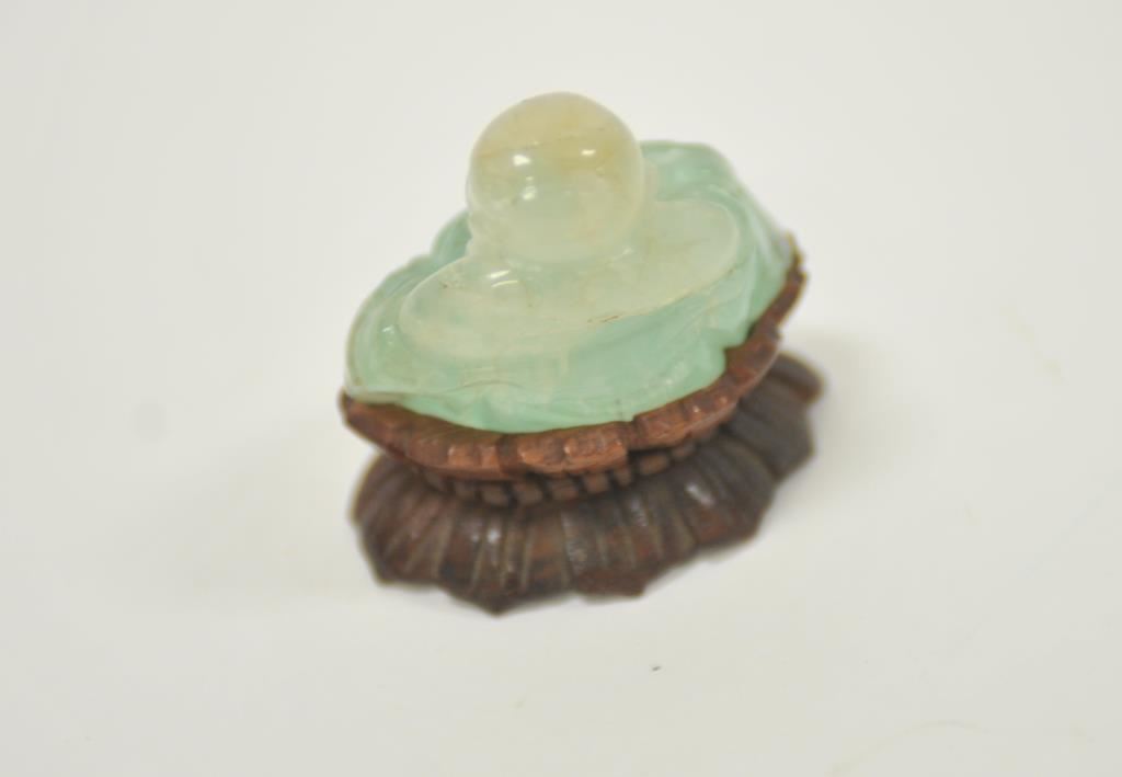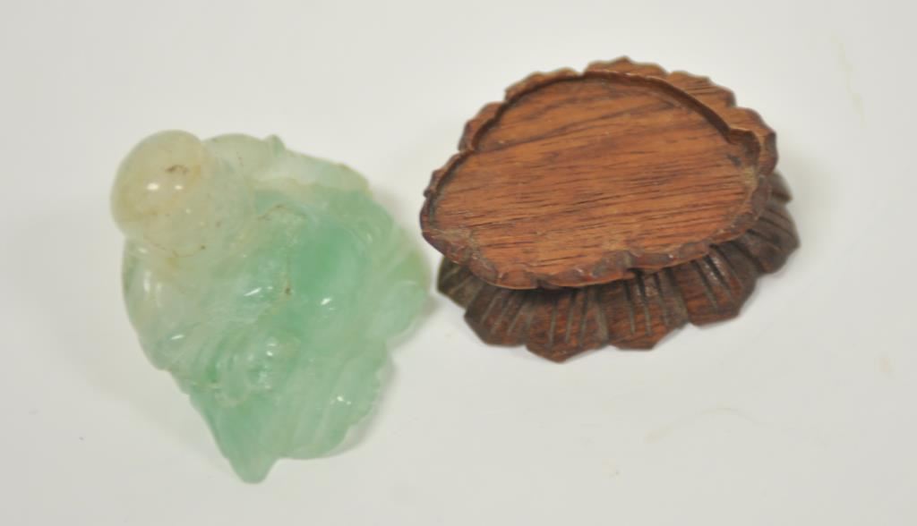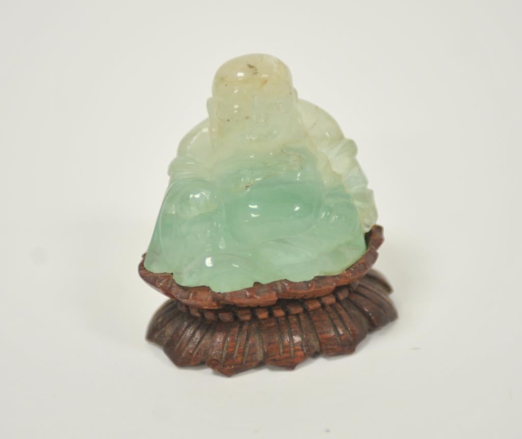 Small jade Buddha with wood stand; approximately 1.75” tall and nicely detailed. Est.: $100-$200.