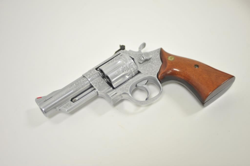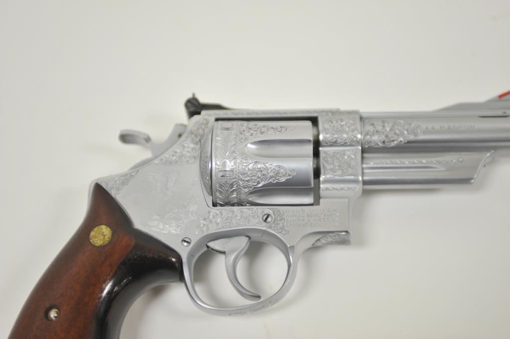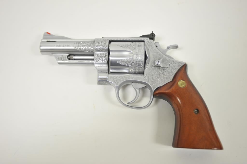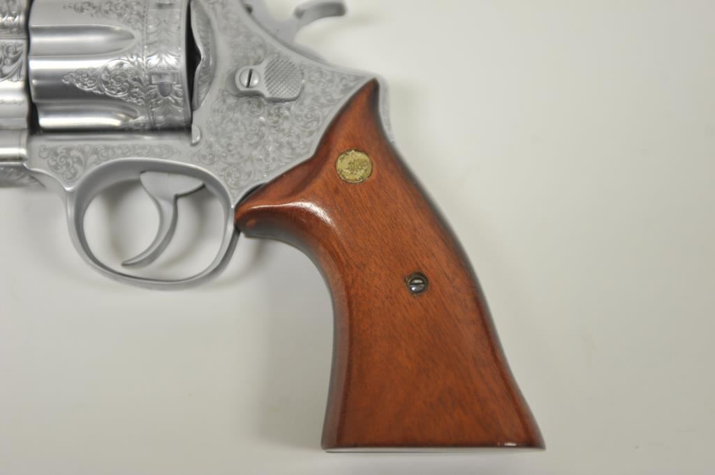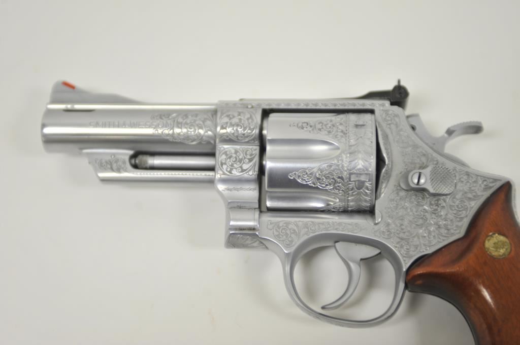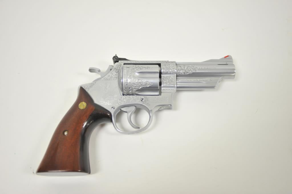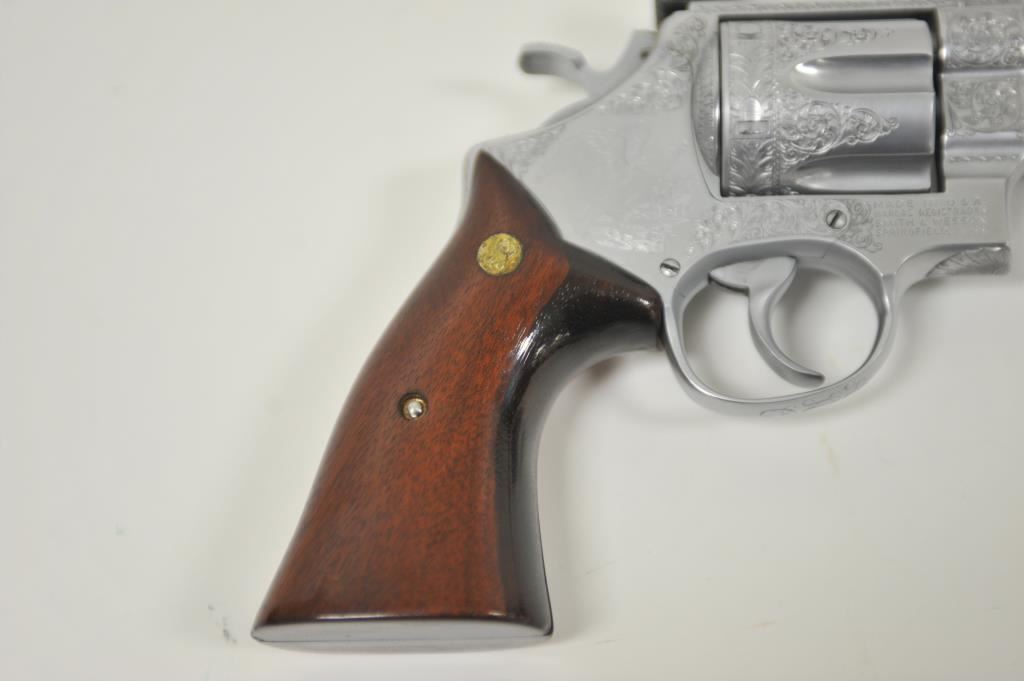 Smith & Wesson Model 29-2 DA revolver, custom engraved and specially alloy-plated per consignor to make impervious to erosion, etc.; .44 Magnum caliber, 4” ported barrel, smooth wood medallion combat grips, S/N N307954; overall fine to excellent condition showing little use or handling; finely accomplished scroll engraving with panel scene of eagle on right rear side of frame and initials “AHC” on bottom of trigger guard; accompanied by a factory wood presentation case. (Modern/NO CAL. SALE). Est.: $1,500-$3,000.