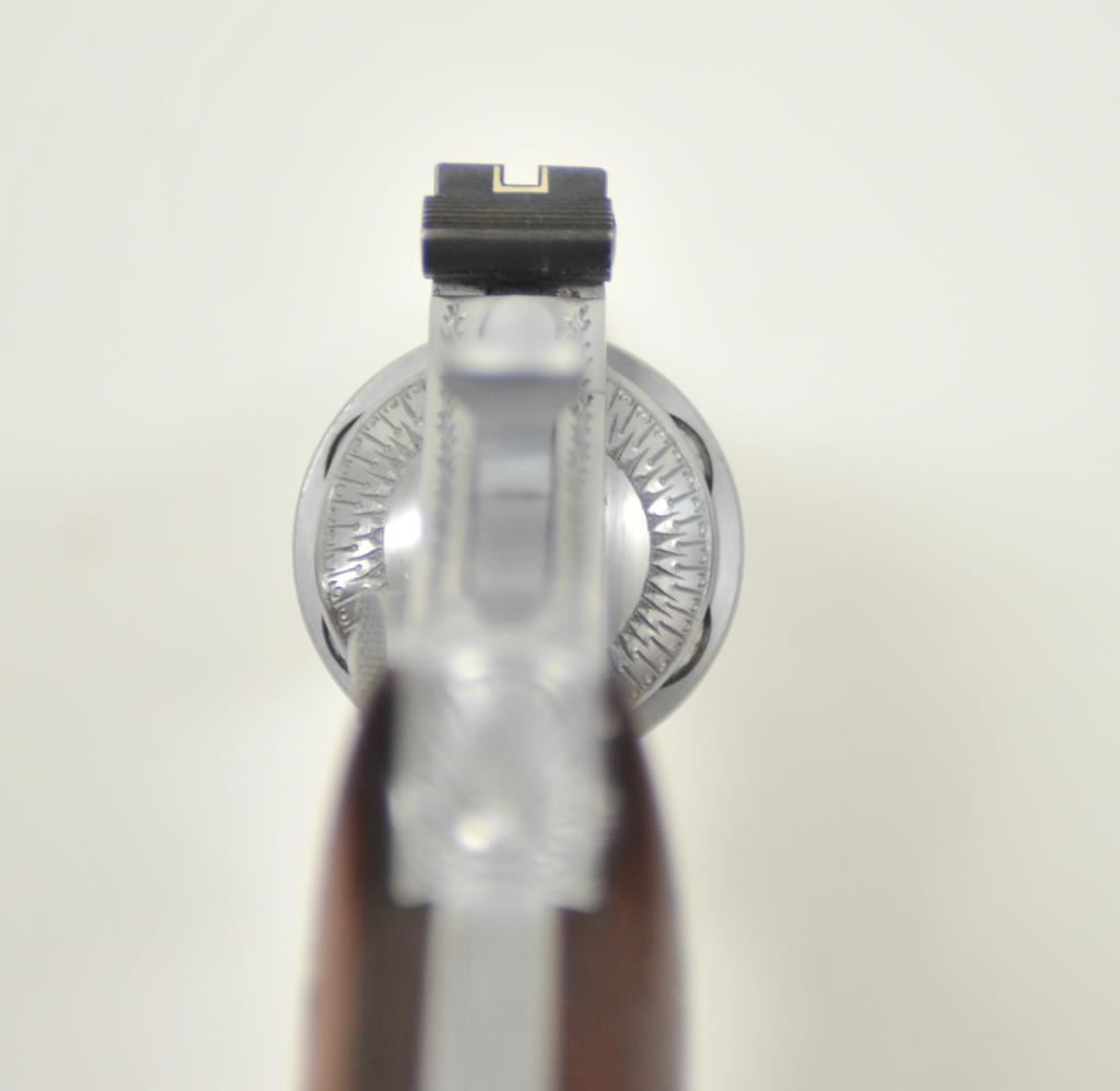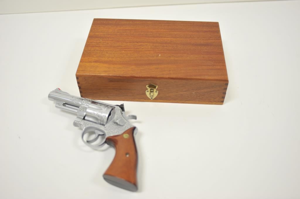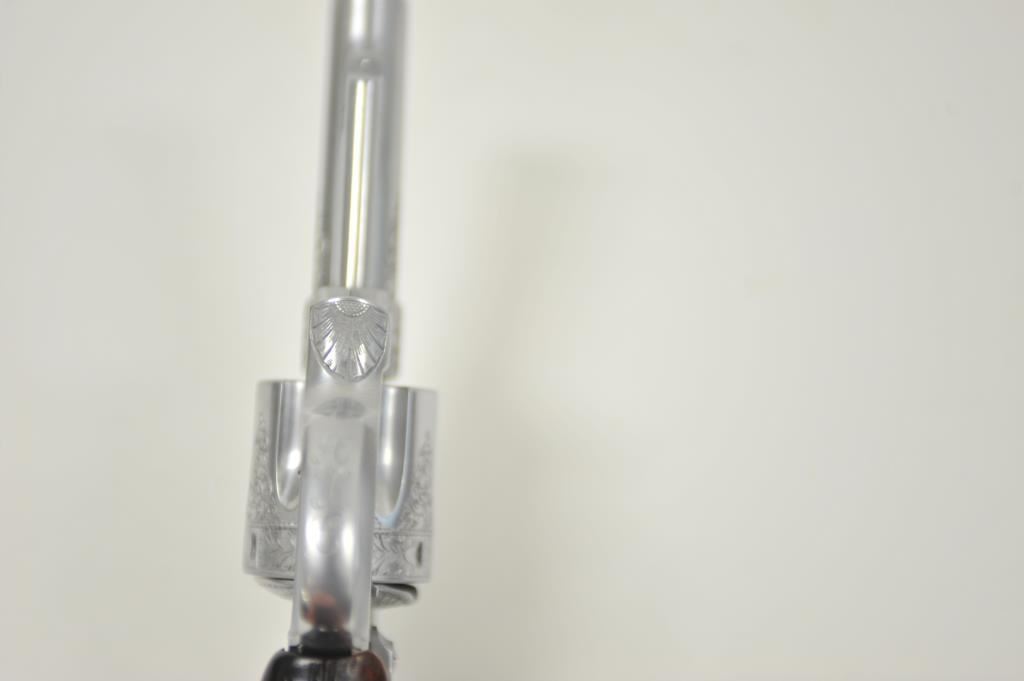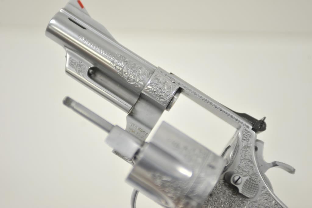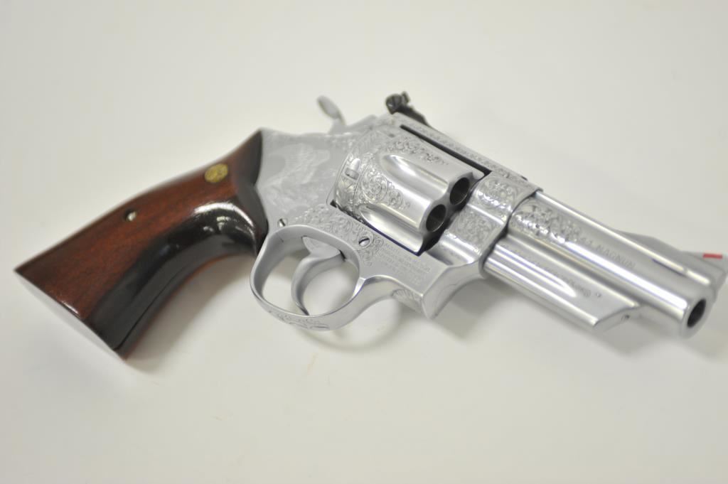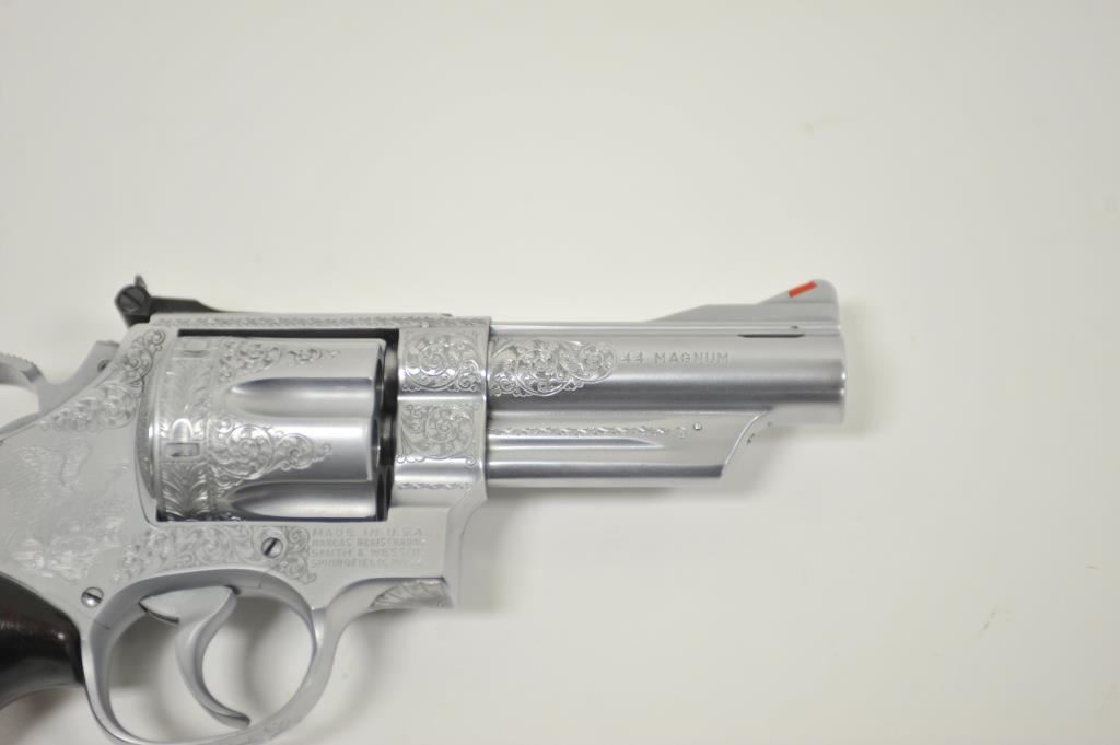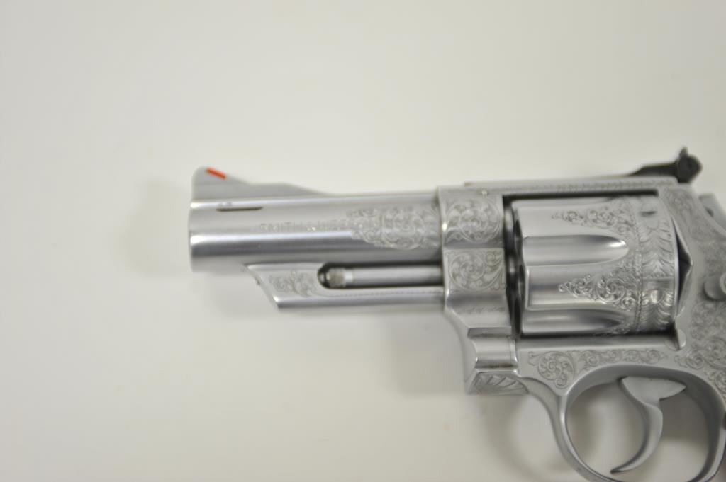 Smith & Wesson Model 29-2 DA revolver, custom engraved and specially alloy-plated per consignor to make impervious to erosion, etc.; .44 Magnum caliber, 4” ported barrel, smooth wood medallion combat grips, S/N N307954; overall fine to excellent condition showing little use or handling; finely accomplished scroll engraving with panel scene of eagle on right rear side of frame and initials “AHC” on bottom of trigger guard; accompanied by a factory wood presentation case. (Modern/NO CAL. SALE). Est.: $1,500-$3,000.