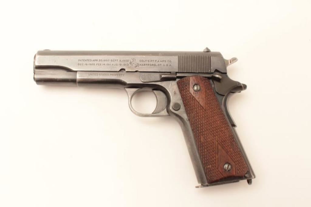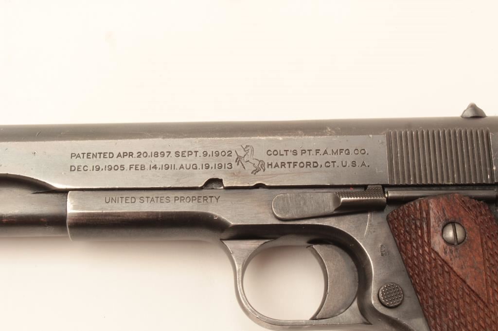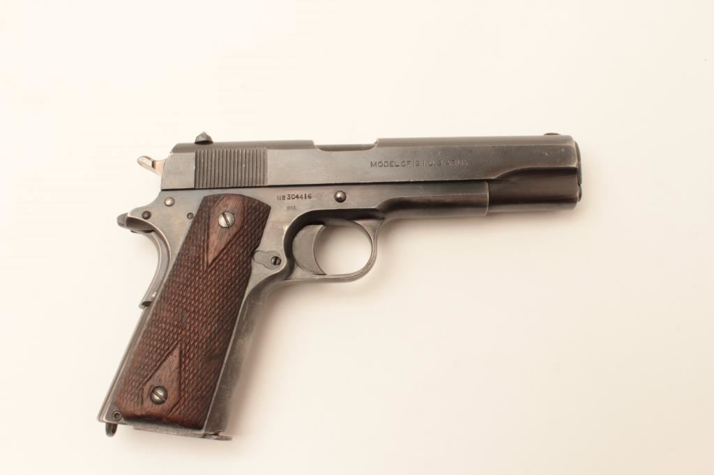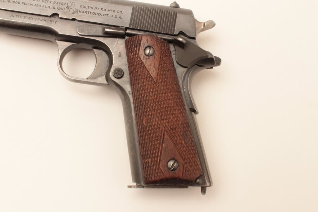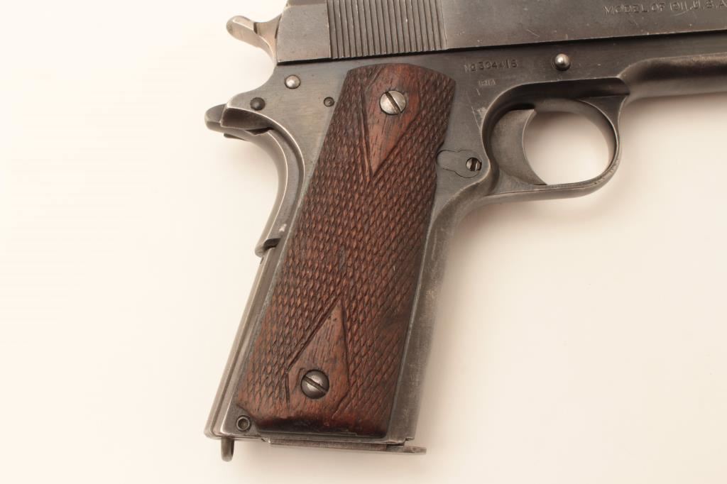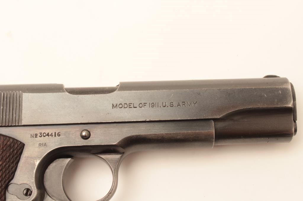 U.S. Property marked Colt Model 1911 semi-automatic pistol, .45 caliber, 5” barrel, “Black Army” finish, two tone magazine, checkered wood grips, S/N 304416, R.I.A. marked (Rock Island Arsenal); overall very good to fine condition with majority of original military finish, some high point and muzzle wear, near fine bore, crisp action, sharp markings and near fine grips. (C&R/NO PPT). Est.: $2,000-$4,000.