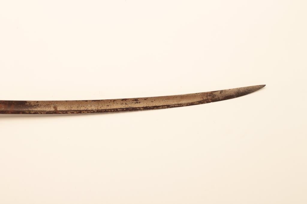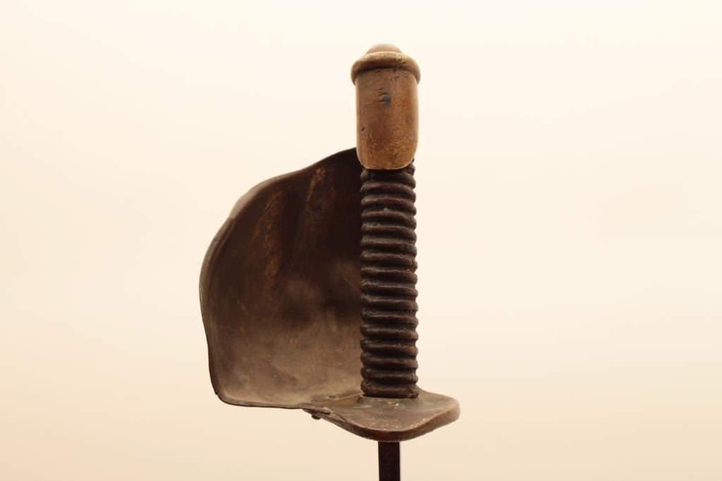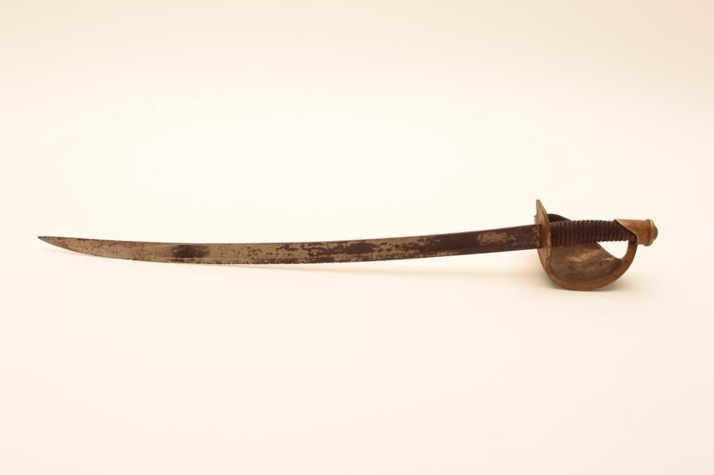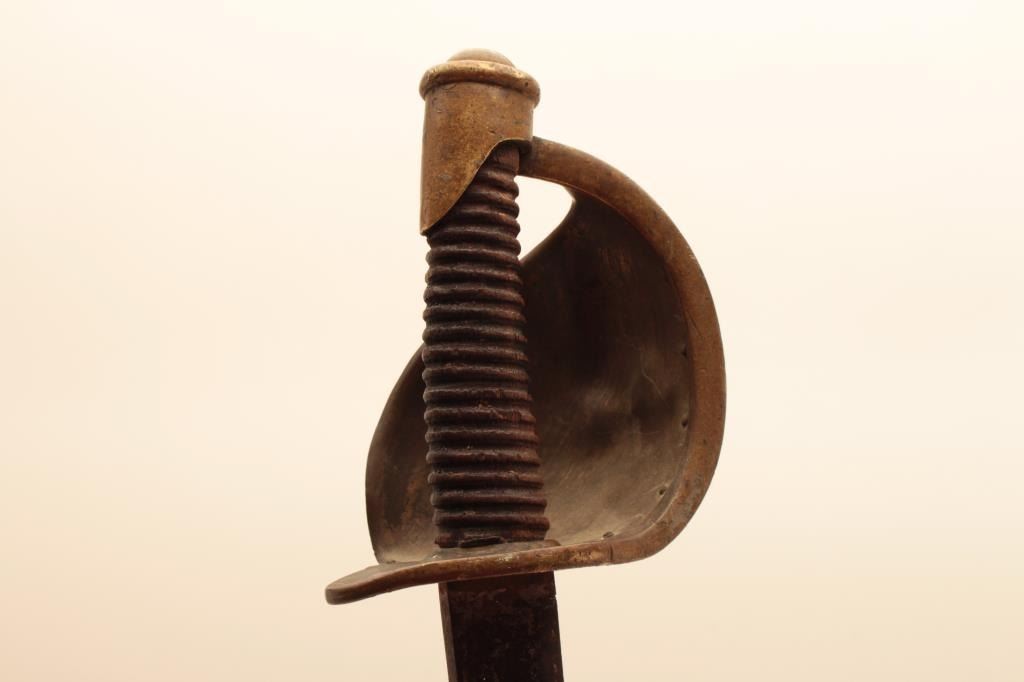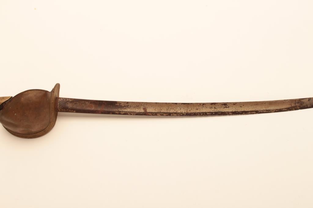 U.S. Naval cutless marked “U.S.N 1862” and inspected. The blade shows nickel plate. Patina to brass with dents in the guard. Fair to good overall. Est.: $300-$600