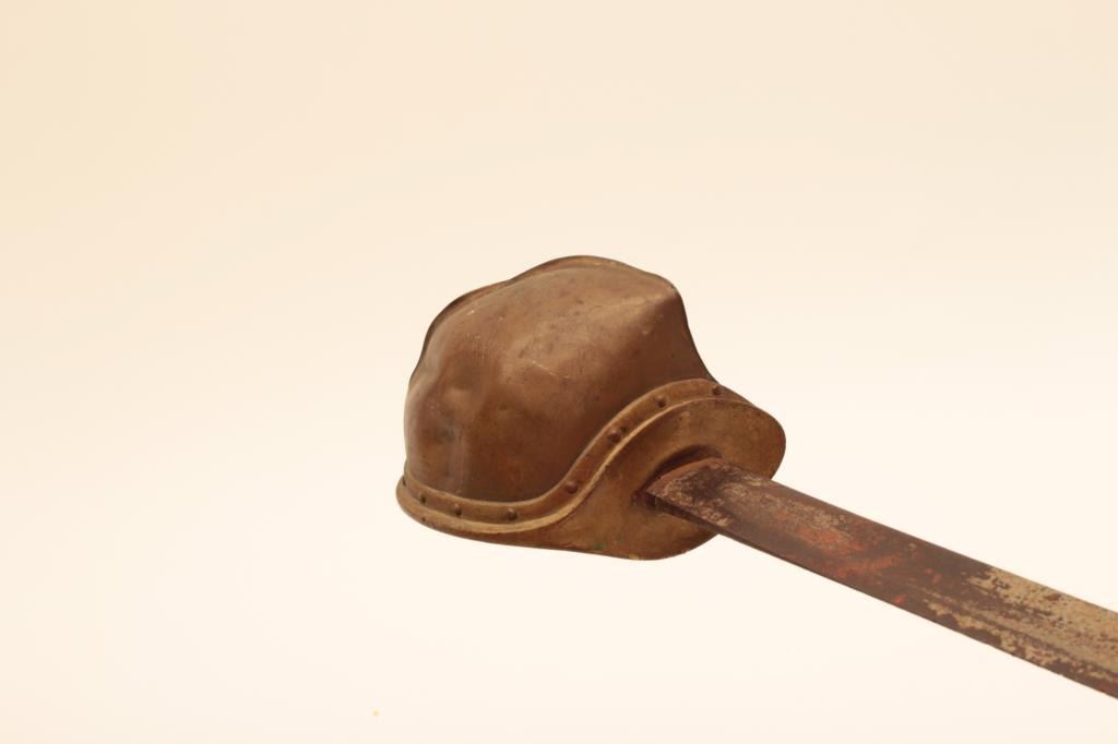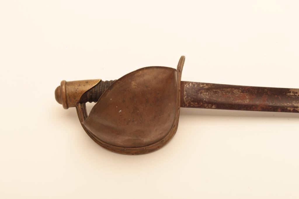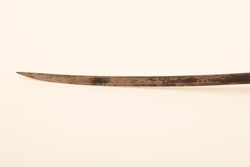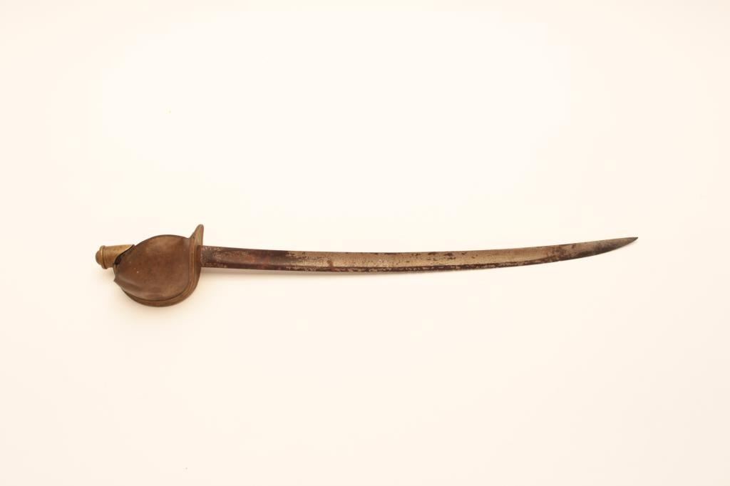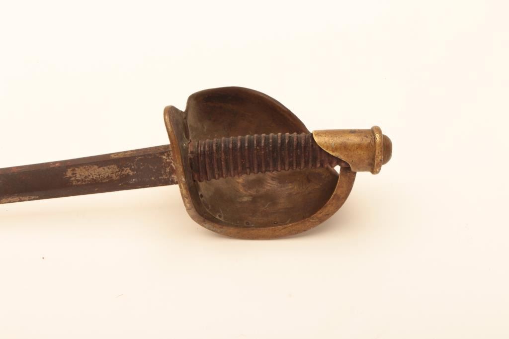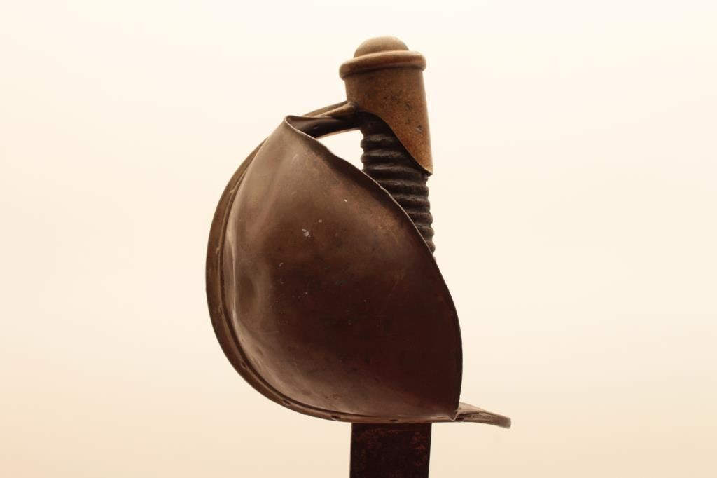 U.S. Naval cutless marked “U.S.N 1862” and inspected. The blade shows nickel plate. Patina to brass with dents in the guard. Fair to good overall. Est.: $300-$600