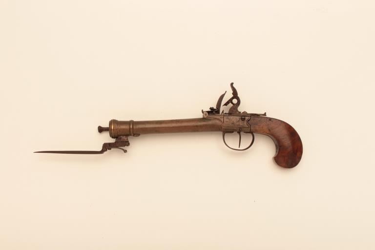Continental blunderbuss pistol with snap bayonet circa late 18th to early 19th century. Measures approximately 6 ½” cannon barrel flared to 80 plus caliber at the muzzle with rings and under mounted springbayonet. Missing top jaw and screw. Old oversize ram rod. Needs minor restoration and conservation. As found. Attic condition. (Antique) Est.: $1500-$3000