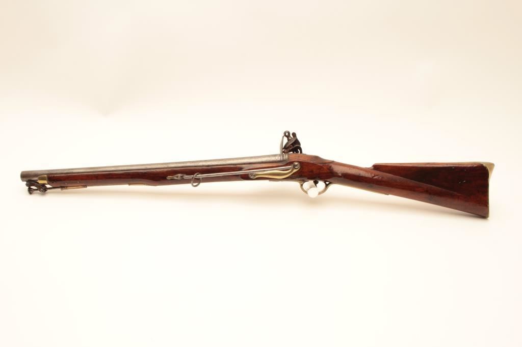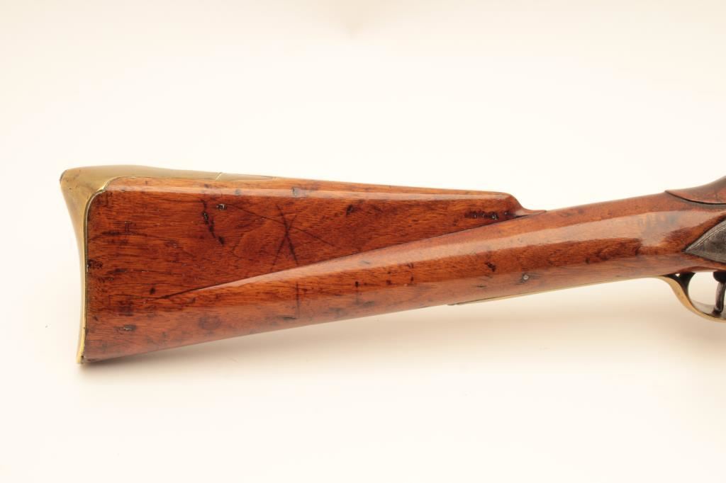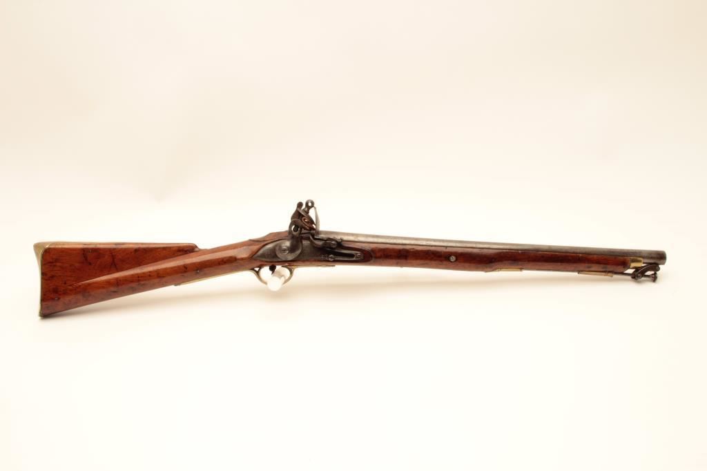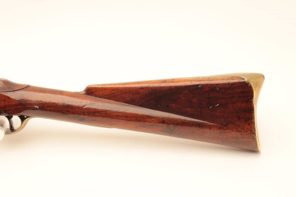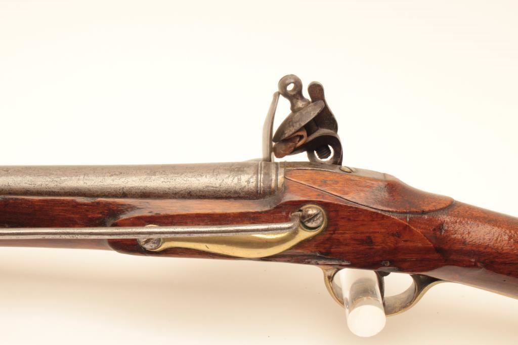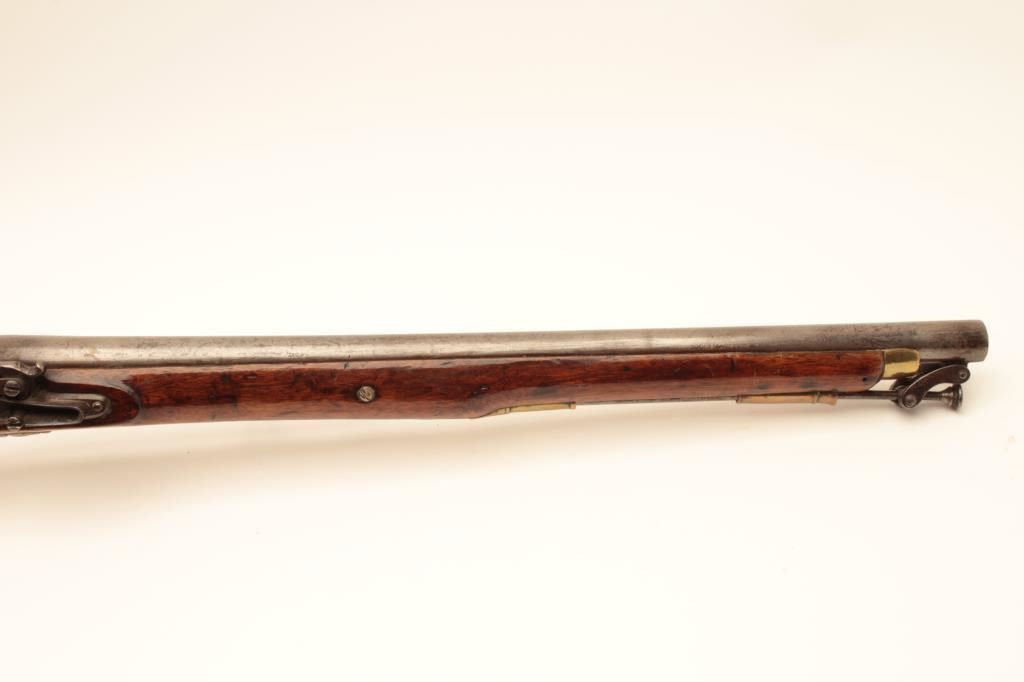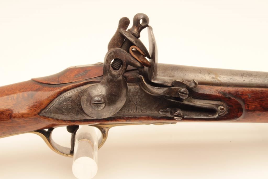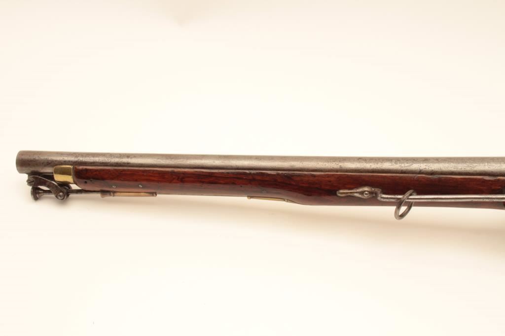 Flintlock musketoon of dragoon or cavalry style with sling swivel on long bar, attached ramrod, and lock marked “Porto 1802” with center of lock engraved with crown and initials (J.P.R.?) intertwined. Closely resembles British arms of Napoleonic era and we believe to be Portuguese. Measures 35” overall with a 20” barrel of .62 plus caliber smoothbore. The metal is good to very good with light minor aging and good markings. Correct flintlock parts. The stock is very good with light coating of clear varnish or shellac but no sanding. This must be a rare example as we have not viewed another in 50 years of selling antique arms. (Antique) Est.: $750-$1500