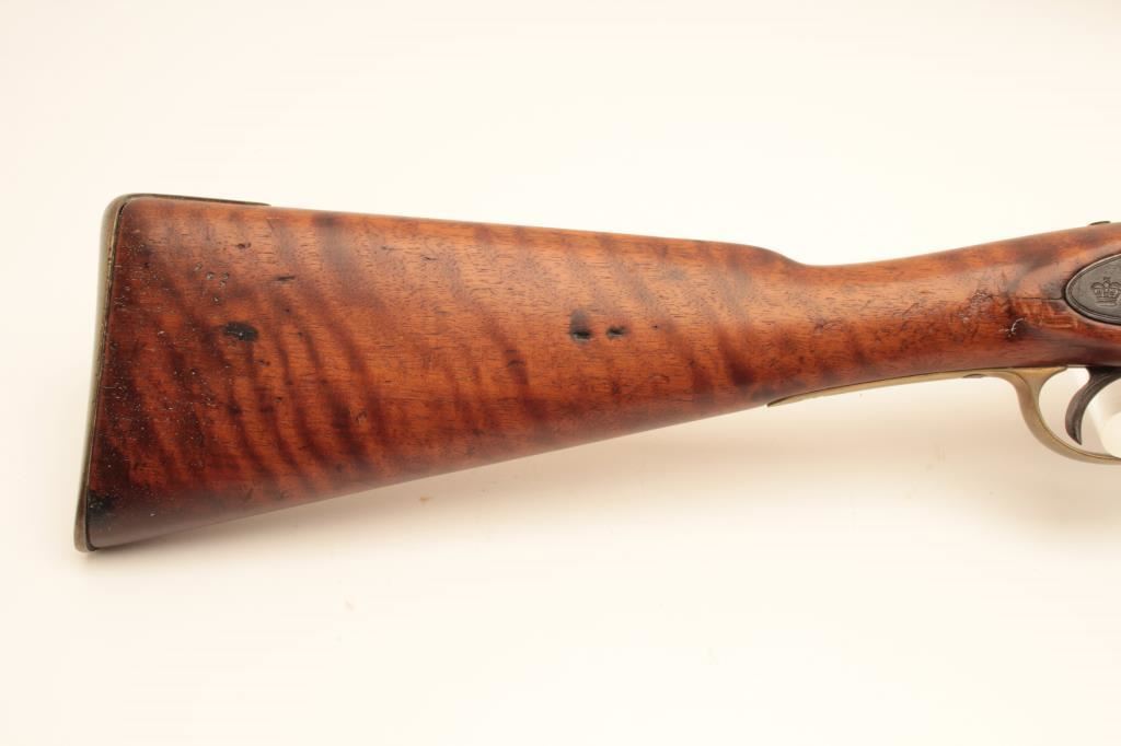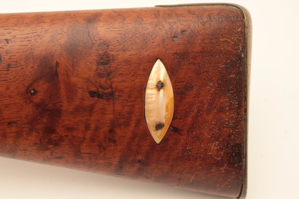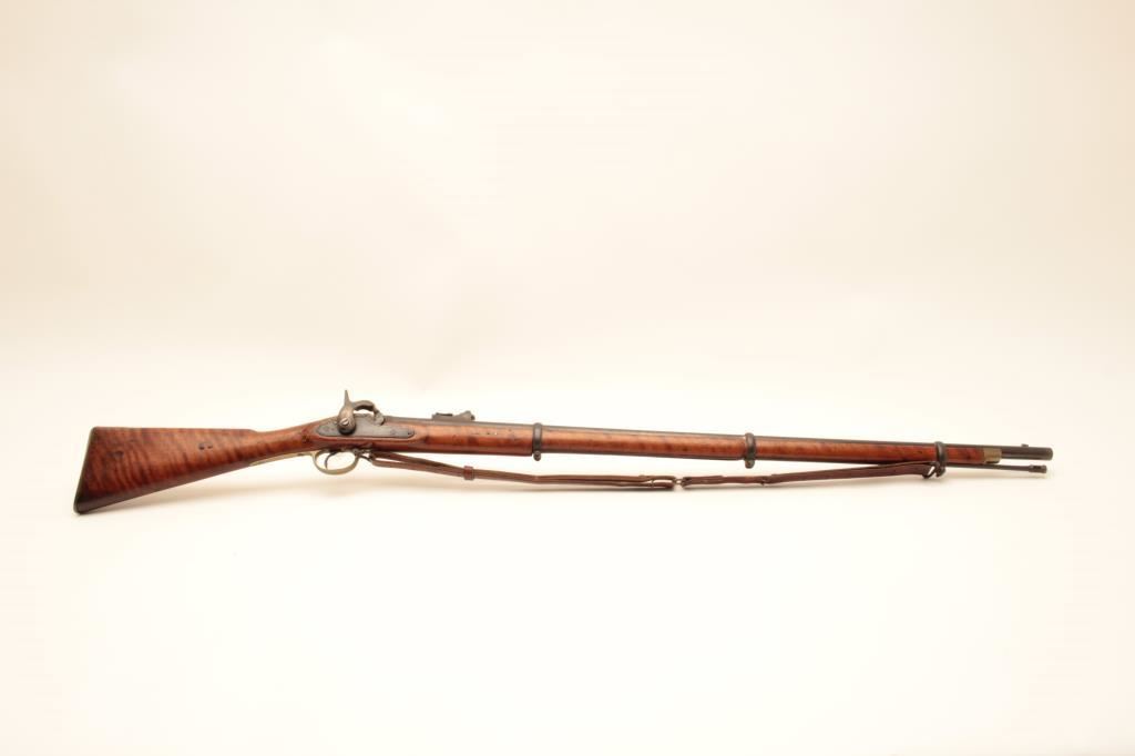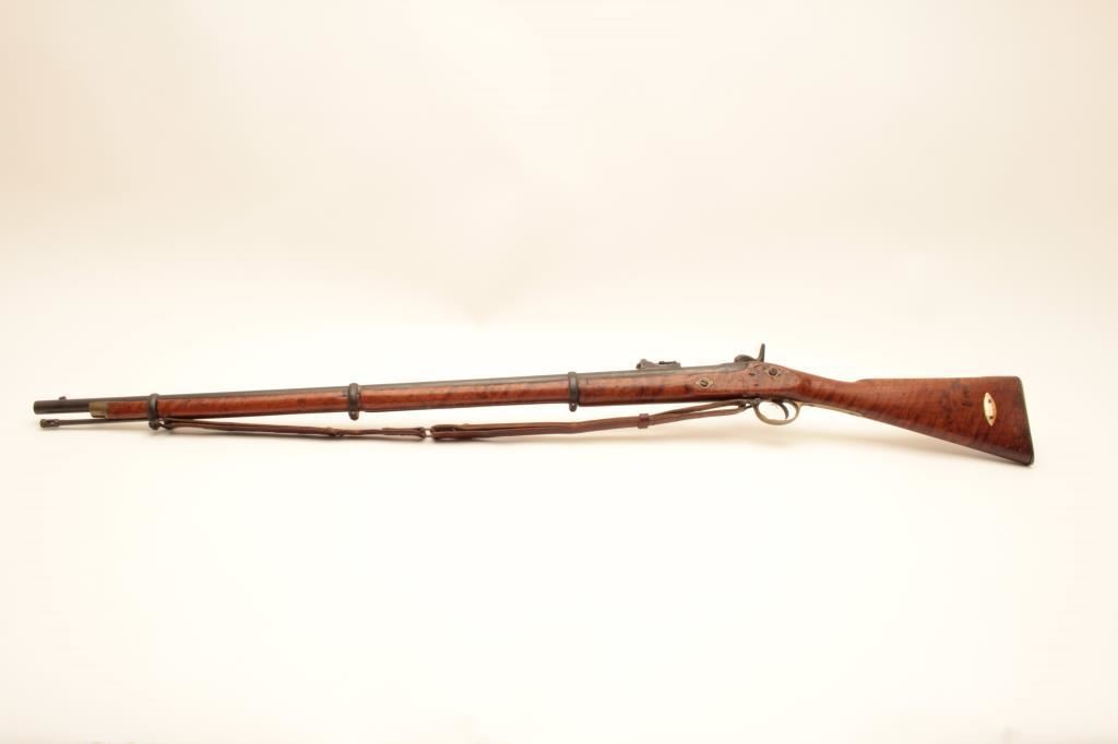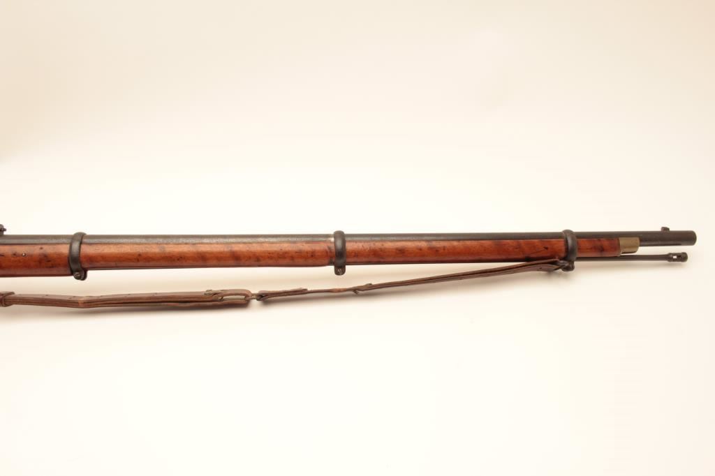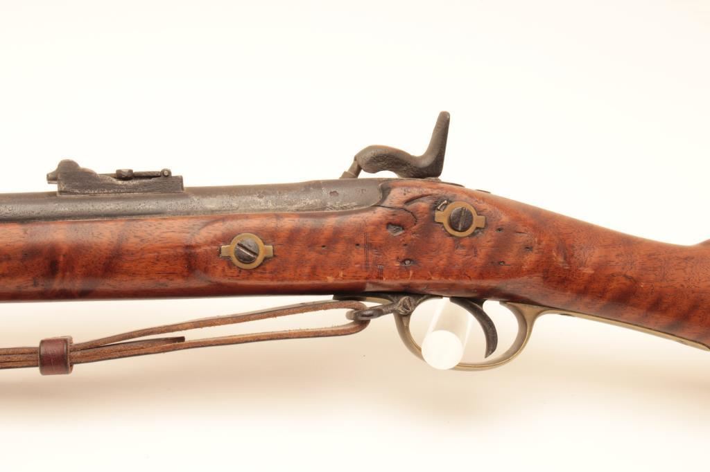 Interesting 1862 dated Tower 3 band percussion musket with battel associated U.S. Model 61 Musket hammer and nipple replaced. Old carved pearl inlay in butt stock. Light to moderate scattered pitting and erosion with dark almost black uncleaned patina. Original rod. Working with good wood showing no stamping or marks visible. Modern leather sling. The 62 date and period changed hammer indicate Civil War use. Bored to smooth. (Antique) Est.: $250-$500