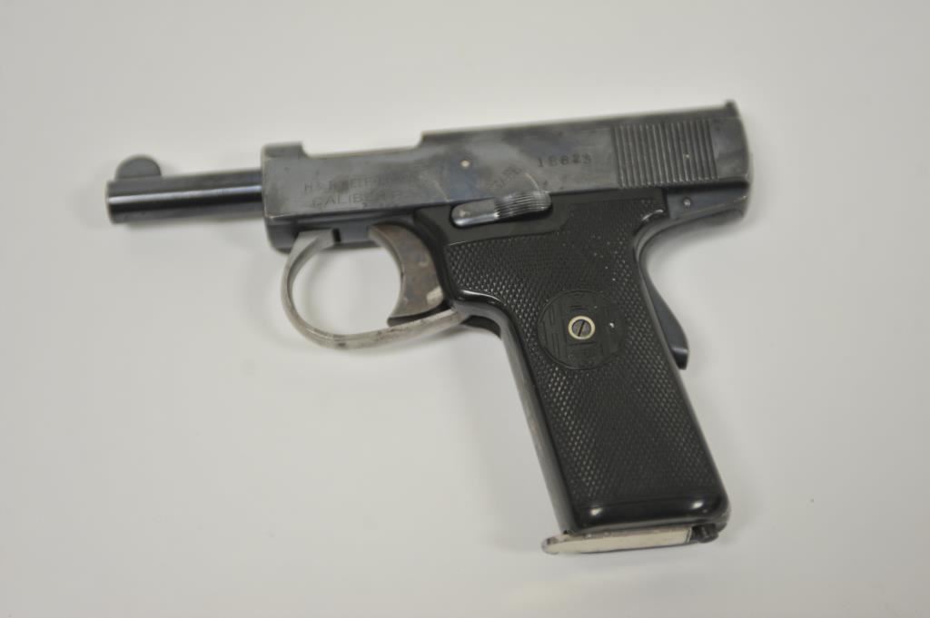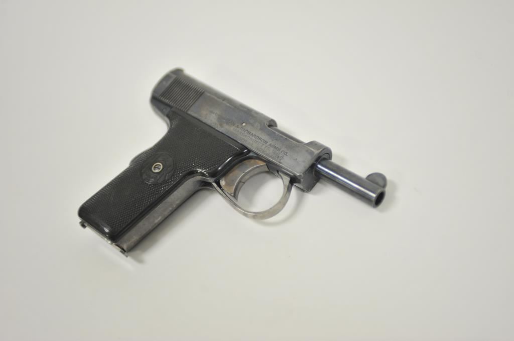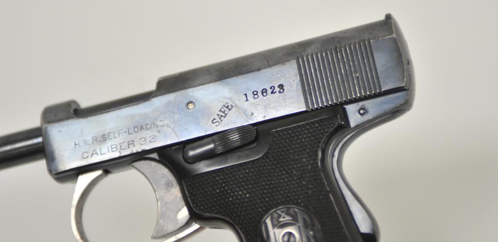 H & R Self-Loading Model semi-automatic pistol, .32 caliber, Serial #18623. The pistol is in very good overall condition with a 3 ½” barrel. The pistol retains the majority of its blue finish with small scratches and high point edge wear. The checkered plastic grips are in good condition showing moderate wear with sharp checkering. The lot includes one correct magazine. The bore is good, the action is crisp and markings are sharp. Est.: $400-$800. (C+R).