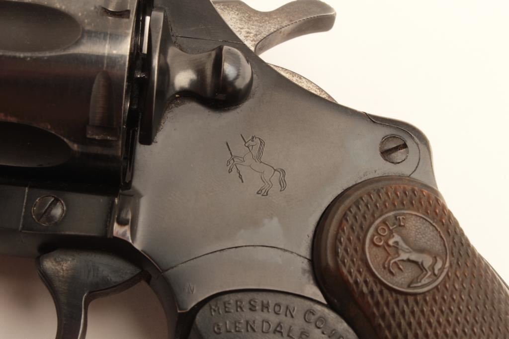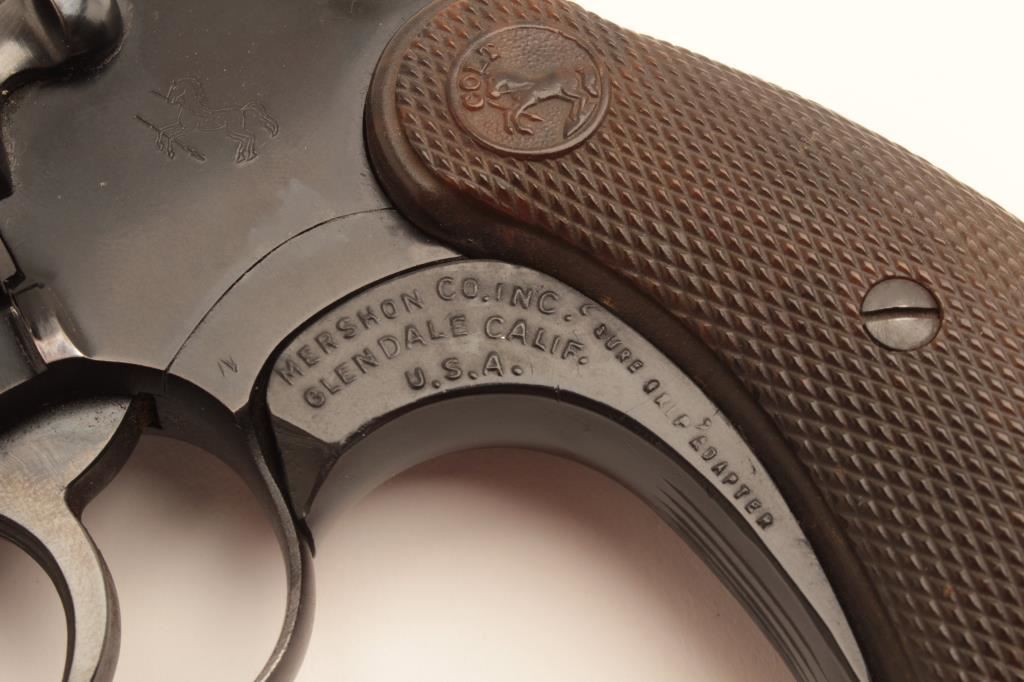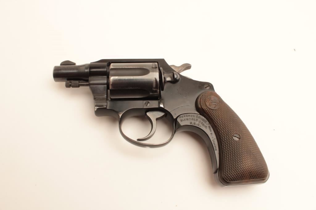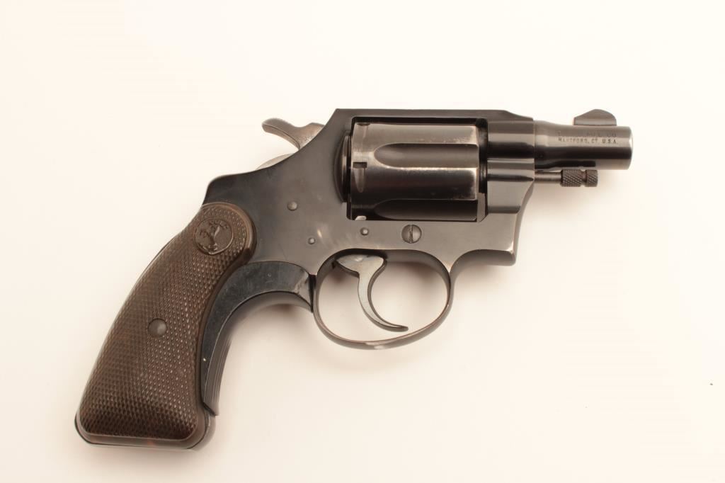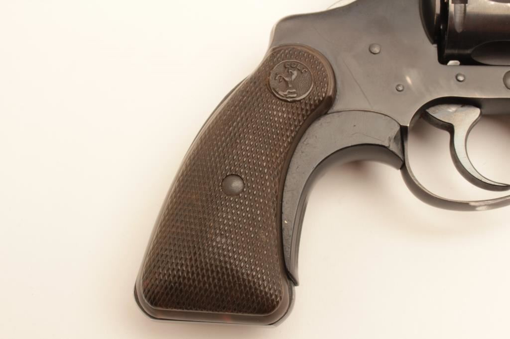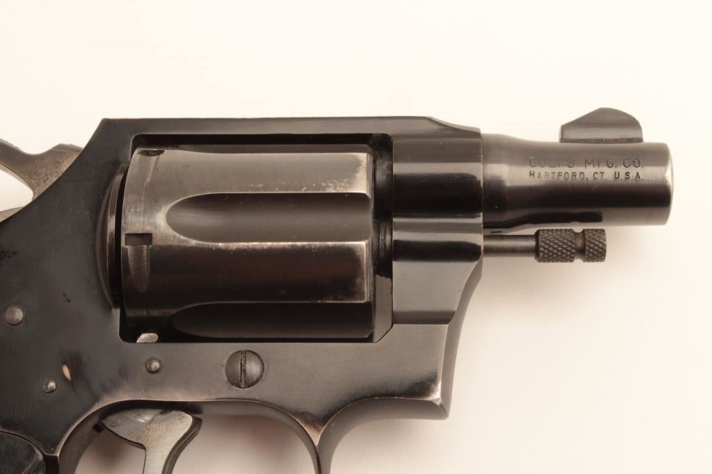 Colt Cobra revolver, .38 Special caliber, Serial #7488 LW. The pistol is in very good overall condition with a 2” barrel. The pistol retains the majority of its blue finish with holster wear at the muzzle and some loss of finish on the cylinder. The checkered plastic grips are in good condition showing light wear from carry and use and a grip shoe has been added during the period of use. The bore is good, the action is crisp and the markings are sharp on this desirable Colt. Est.: $600-$1,200. (C+R).