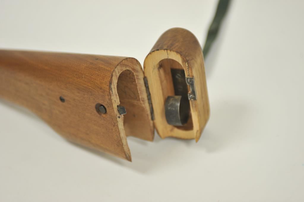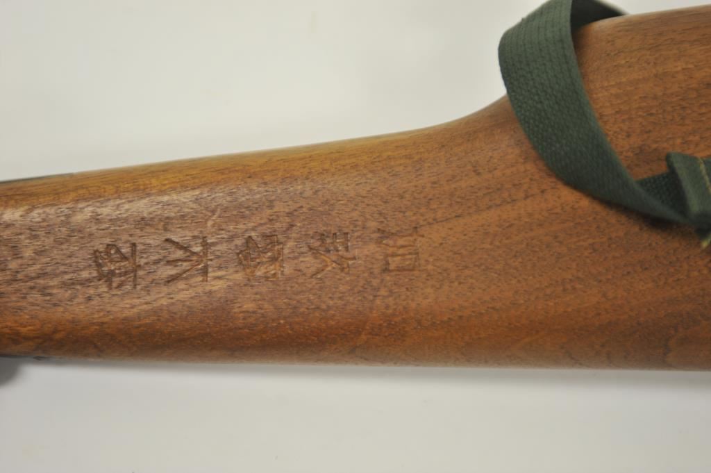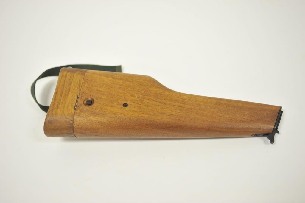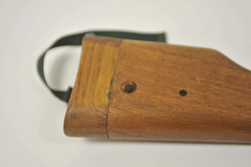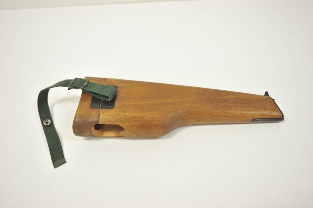 Wooden shoulder stock for a Chinese Hi-Power pistol. The stock is in very good overall condition showing moderate use with small mars and compressions. The left side of the stock is marked with Chinese characters at the wrist. The stock also has a green canvas strap attached to the lanyard loop. Est.: $200-$400.