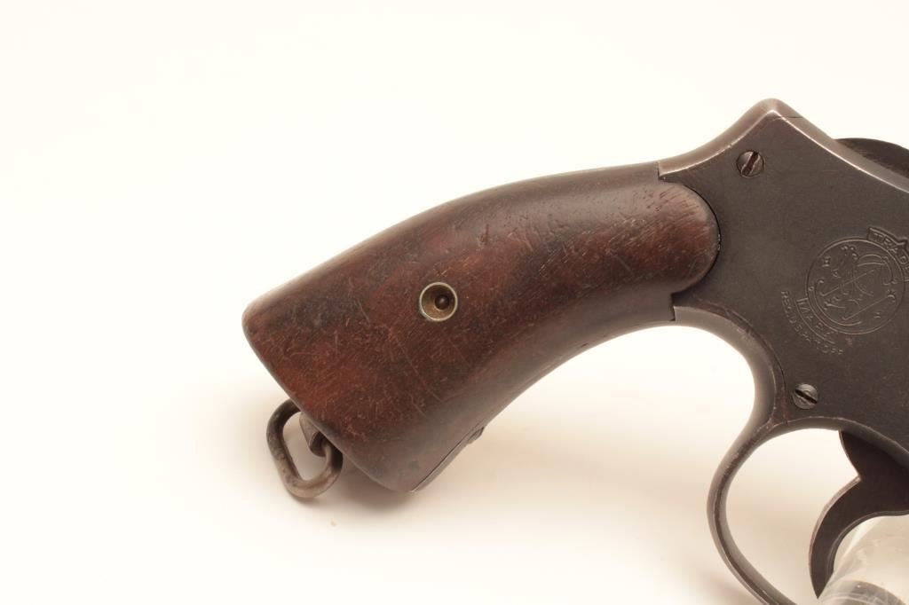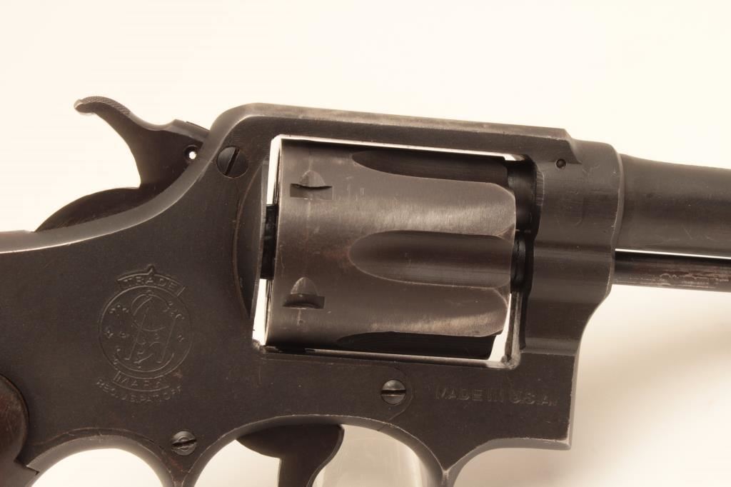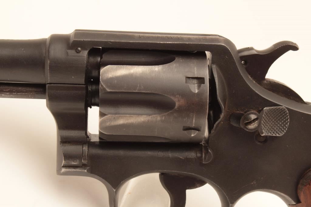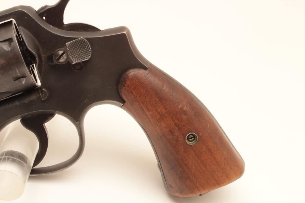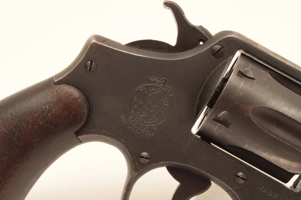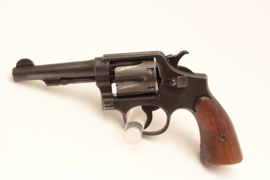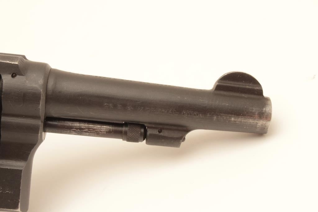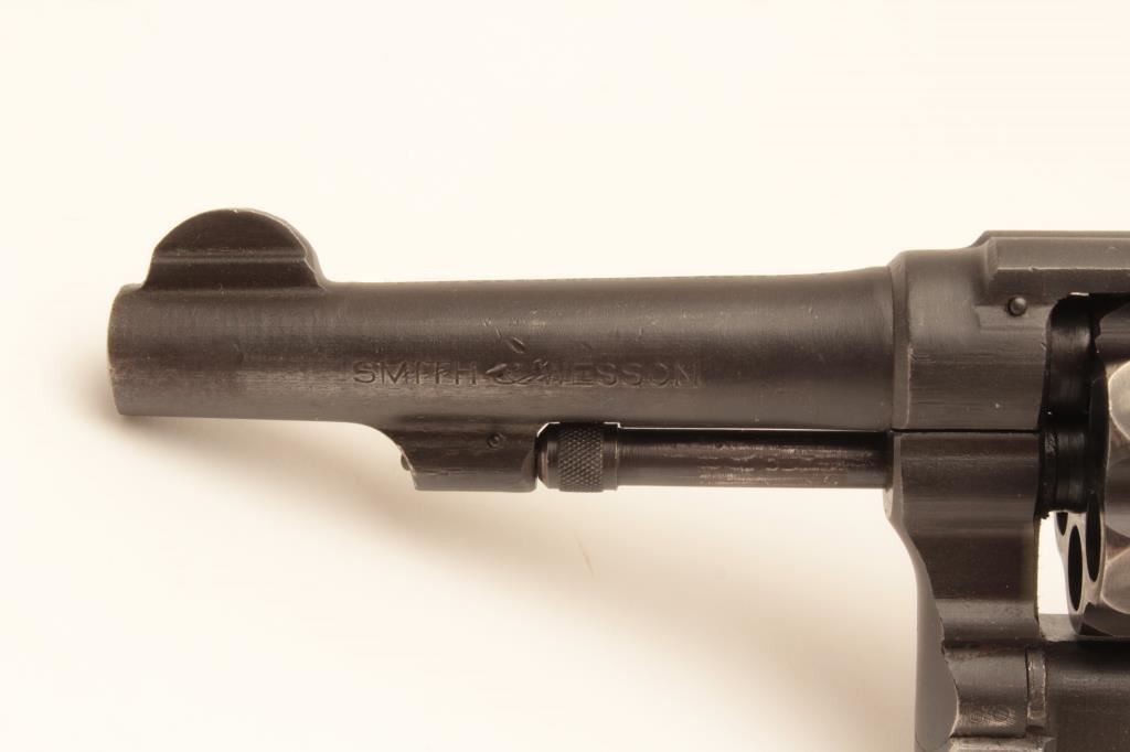 Smith and Wesson Victory Model revolver, .38 Special caliber, Serial #V226608. The pistol is in very good overall condition with a 4” barrel. The metal surfaces retain the majority of their military finish with wear at the muzzle and a drag line on the cylinder. The top strap is marked, “U.S. NAVY”. The smooth wood grips are in very good condition with small mars and a lanyard ring in the butt. The bore is good, the action is crisp and the markings are sharp on this WWII era pistol. The lot includes a Smith and Wesson factory letter indicating the pistol was shipped on January 29, 1943 and delivered to the U.S. Navy Springfield Armory, Springfield, MA. Est.: $300-$600. (C+R).