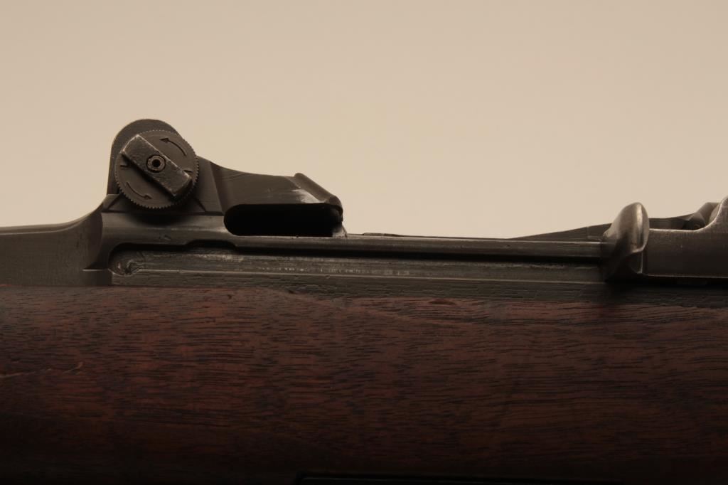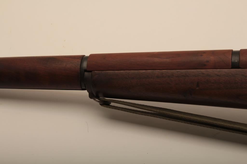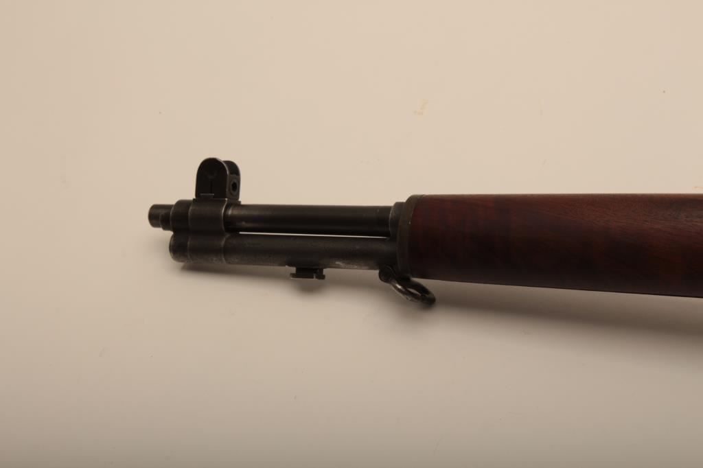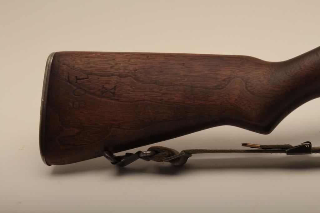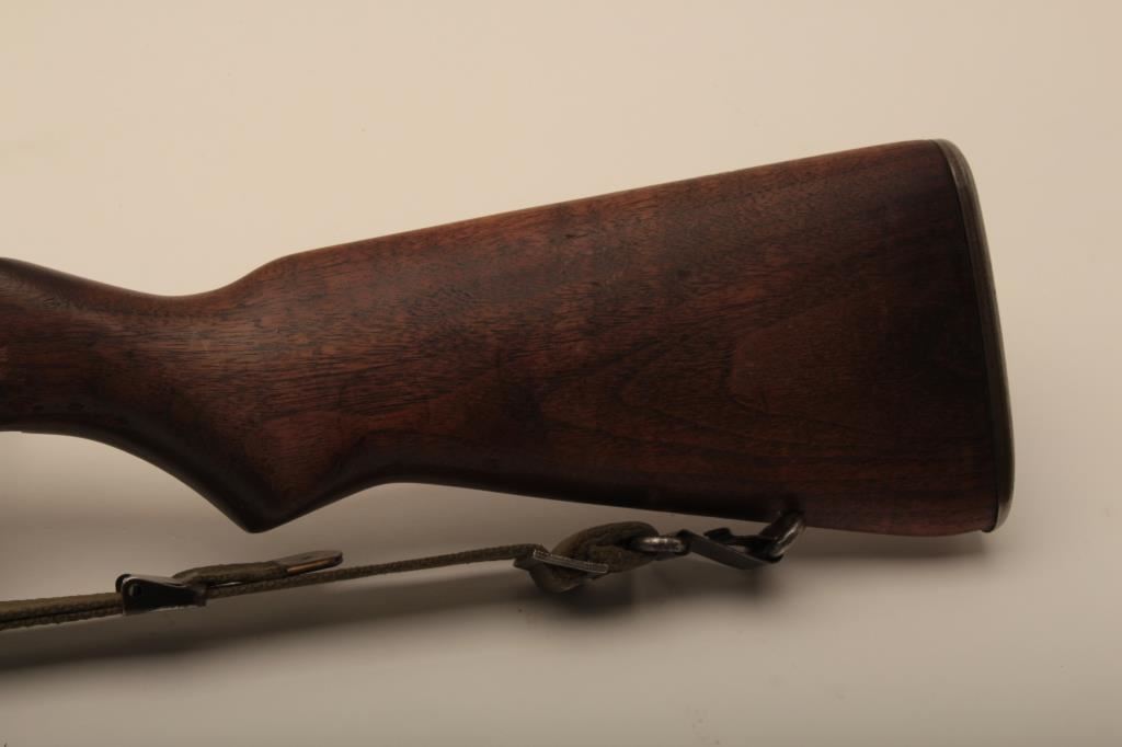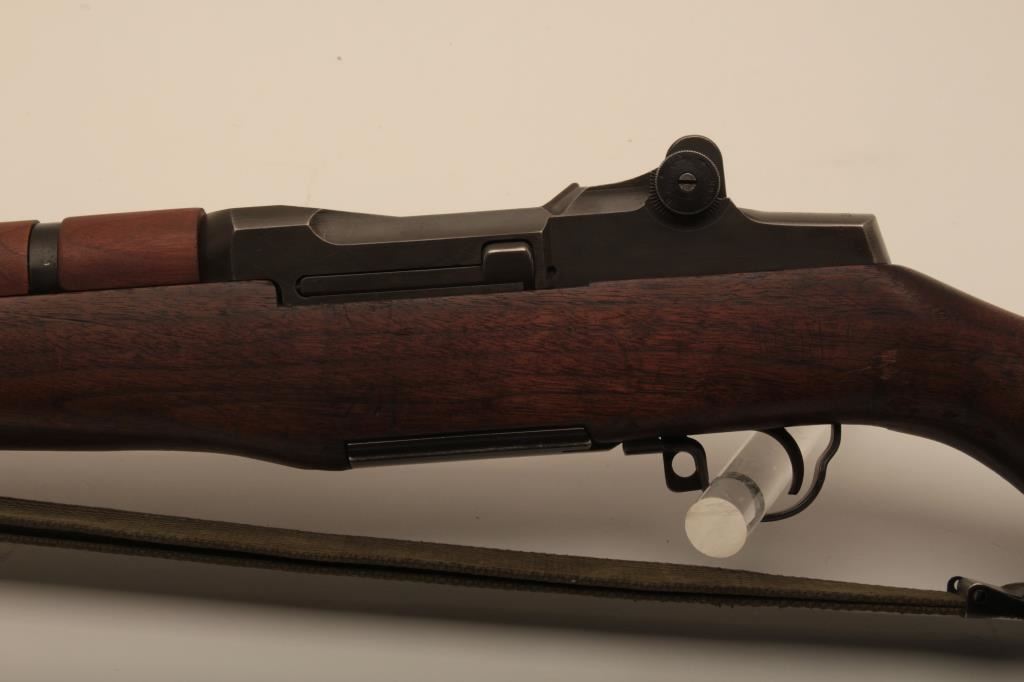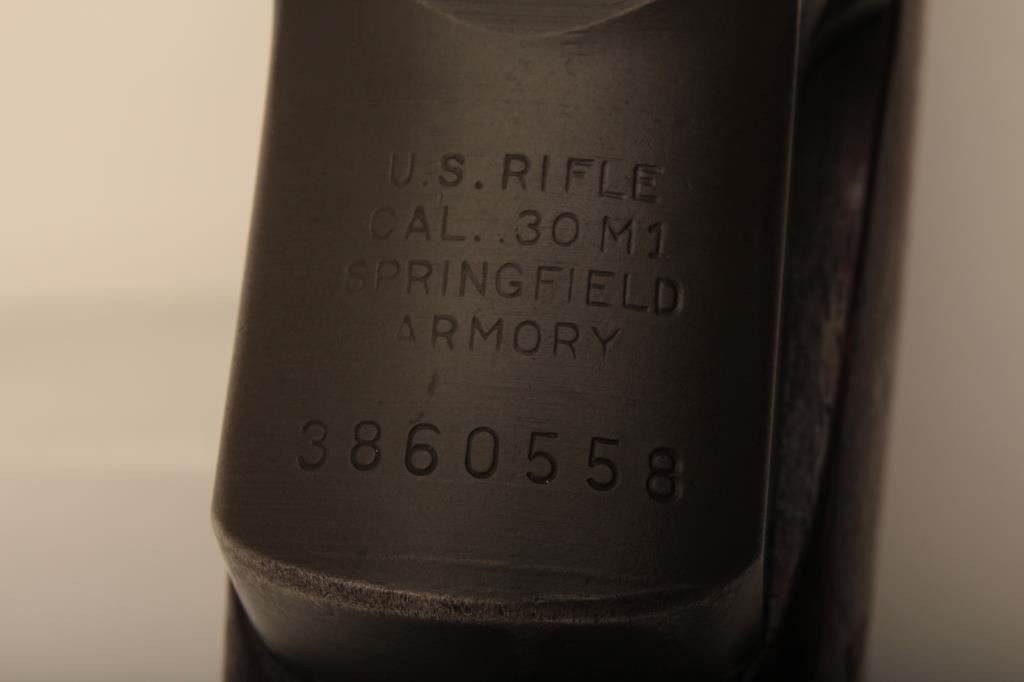 US Springfield M1 Garand rifle, .30 caliber, Serial #3860558. The rifle is in very good overall condition with a 24” barrel. The metal surfaces retain the majority of their original military finish with wear at the muzzle and areas of light surface erosion. The smooth wood stock is in good condition with mars and compressions consistent with service use. The barrel is marked, “SA” and dated 6-45. The butt stock has several light cartouches, with numbers engraved on top of the comb and on the right side of the butt. The butt stock includes sling swivels, an OD green canvas sling and ends with a checkered steel butt plate with trap. The bore is good, the action crisp and markings are sharp. Est.: $800-$1,600. (C+R).