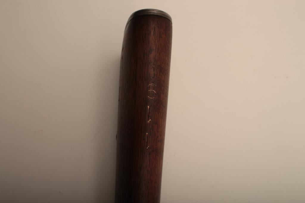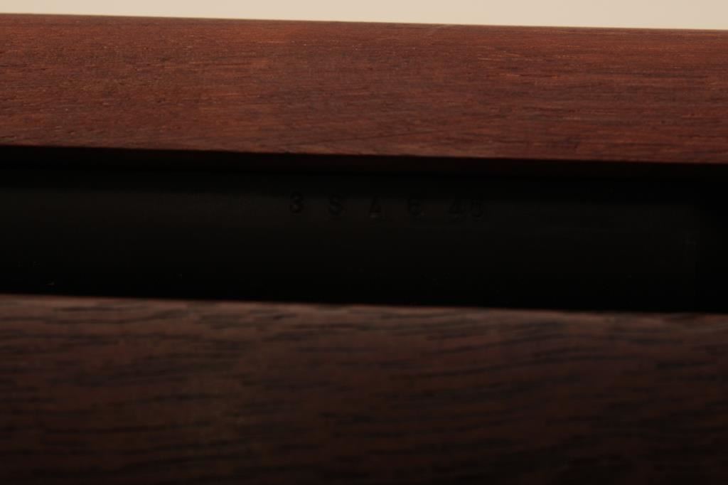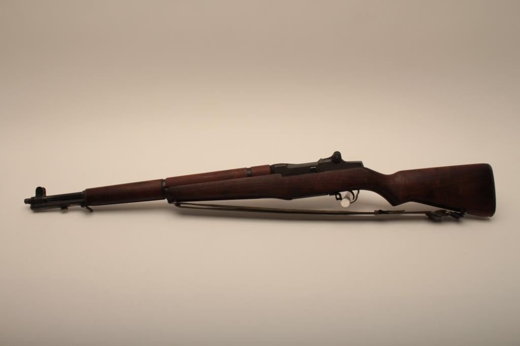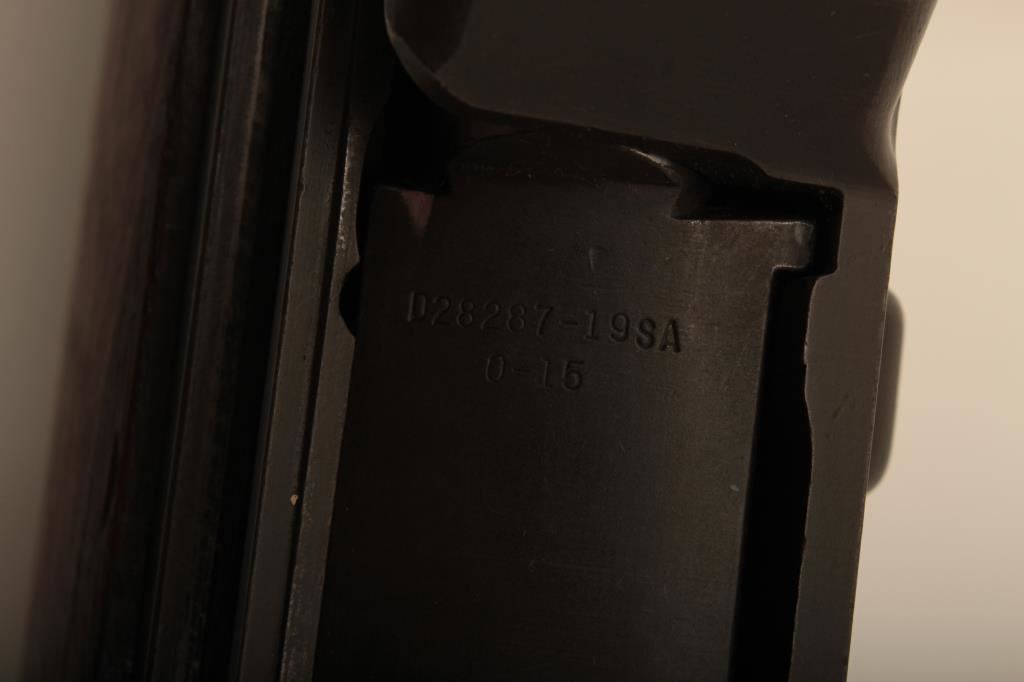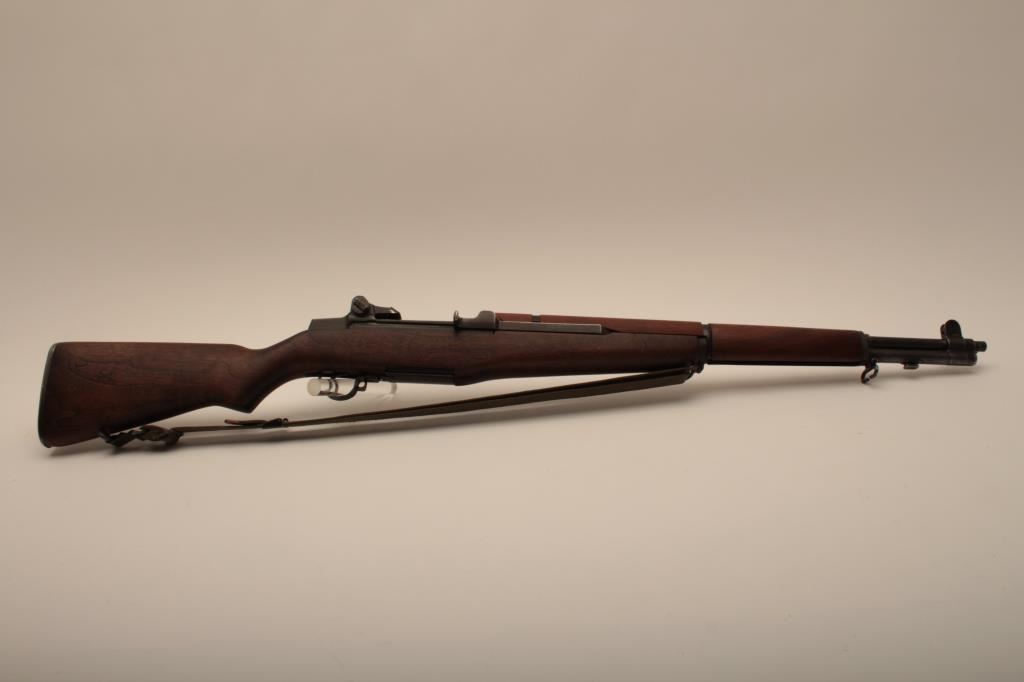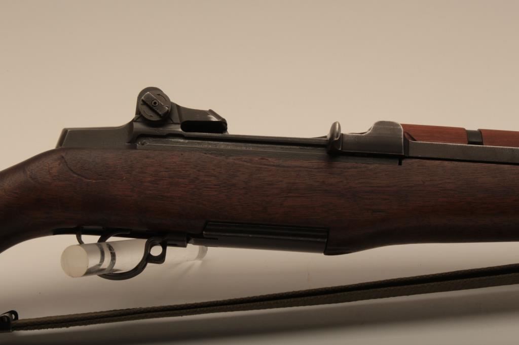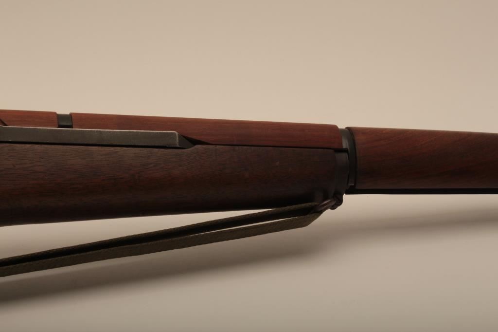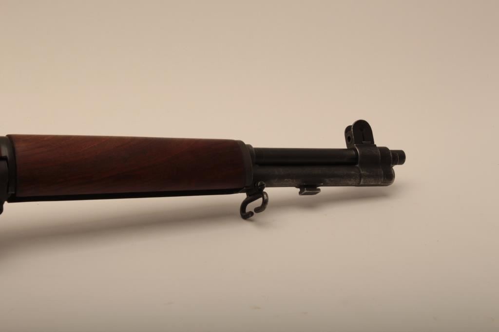 US Springfield M1 Garand rifle, .30 caliber, Serial #3860558. The rifle is in very good overall condition with a 24” barrel. The metal surfaces retain the majority of their original military finish with wear at the muzzle and areas of light surface erosion. The smooth wood stock is in good condition with mars and compressions consistent with service use. The barrel is marked, “SA” and dated 6-45. The butt stock has several light cartouches, with numbers engraved on top of the comb and on the right side of the butt. The butt stock includes sling swivels, an OD green canvas sling and ends with a checkered steel butt plate with trap. The bore is good, the action crisp and markings are sharp. Est.: $800-$1,600. (C+R).