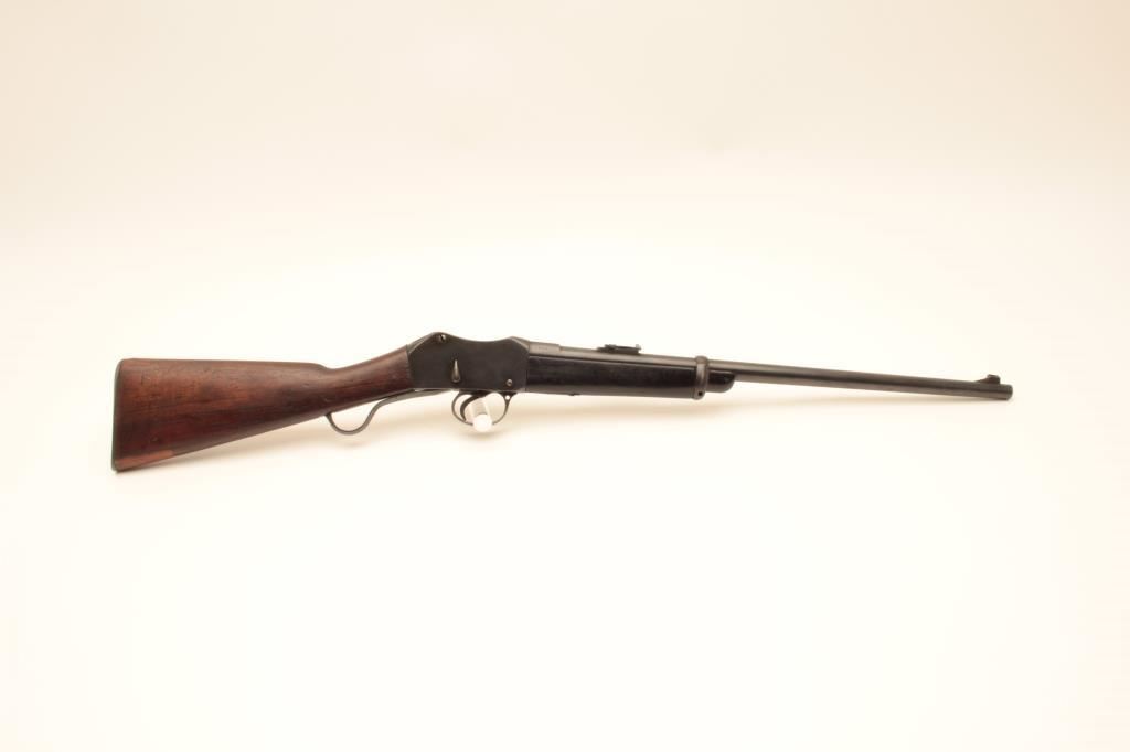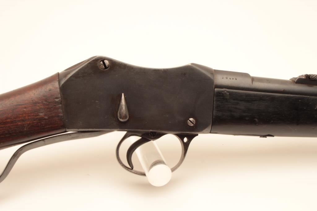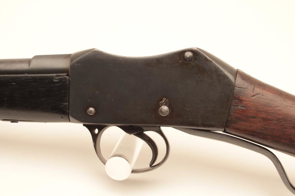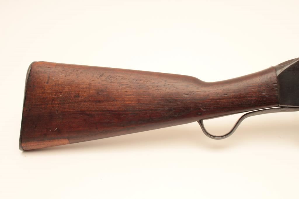 Martini-Henry single shot carbine, .32 caliber, Serial #20895. The carbine is in good overall condition with a 21” with a ramped blade front and military tangent style rear sights. The metal surfaces retain the majority of their blue finish with wear at the muzzle and small scratches and mars along the barrel and features numerous English proof marks behind the rear sight. The smooth wood stock has been shortened at the fore end and is in good overall condition with dents and compressions consistent with carry and use. The butt stock ends with a smooth steel butt plate and has a small repair at the toe. The bore is fair, the action functions and the markings are legible. Est.: $250-$500. (C+R).