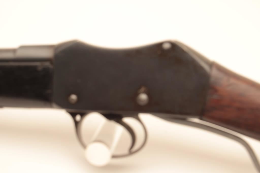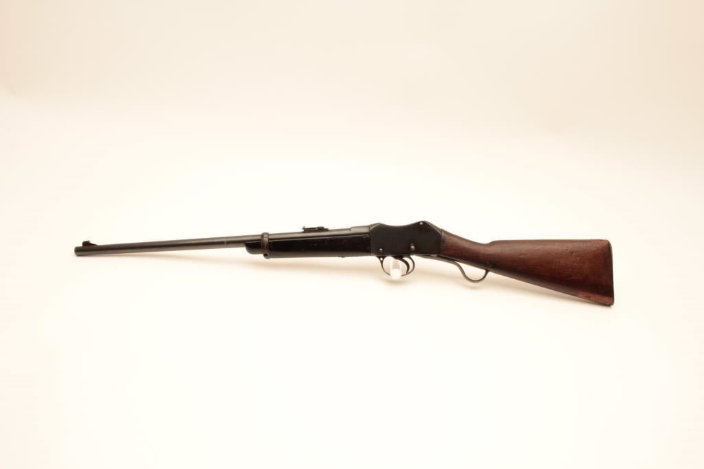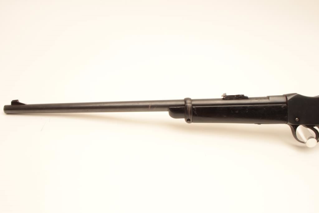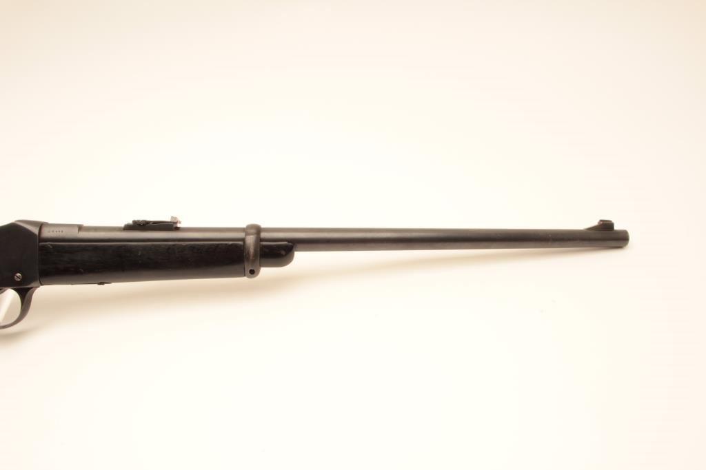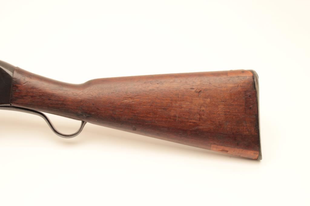 Martini-Henry single shot carbine, .32 caliber, Serial #20895. The carbine is in good overall condition with a 21” with a ramped blade front and military tangent style rear sights. The metal surfaces retain the majority of their blue finish with wear at the muzzle and small scratches and mars along the barrel and features numerous English proof marks behind the rear sight. The smooth wood stock has been shortened at the fore end and is in good overall condition with dents and compressions consistent with carry and use. The butt stock ends with a smooth steel butt plate and has a small repair at the toe. The bore is fair, the action functions and the markings are legible. Est.: $250-$500. (C+R).