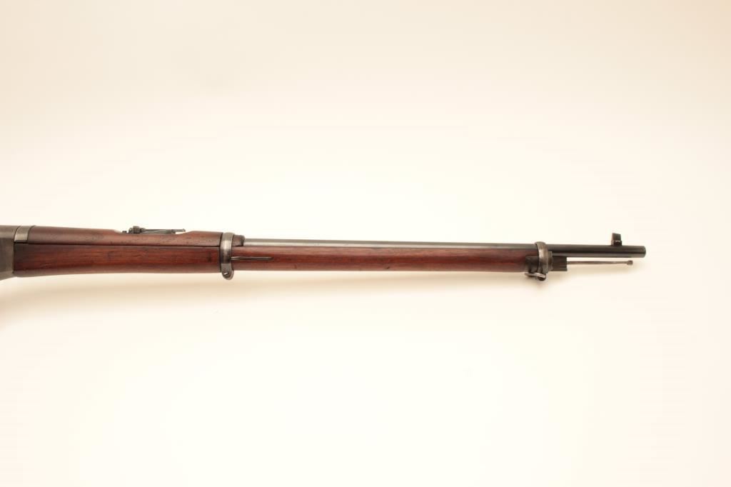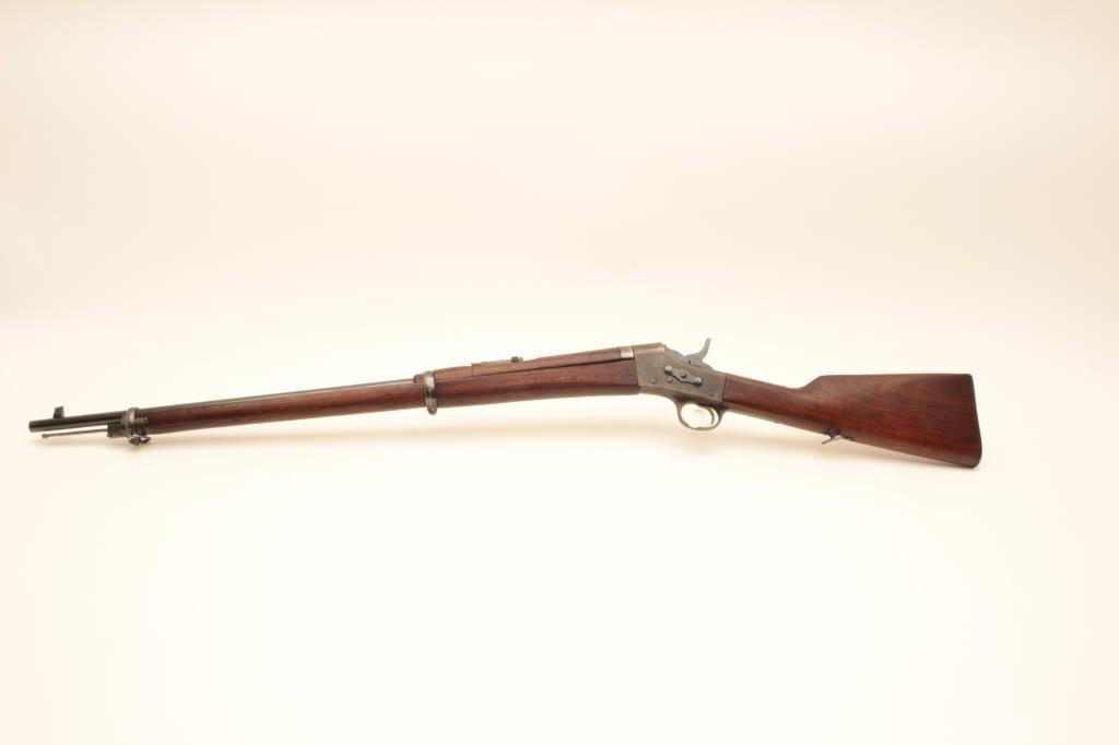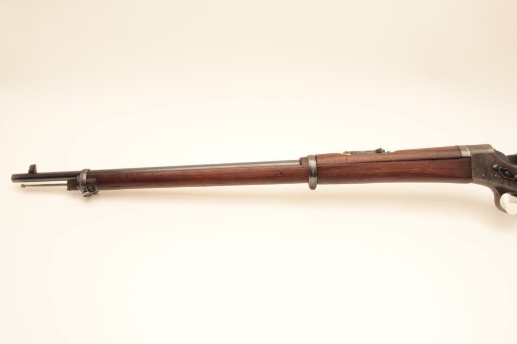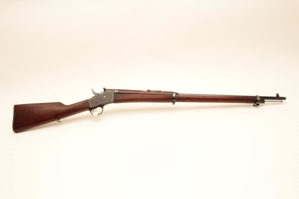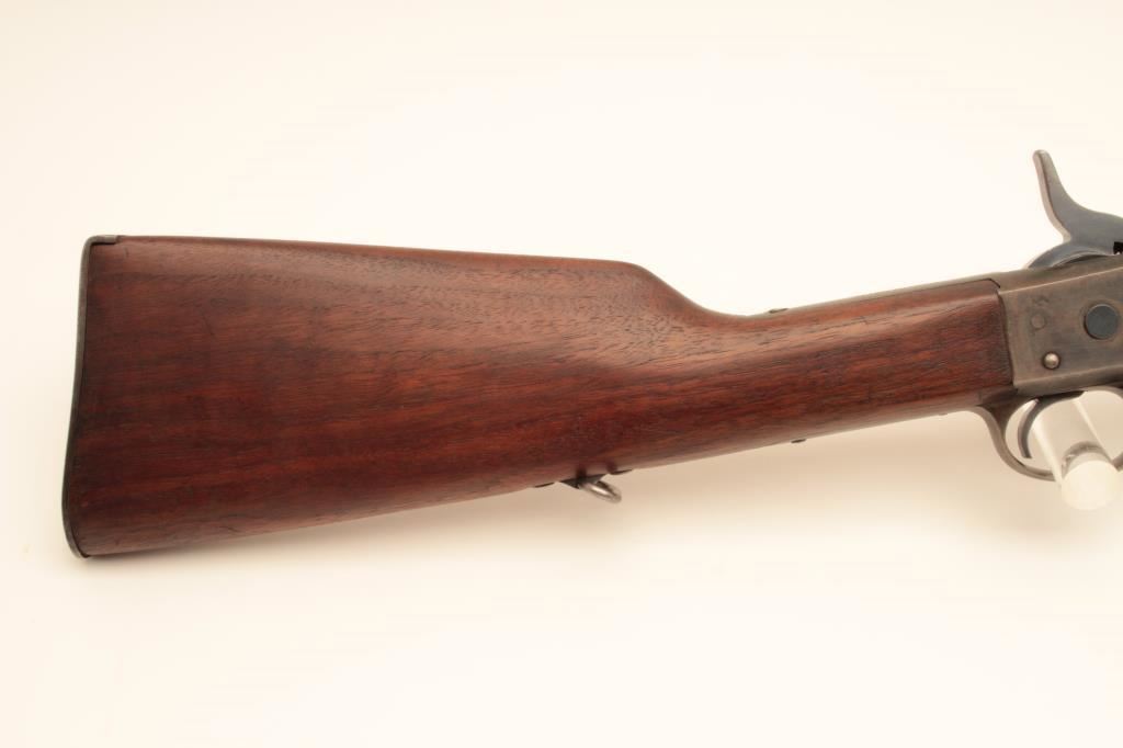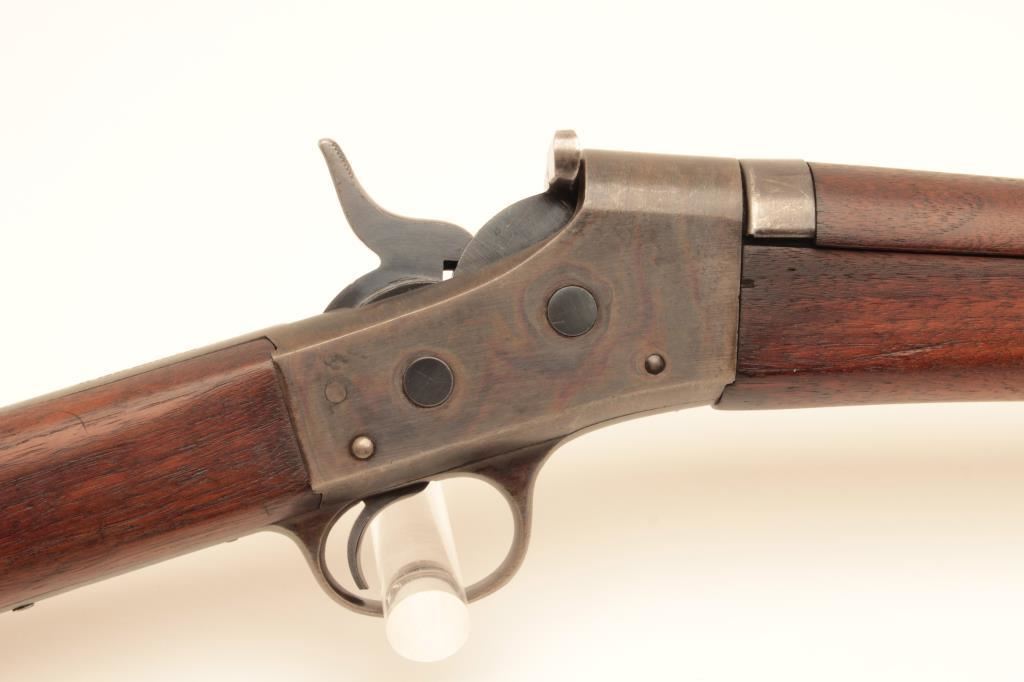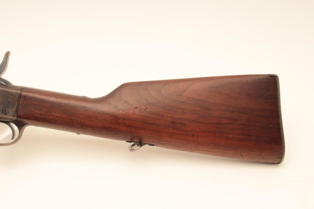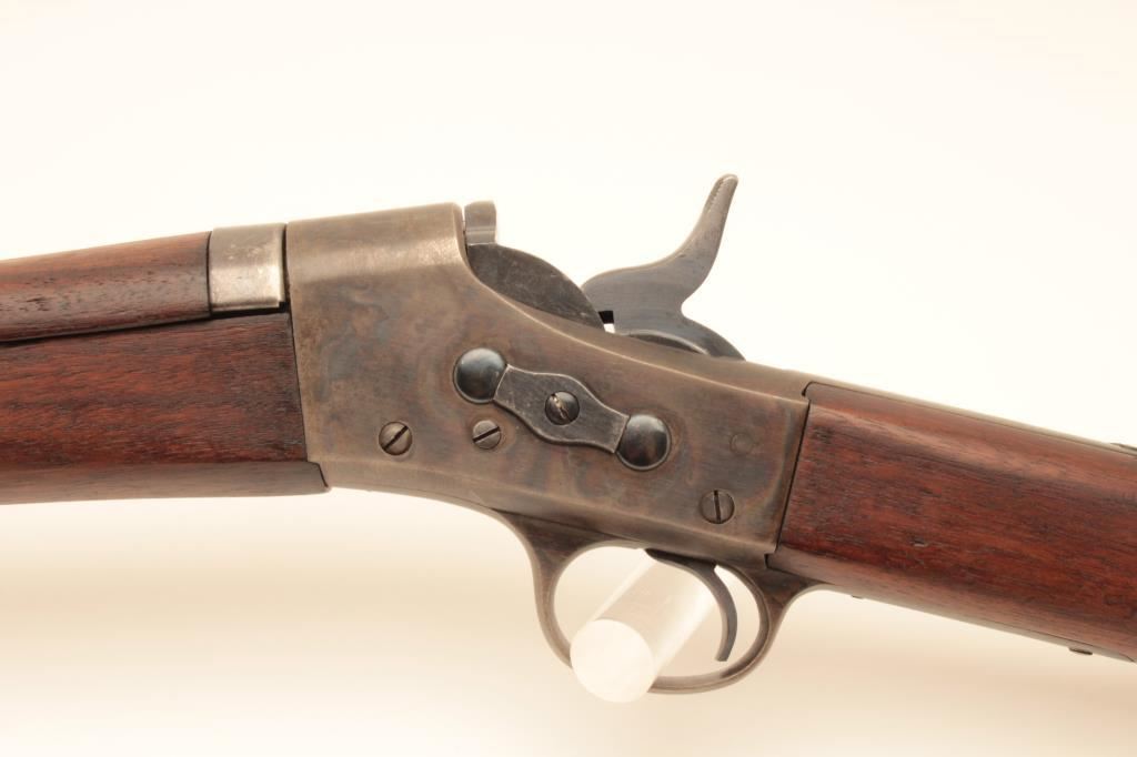 Remington Rolling Block single shot rifle, 7mm caliber, Serial #NSNV. The rifle is in fine overall condition with a 30” round barrel with a blade front and military tangent style rear sights. The barrel retains a significant amount of its blue finish with light wear at the muzzle. The receiver shows beautiful muted case hardening. The smooth wood stocks are in good condition showing small mars and compressions. The butt stock ends with a smooth, steel butt plate with swivel slings and cleaning rod retained. The bore is good, the action is crisp and markings are sharp. Est.: $400-$800. (C+R).
