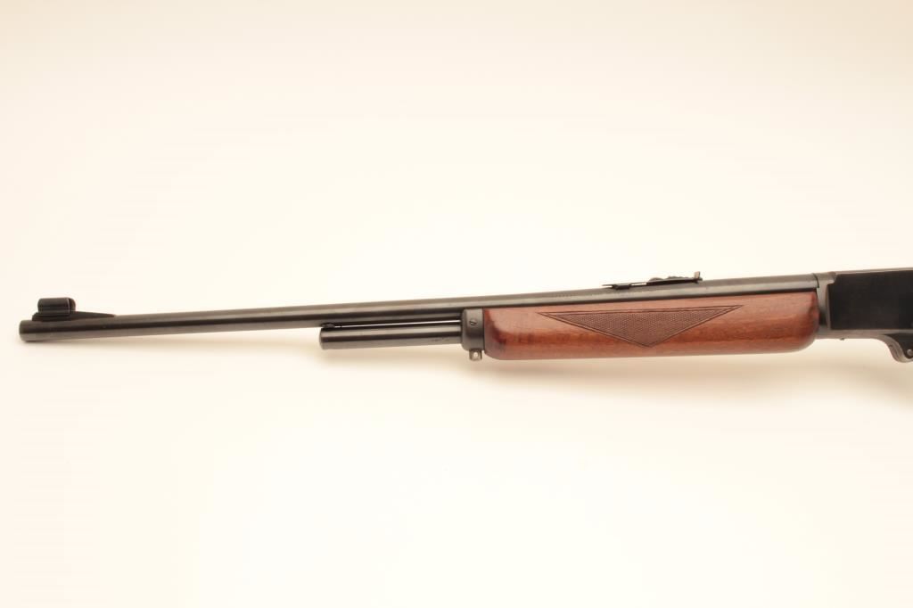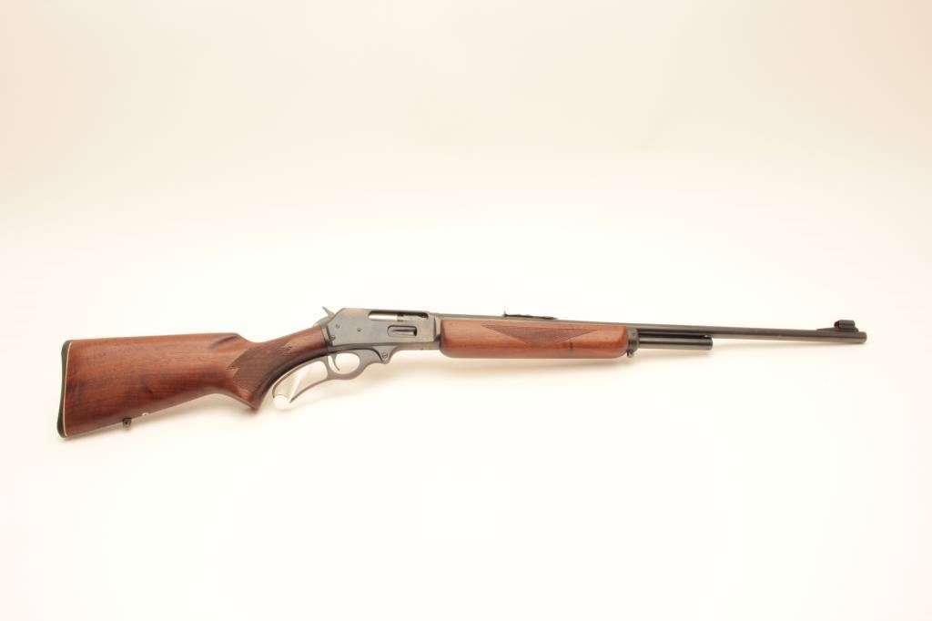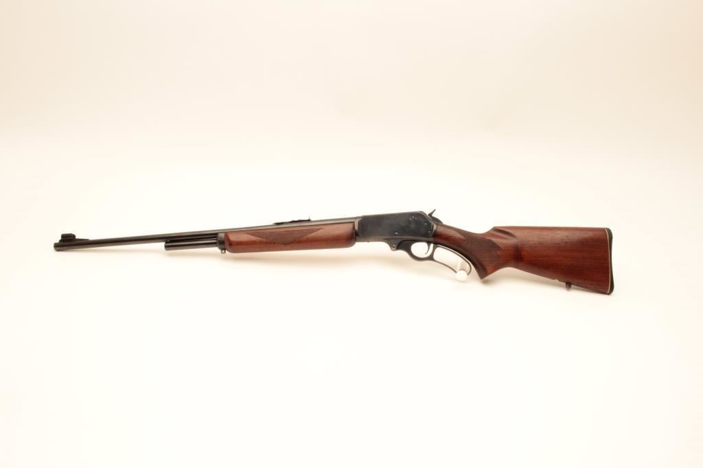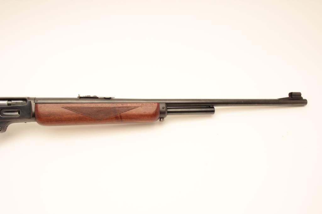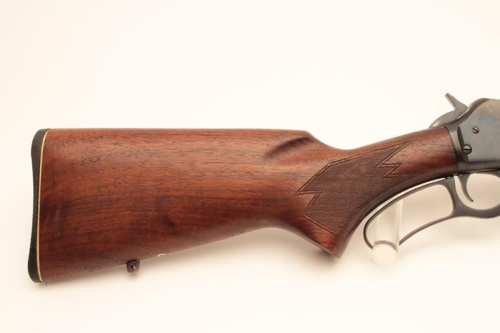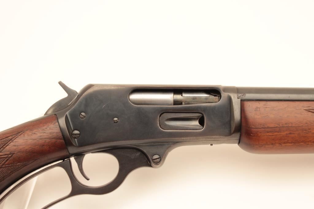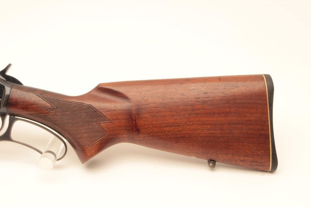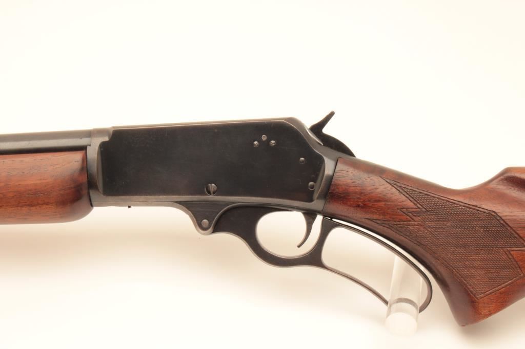 Marlin Model 336-A lever action rifle, .32 Special caliber, Serial #57147. The rifle is in very good overall condition with a 24” barrel with a hooded front and standard rear sights. The barrel and half-magazine both retain the majority of their blue finish with light wear at the muzzle and small handling marks. The checkered wood stocks are in good condition with mars and compressions consistent with field use. The butt stock ends with a Marlin marked checkered rubber butt pad. The bore is good, the markings are sharp and the action is crisp. Est.: $400-$800. (C+R).