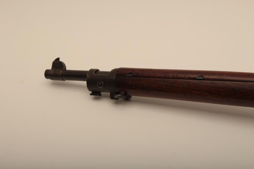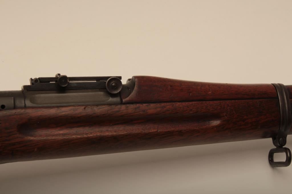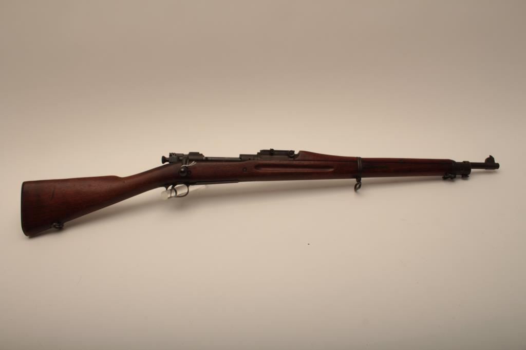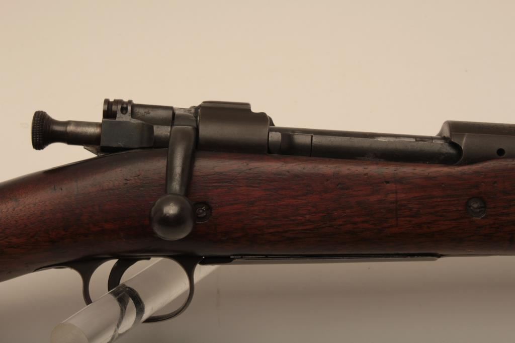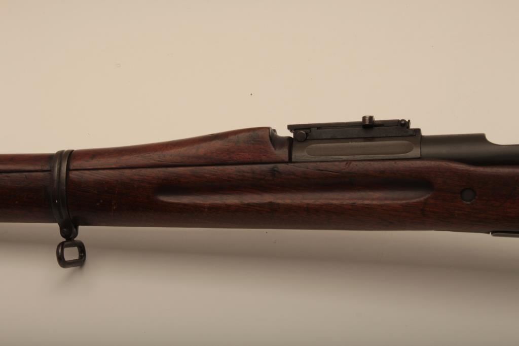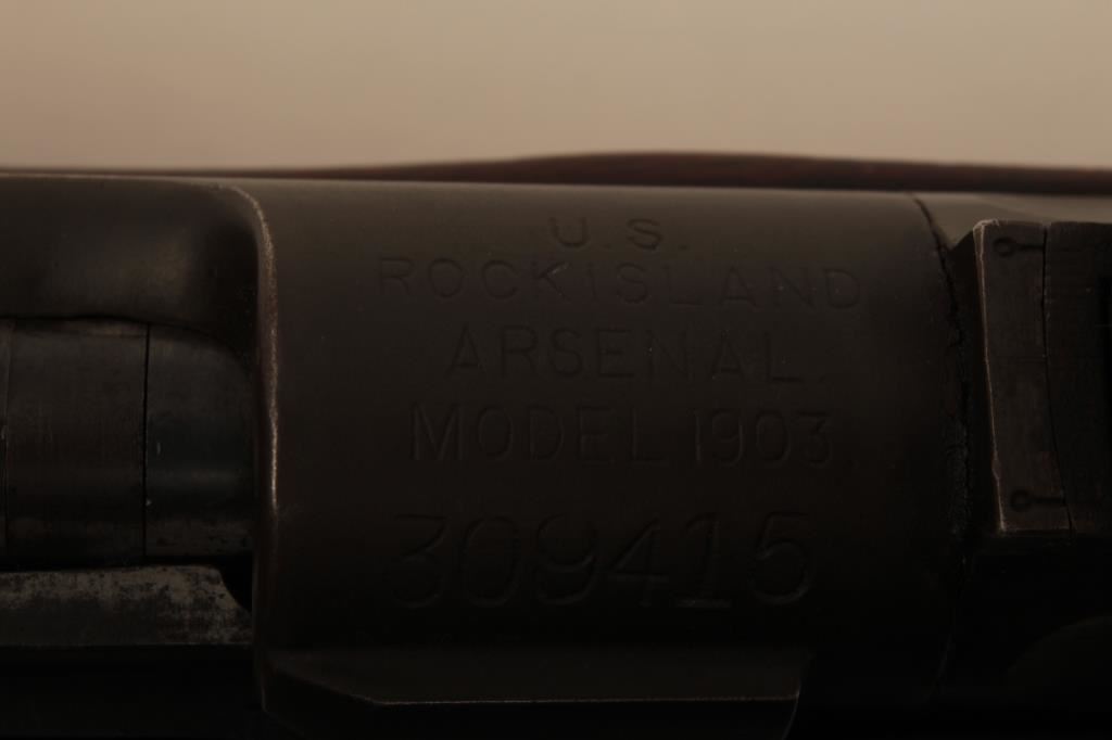 US Rock Island Arsenal Model 1903 bolt action rifle, .30 caliber, Serial #408049. The rifle is in good overall condition with a 24” barrel with a ramped blade front and military tangent style rear sights. The barrel retains a significant amount of its military finish and is marked, “RIA” with the flaming bomb emblem and dated 6-18. The receiver also retains the majority of its military finish with some light scratches. The smooth wood stock is in good condition with handling marks and a couple of faint cartouches. The bore is good, the action is crisp and markings are sharp. Est.: $350-$700. (C+R).