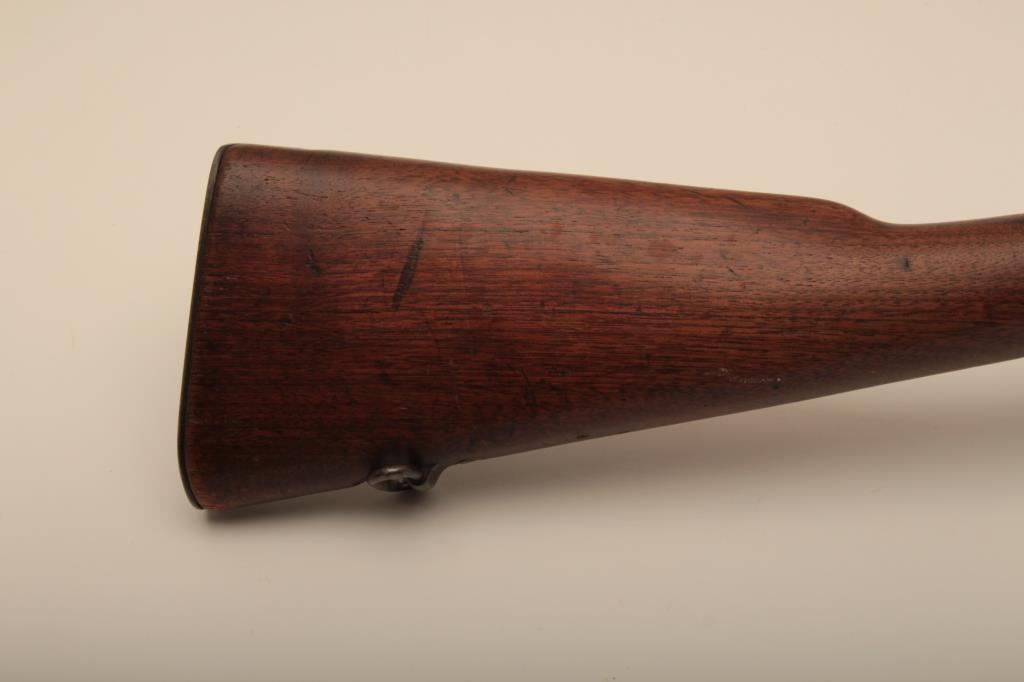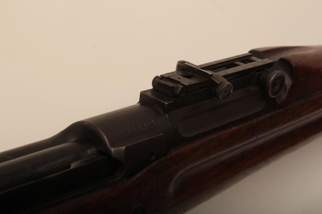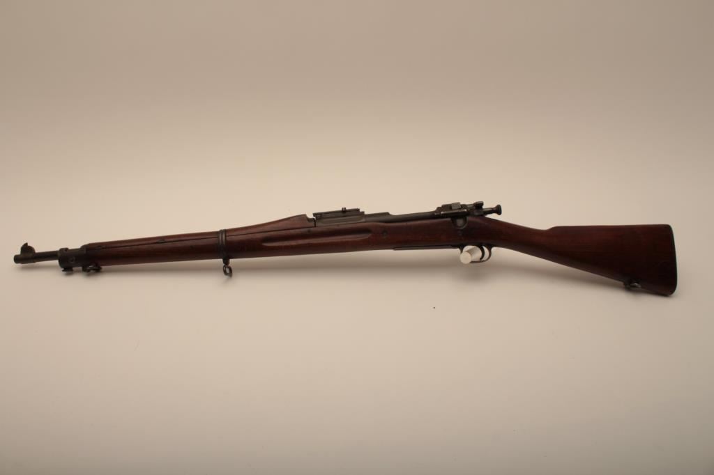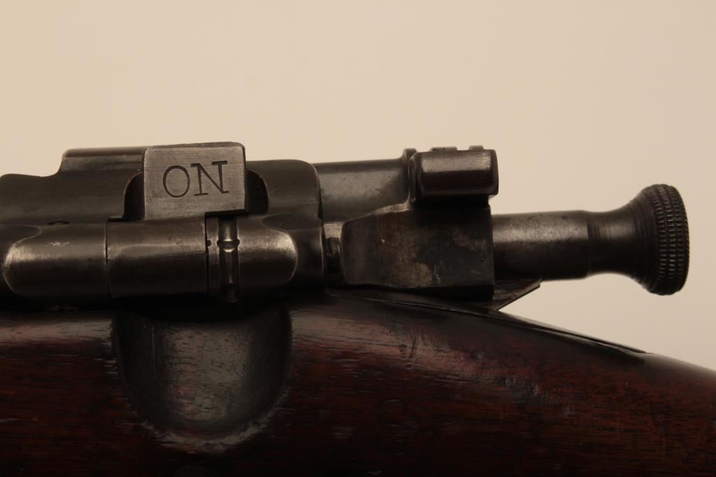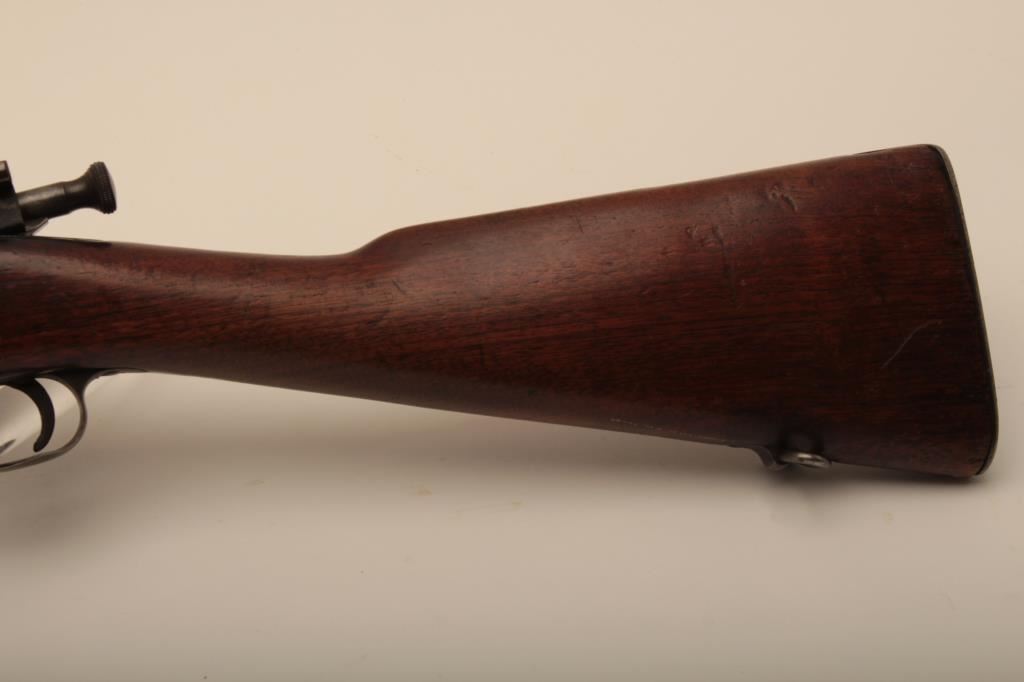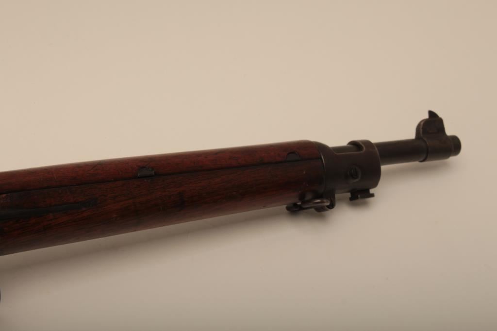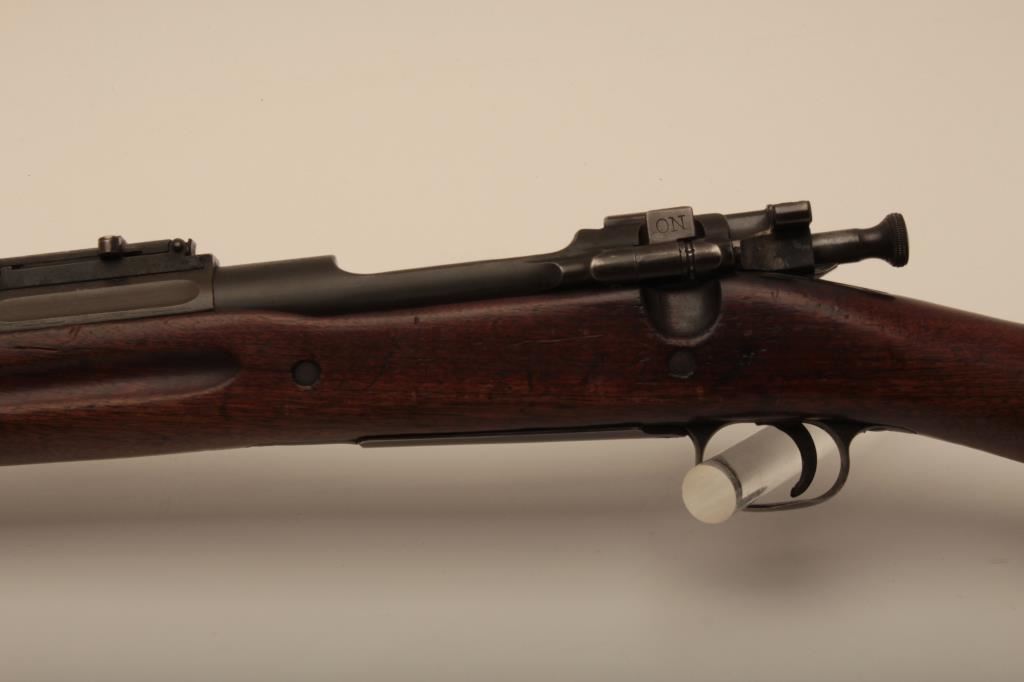 US Rock Island Arsenal Model 1903 bolt action rifle, .30 caliber, Serial #408049. The rifle is in good overall condition with a 24” barrel with a ramped blade front and military tangent style rear sights. The barrel retains a significant amount of its military finish and is marked, “RIA” with the flaming bomb emblem and dated 6-18. The receiver also retains the majority of its military finish with some light scratches. The smooth wood stock is in good condition with handling marks and a couple of faint cartouches. The bore is good, the action is crisp and markings are sharp. Est.: $350-$700. (C+R).