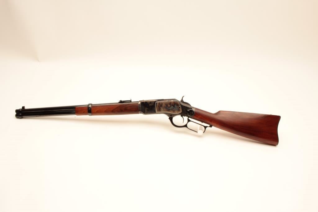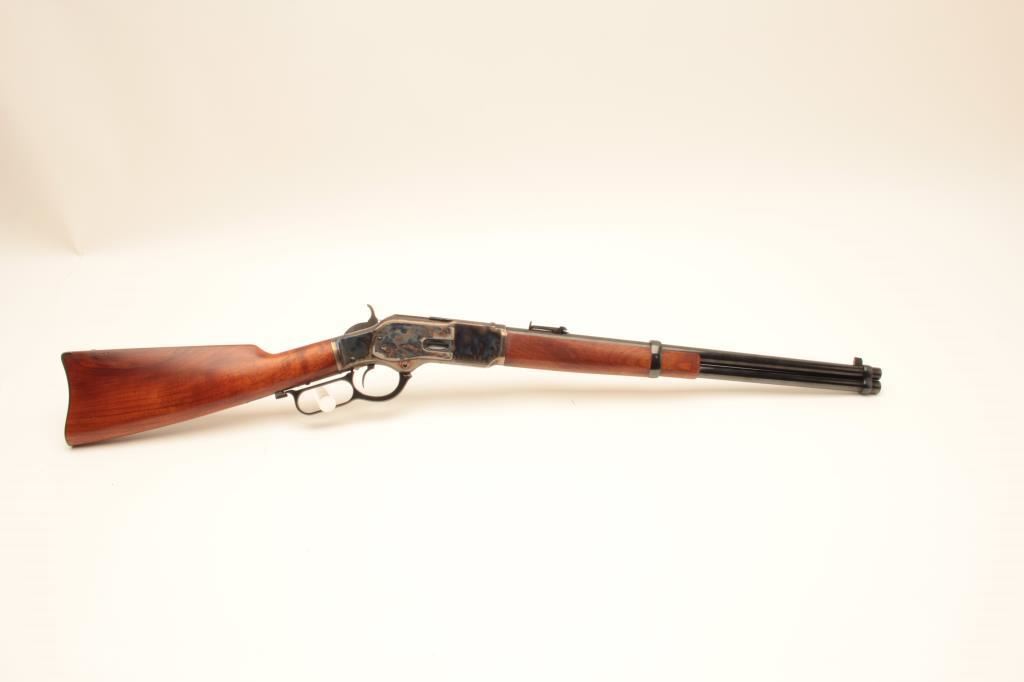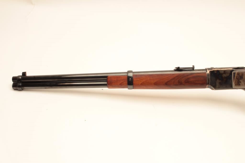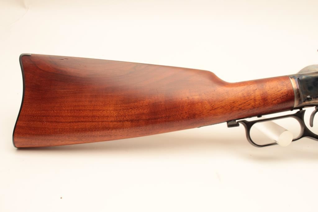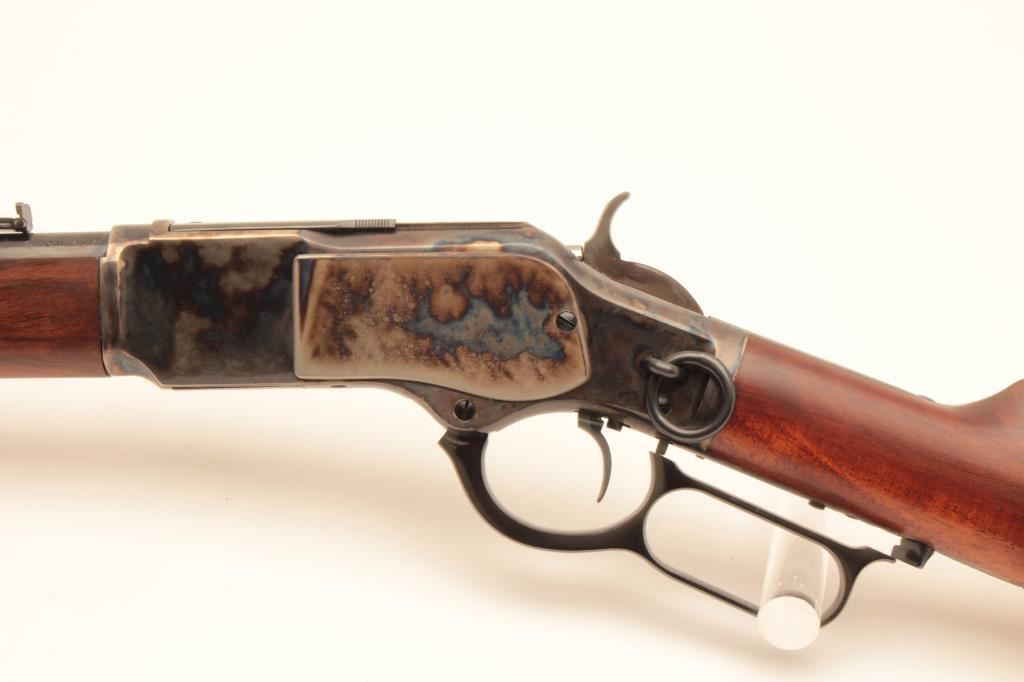 Uberti Model 73 lever action saddle ring carbine, .44-40 caliber, Serial #48392. The carbine is in fine overall condition with a 20” round barrel with a blade front and tangent style rear sights. The barrel and full-length magazine retain nearly all of their blue finish while the receiver is beautifully case colored, with the saddle ring retained. The smooth wood stocks are in very good condition with only light handling marks and the butt ends with a smooth, steel butt plate. The bore is very good, the action is crisp and markings are sharp on this lightly used carbine. Est.: $350-$700. (Modern).