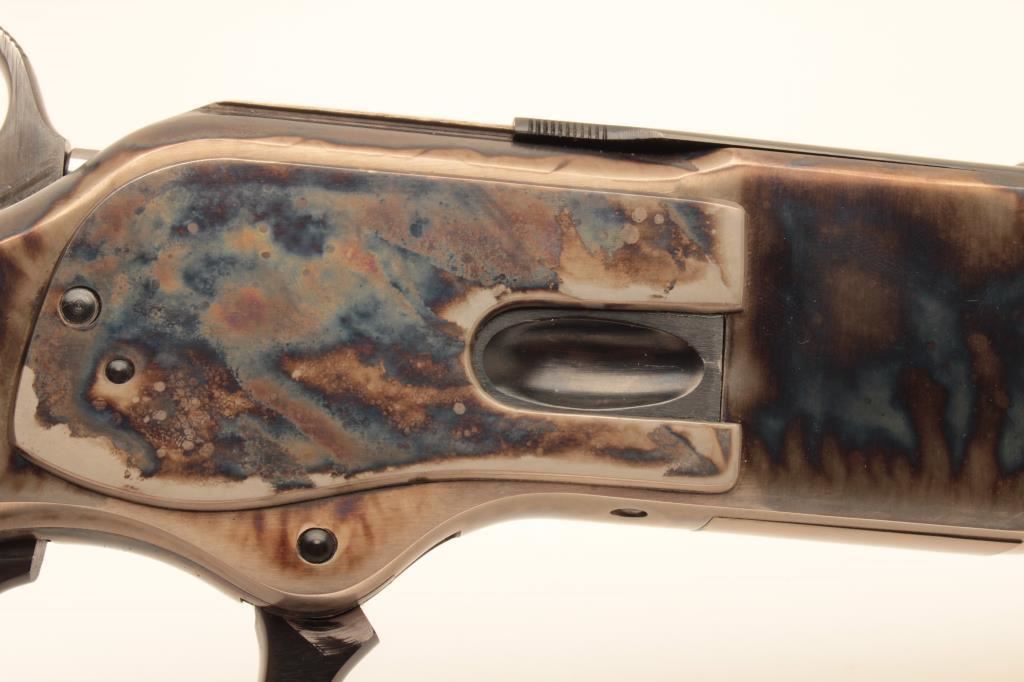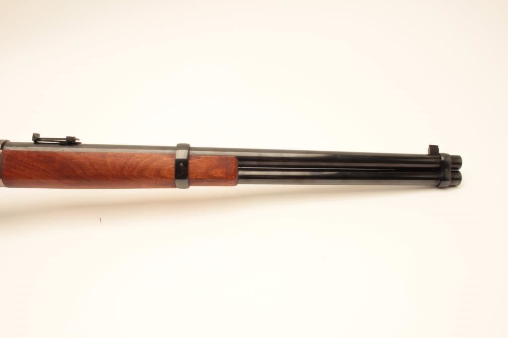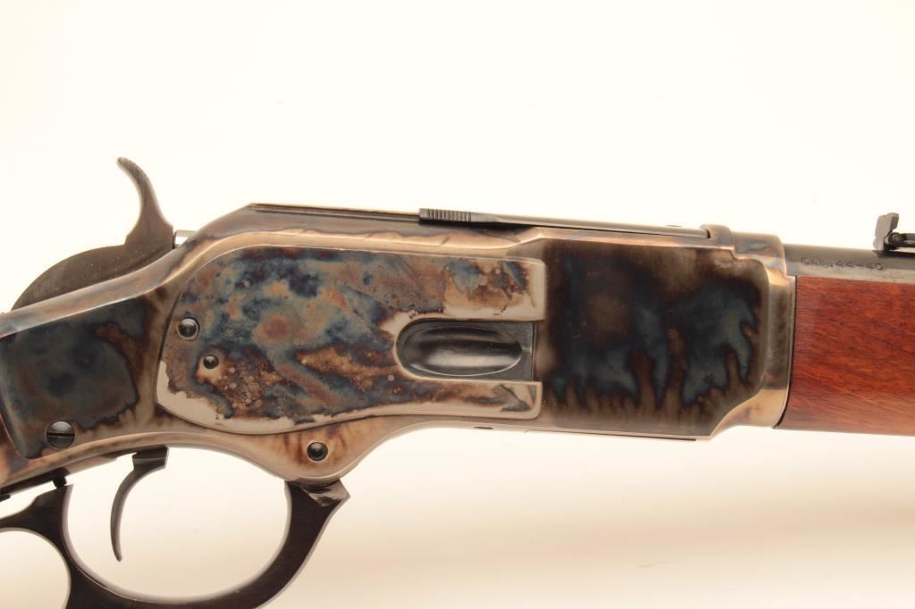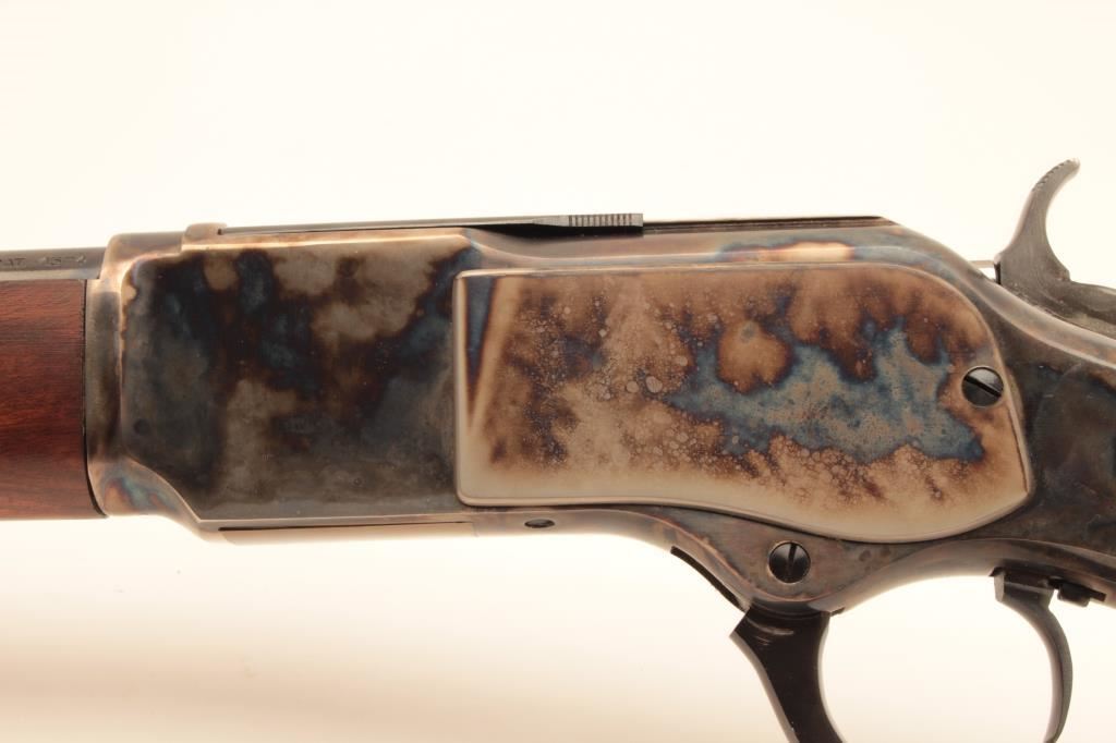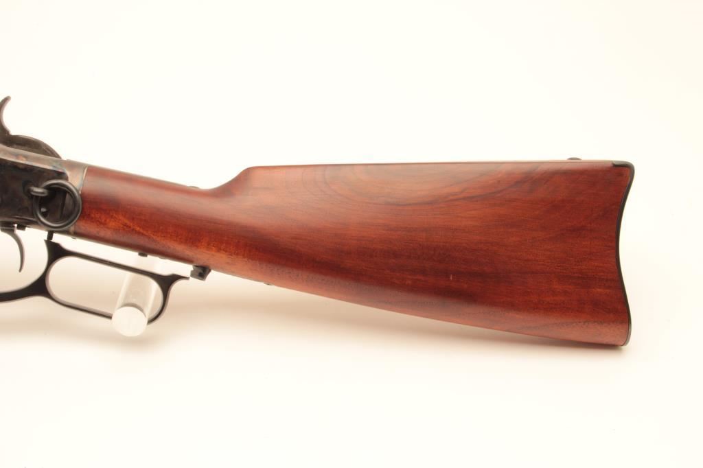 Uberti Model 73 lever action saddle ring carbine, .44-40 caliber, Serial #48392. The carbine is in fine overall condition with a 20” round barrel with a blade front and tangent style rear sights. The barrel and full-length magazine retain nearly all of their blue finish while the receiver is beautifully case colored, with the saddle ring retained. The smooth wood stocks are in very good condition with only light handling marks and the butt ends with a smooth, steel butt plate. The bore is very good, the action is crisp and markings are sharp on this lightly used carbine. Est.: $350-$700. (Modern).