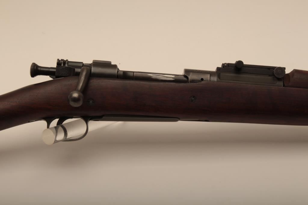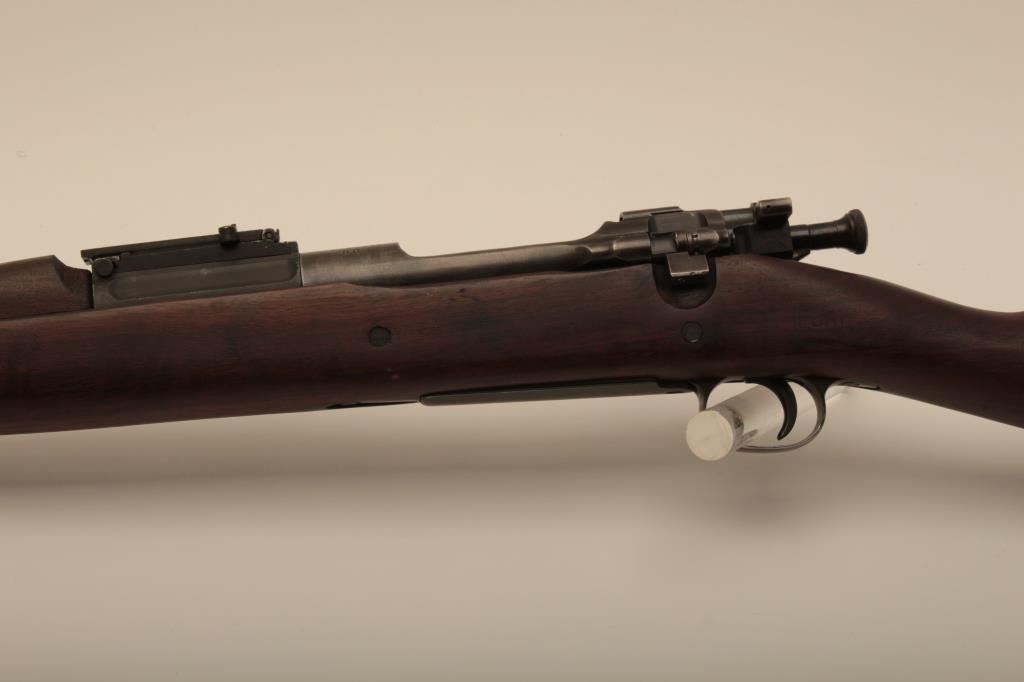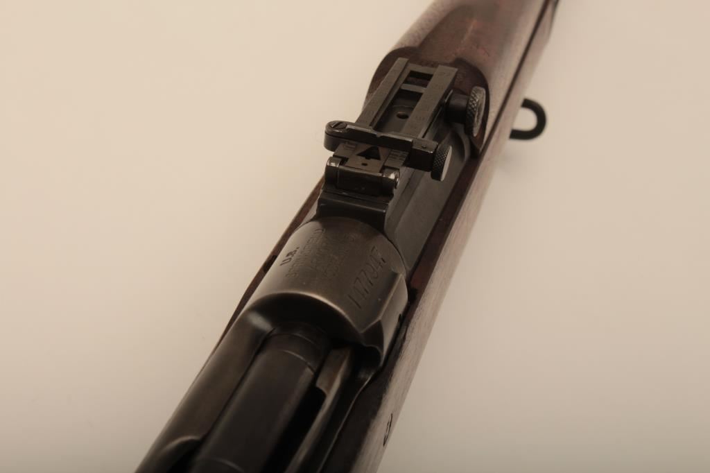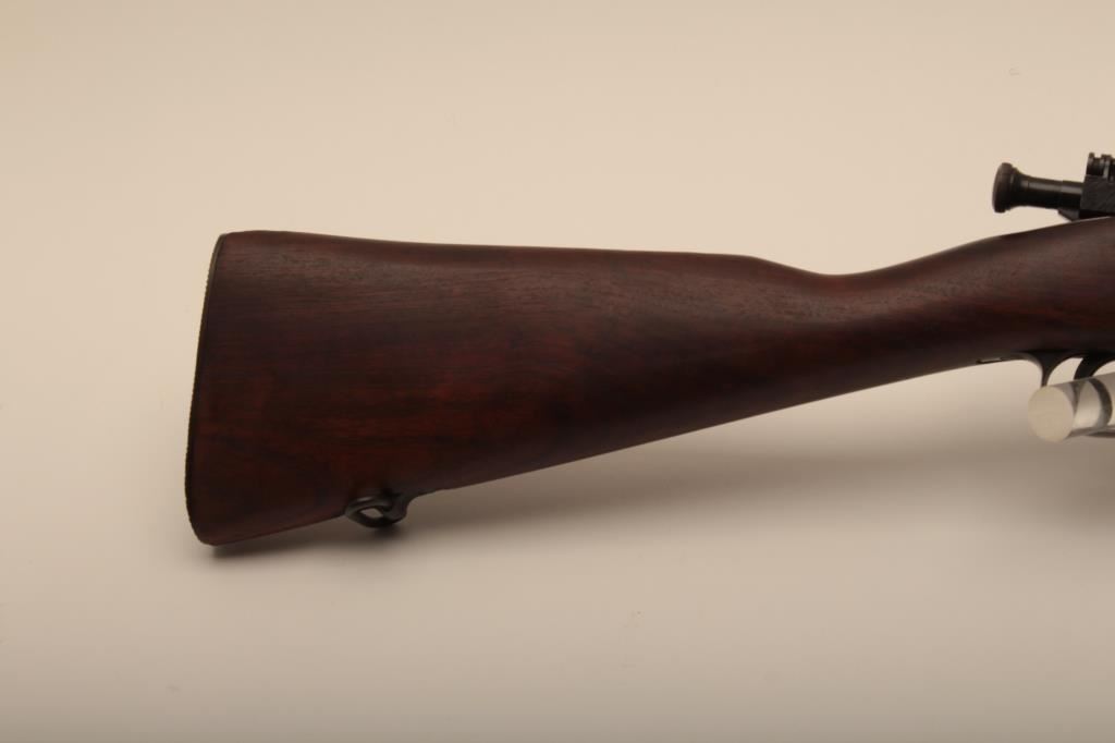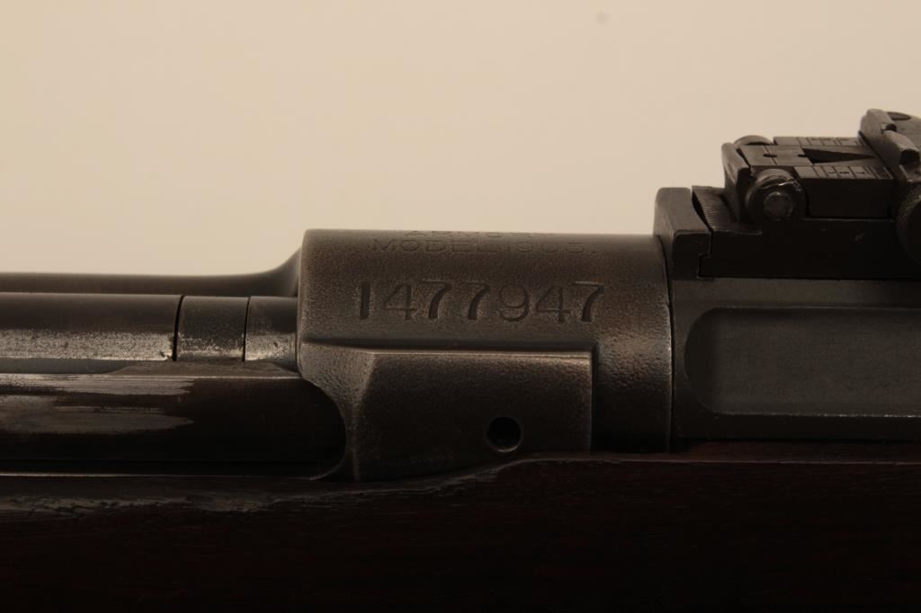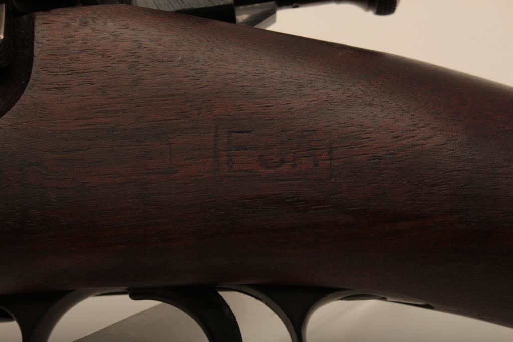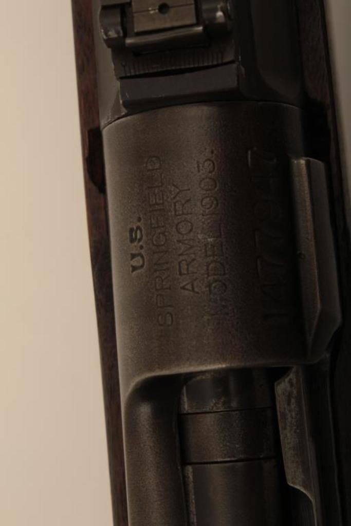 US Springfield Armory Model 1903 A1 bolt action rifle, .30 caliber, Serial #1477947. The rifle is in very good overall condition with a 24” barrel with a ramped blade front and military tangent style rear sights. The barrel retains a significant amount of its military finish and is marked, “SA” with the flaming bomb emblem and dated 3-39. The receiver has gone to a uniform grey with sharp markings. The smooth wood stock is in good condition with handling marks. There are two cartouches, a Circle P behind the trigger guard and “FJA” under the tang on the left side of the butt stock. The bore is good, the action is crisp and markings are sharp. Est.: $400-$800. (C+R).