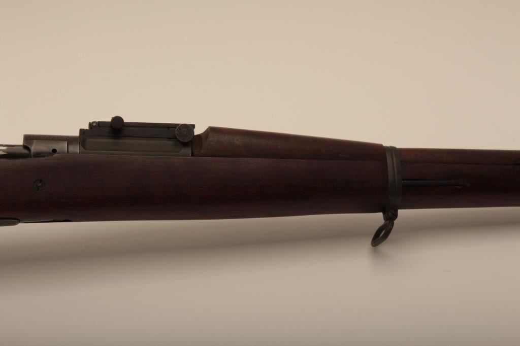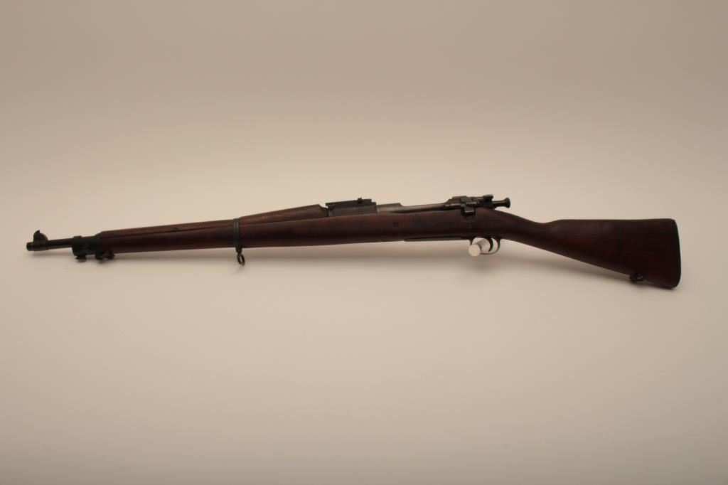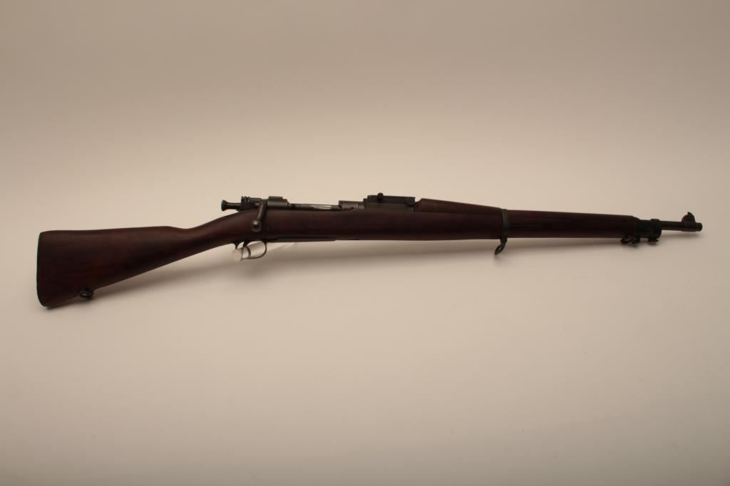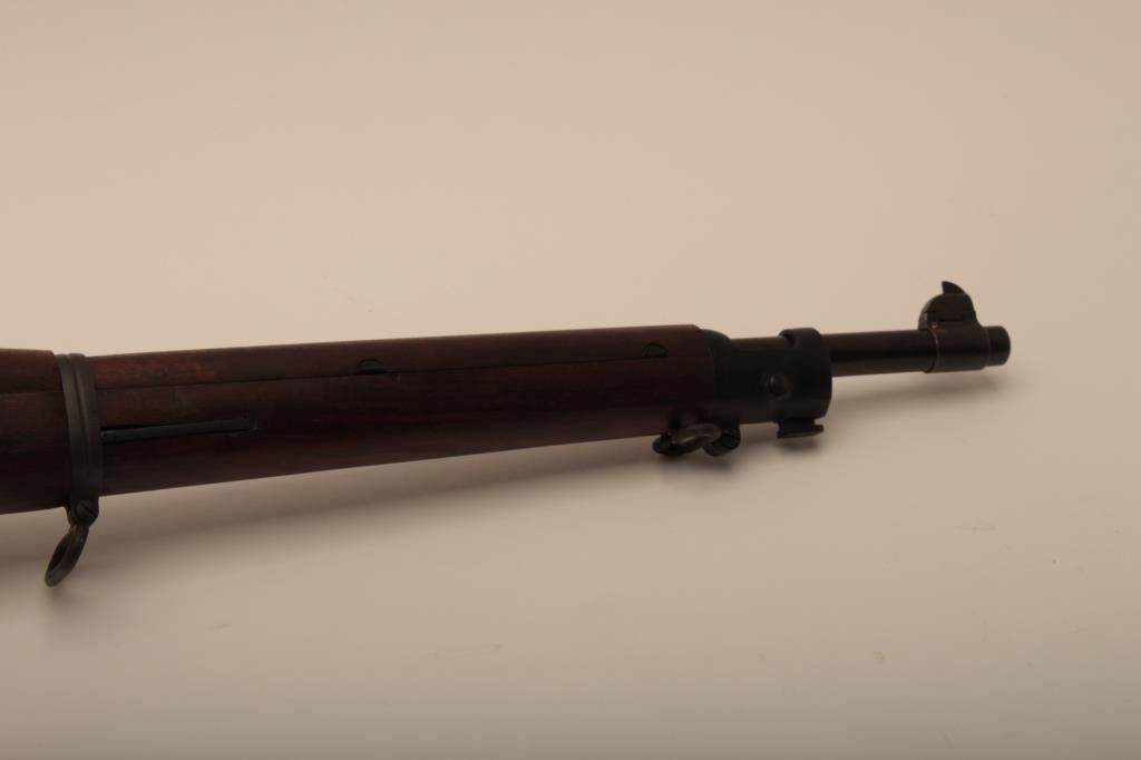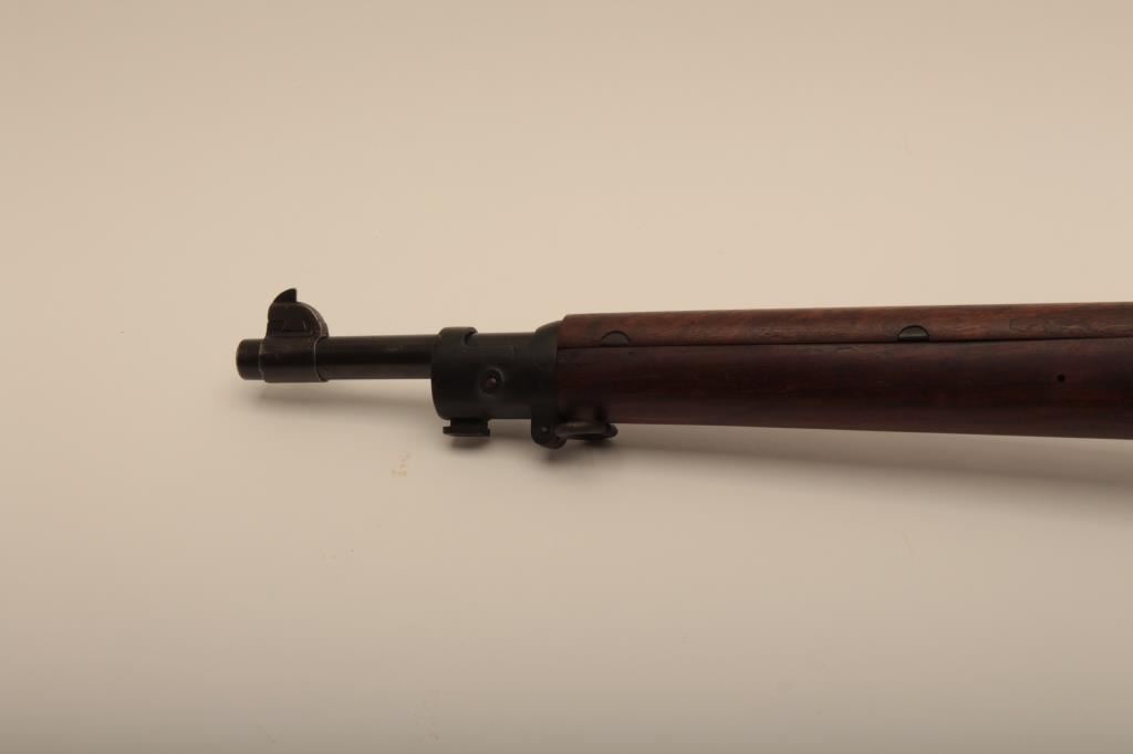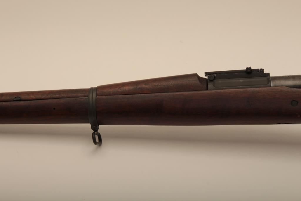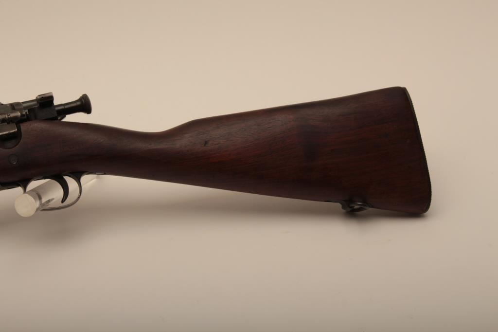 US Springfield Armory Model 1903 A1 bolt action rifle, .30 caliber, Serial #1477947. The rifle is in very good overall condition with a 24” barrel with a ramped blade front and military tangent style rear sights. The barrel retains a significant amount of its military finish and is marked, “SA” with the flaming bomb emblem and dated 3-39. The receiver has gone to a uniform grey with sharp markings. The smooth wood stock is in good condition with handling marks. There are two cartouches, a Circle P behind the trigger guard and “FJA” under the tang on the left side of the butt stock. The bore is good, the action is crisp and markings are sharp. Est.: $400-$800. (C+R).