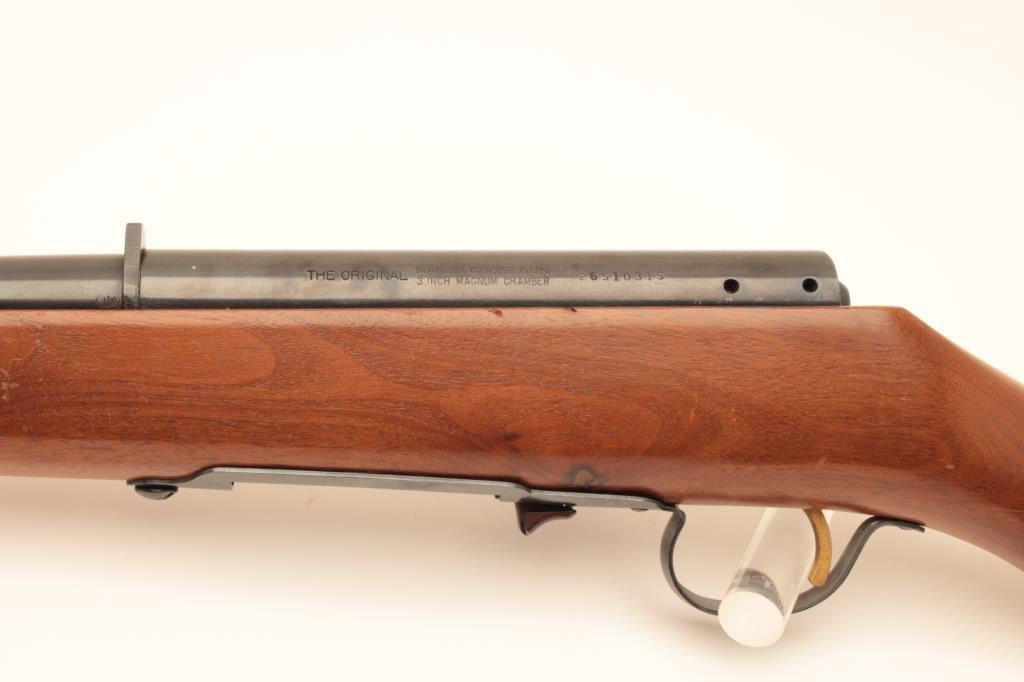 Marlin Goose Gun bolt action shotgun, 12 gauge, 36” barrel, no magazine, blued finish, wood stock, S/N 26510315; overall very good condition with majority original finish remaining, very good bore, crisp action, sharp markings and very good wood (Modern). Est.: $50-$100.