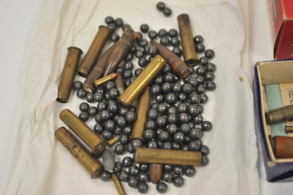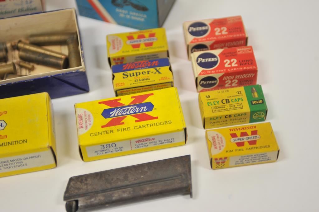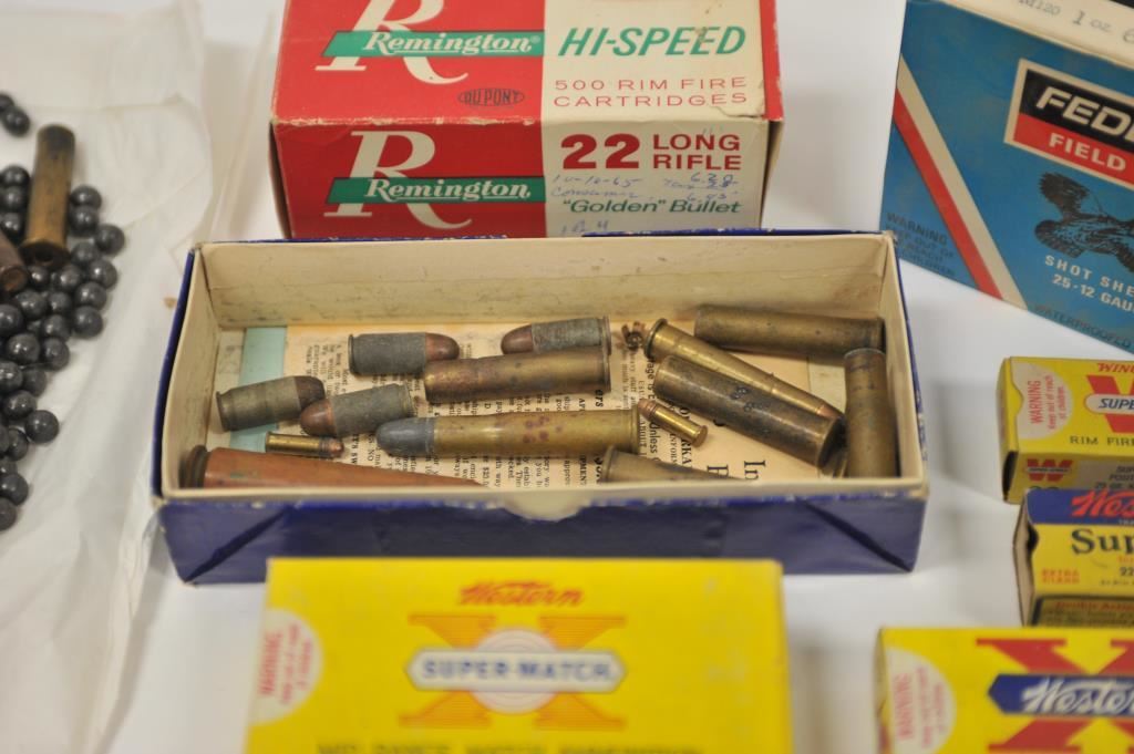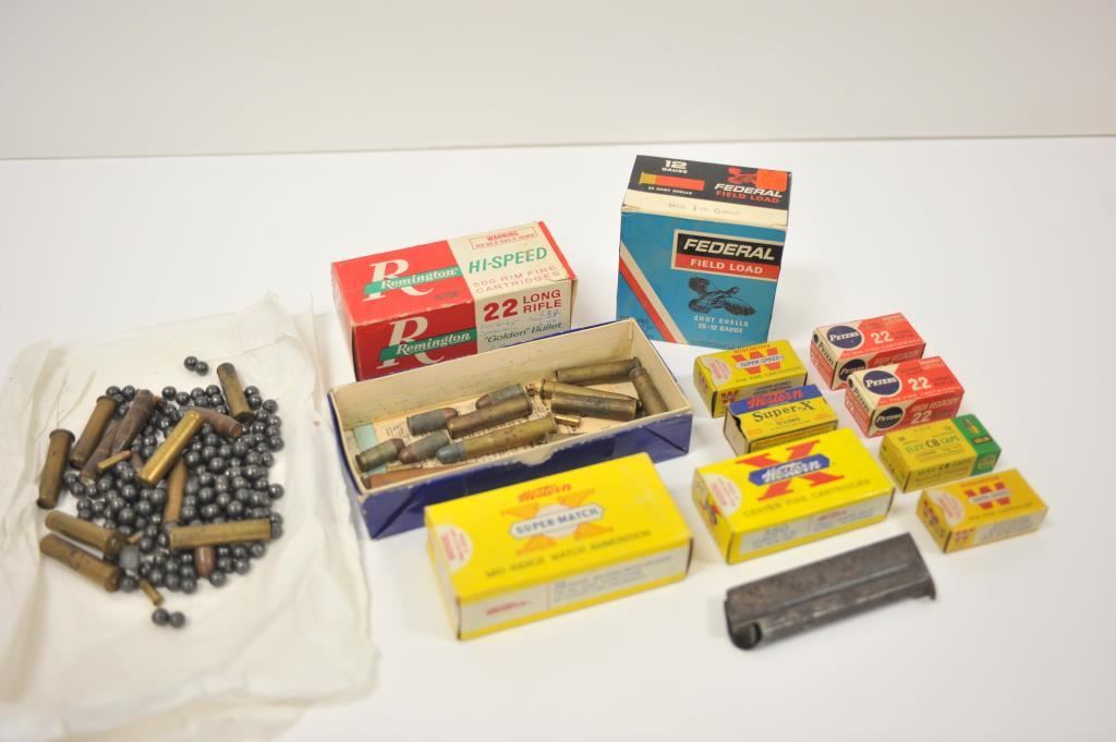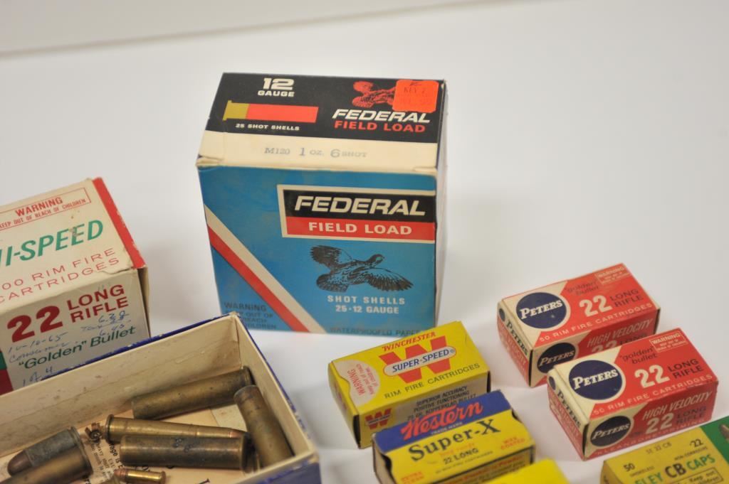 Small box of misc. ammo including a “brick” of Remington .22LR cartridges, a box of Federal Field Load 12 gauge shot shells, 6 small boxes of misc. .22 caliber cartridges, etc. Est.: $30-$60.