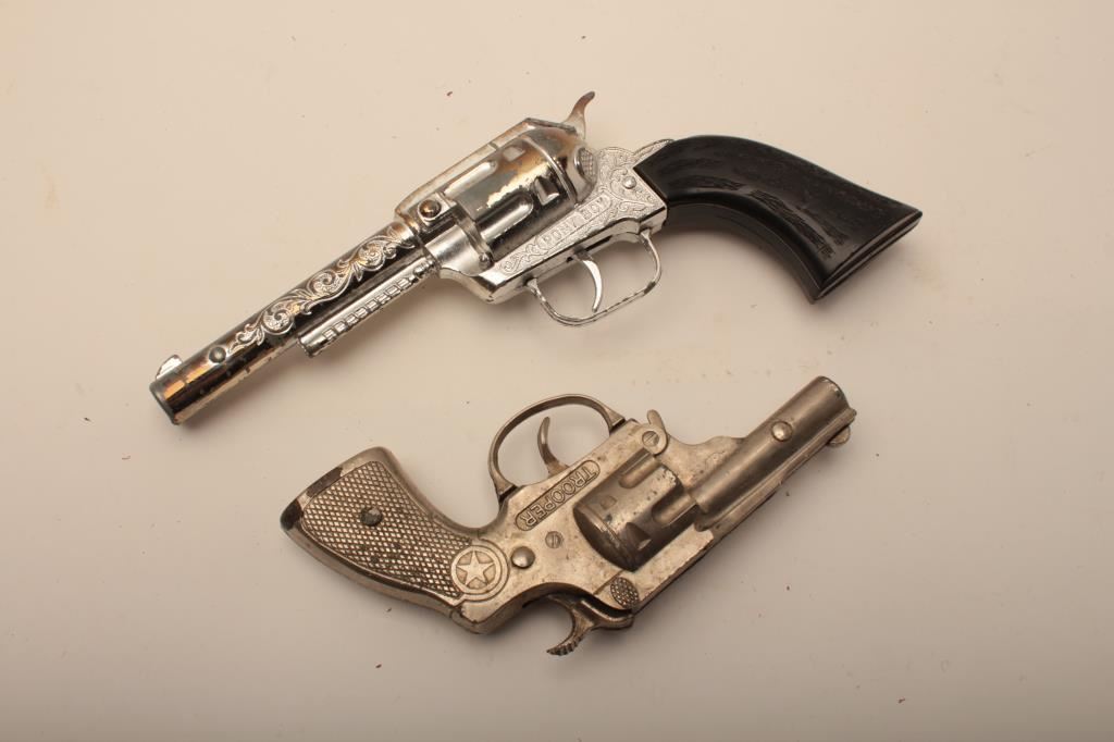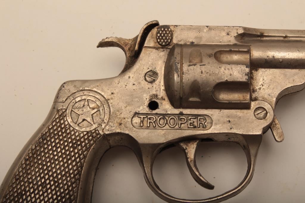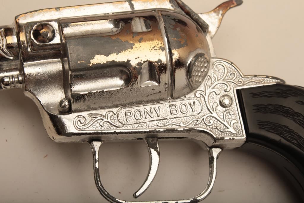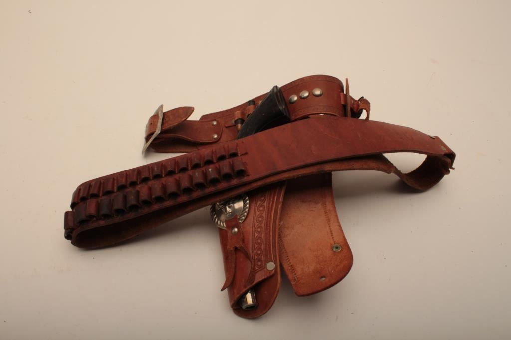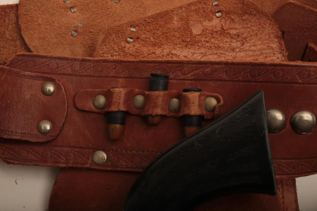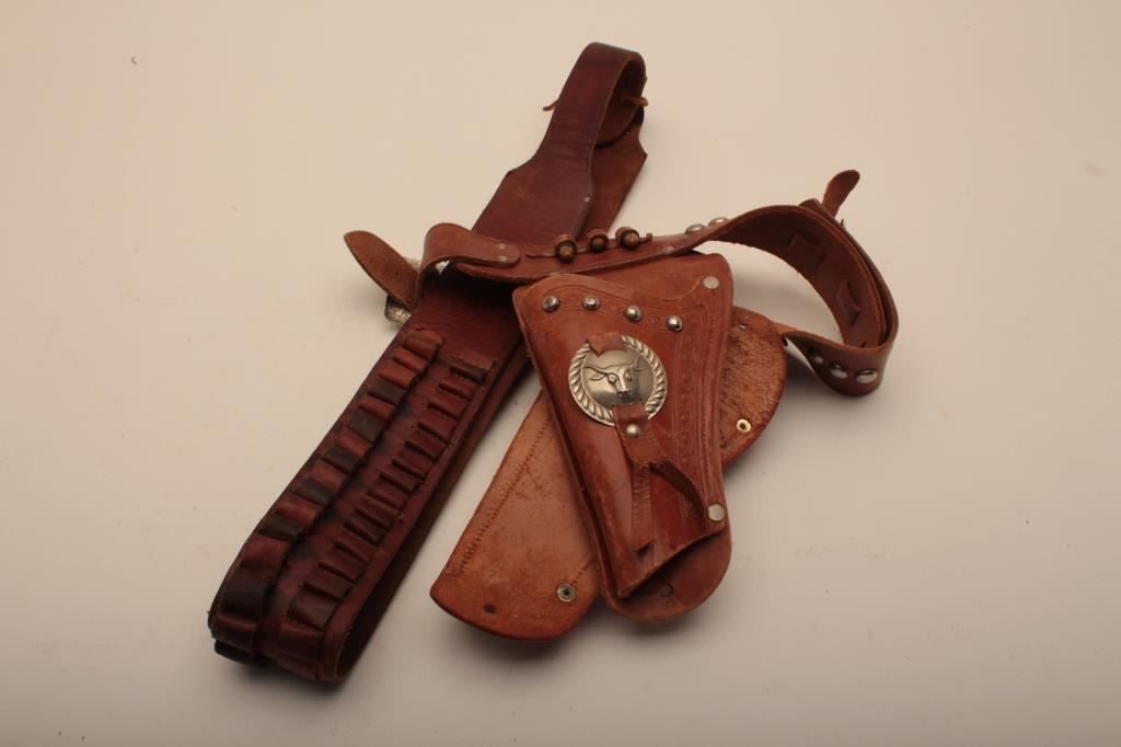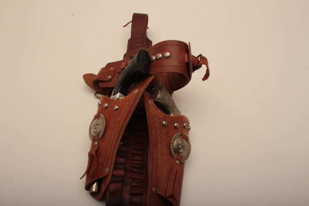 Kids vintage cap gun leather rig with 2 cap guns, one Pony Boy and one cast metal Trooper. Holster has conchos and is tooled with studs. High quality. Also, leather cartridge belt for 38 cal. and 44/45 cartridges, double layer, no buckle, but ties. Marked Brauer Bros, St. Louis. Est. $75-150