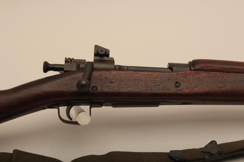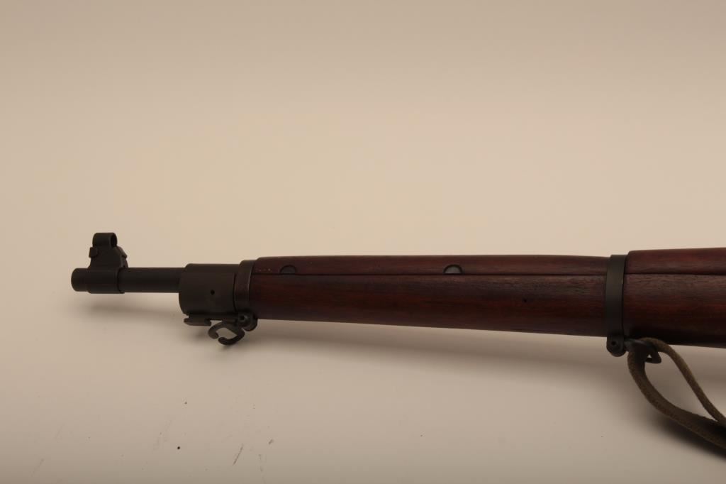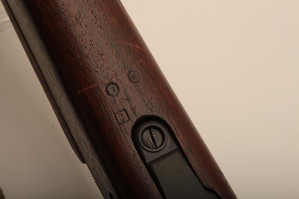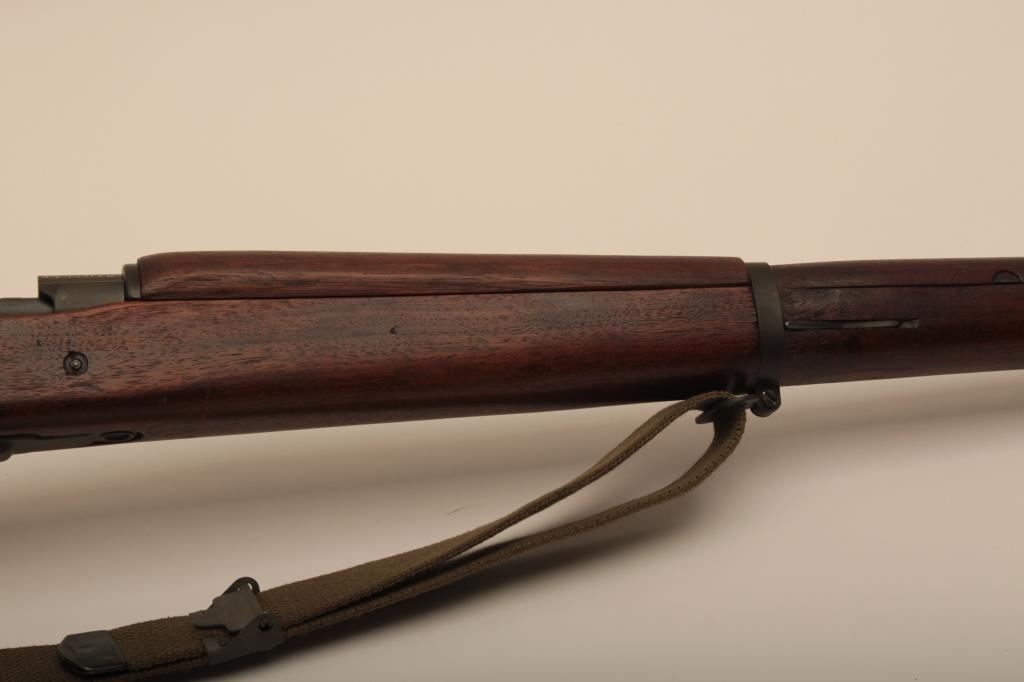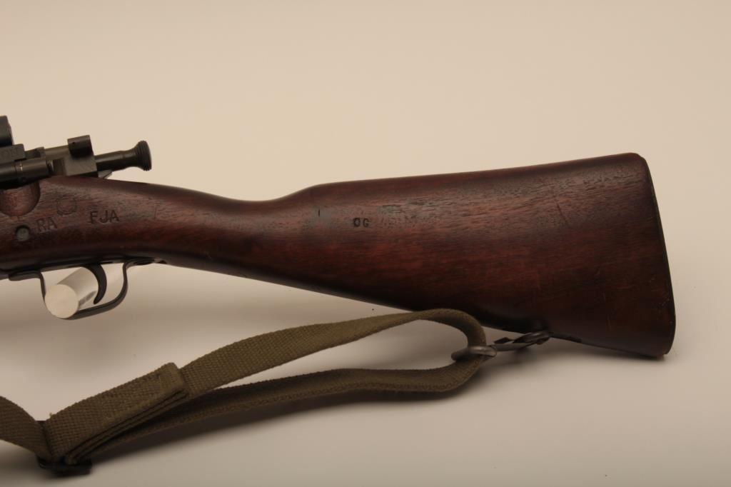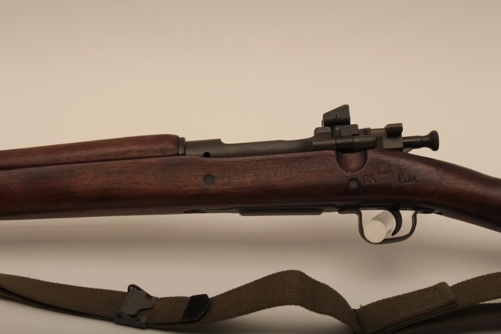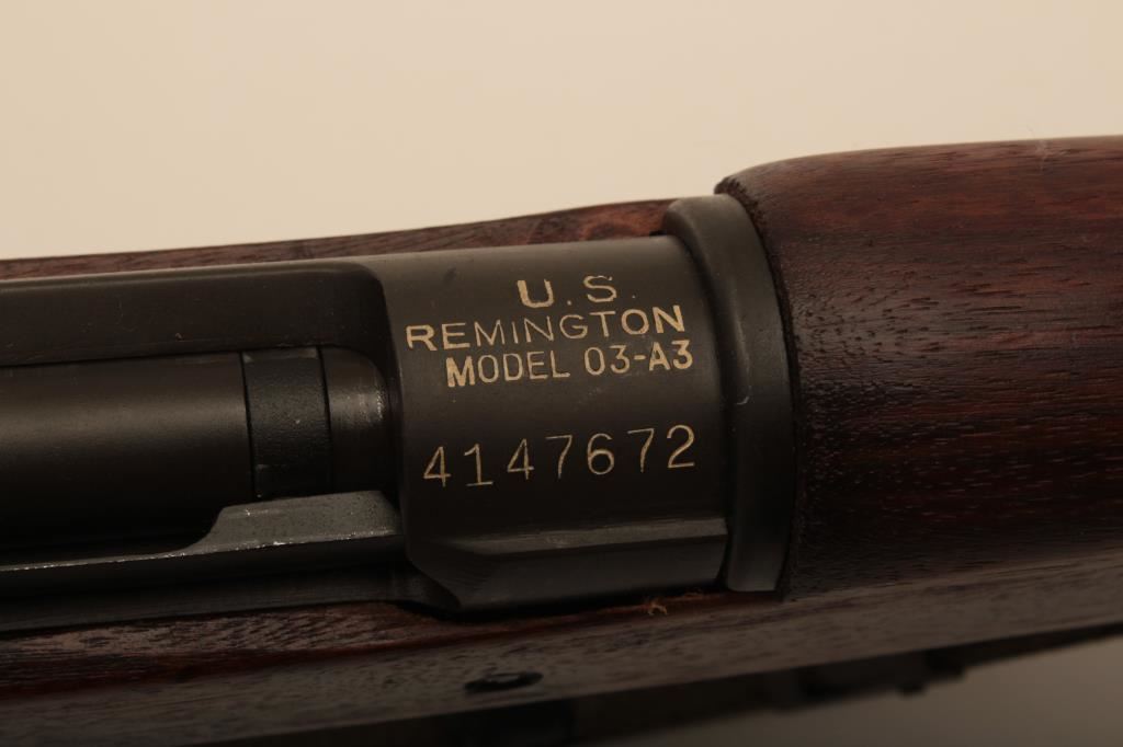 Remington Model 03-A3, #4147672, cal., 24" barrel, parkerized finish, "scant" stock. Rifle is in very good to near fine condition overall, showing nearly all of it's original military finish. Bore is very good, Remington barrel is dated 12-43, action is good, stock is fine overall, with minimal mars, crossed cannon, "RA" and "FJA" cartouches on the left side of the stock above the trigger guard. There is a circle "P" behind the trigger guard and a small "OG" half way down the left side of the stock. There are also 4 small inspection marks on the bottom of the stock forward of the floor plate screw. Front sight cover and nylon sling included. A very nice, original 03-A3 seldom seen in this condition. (C&R) Est. $600-1200