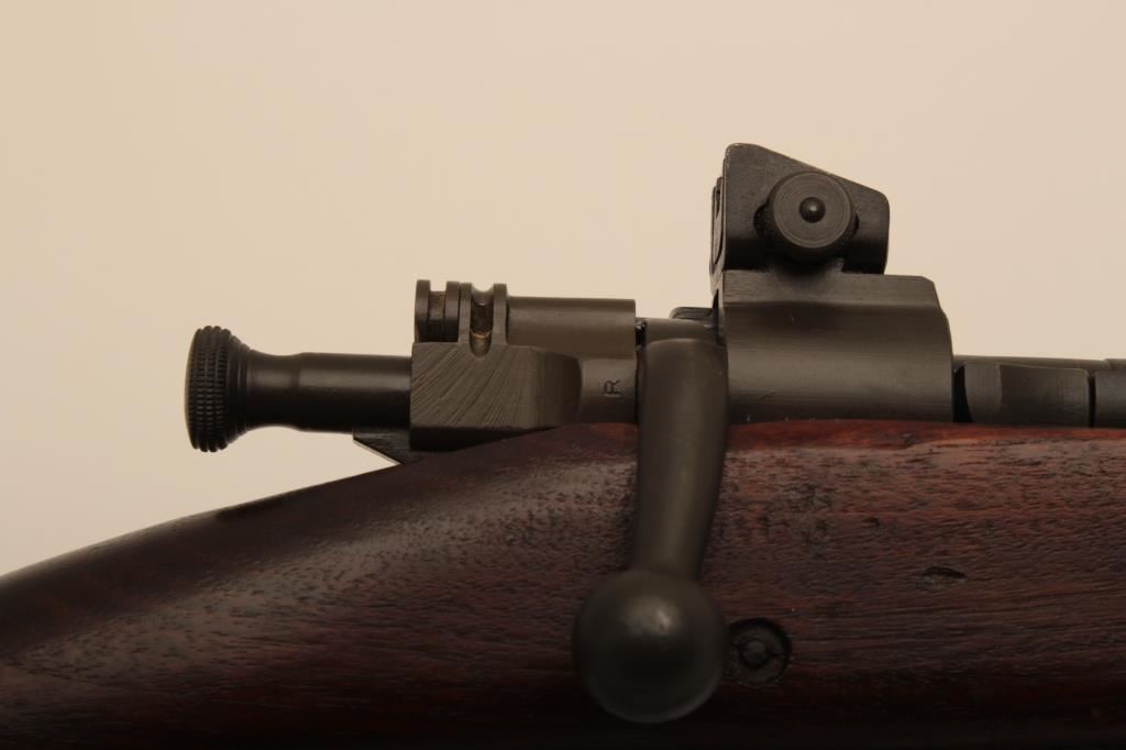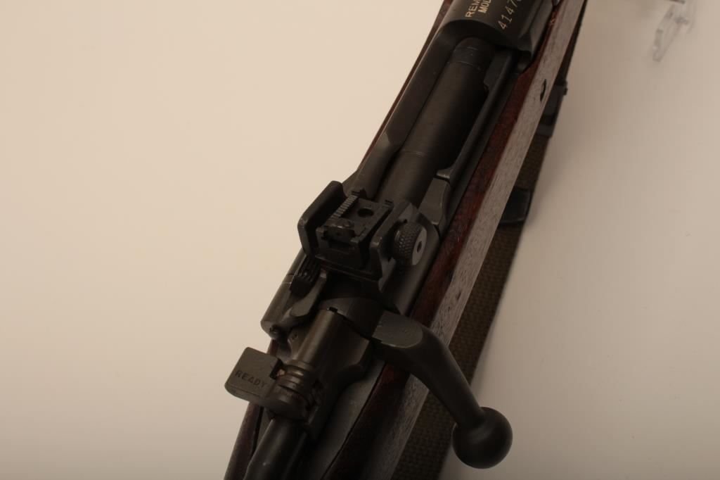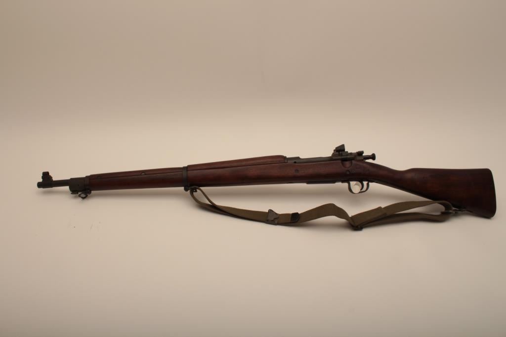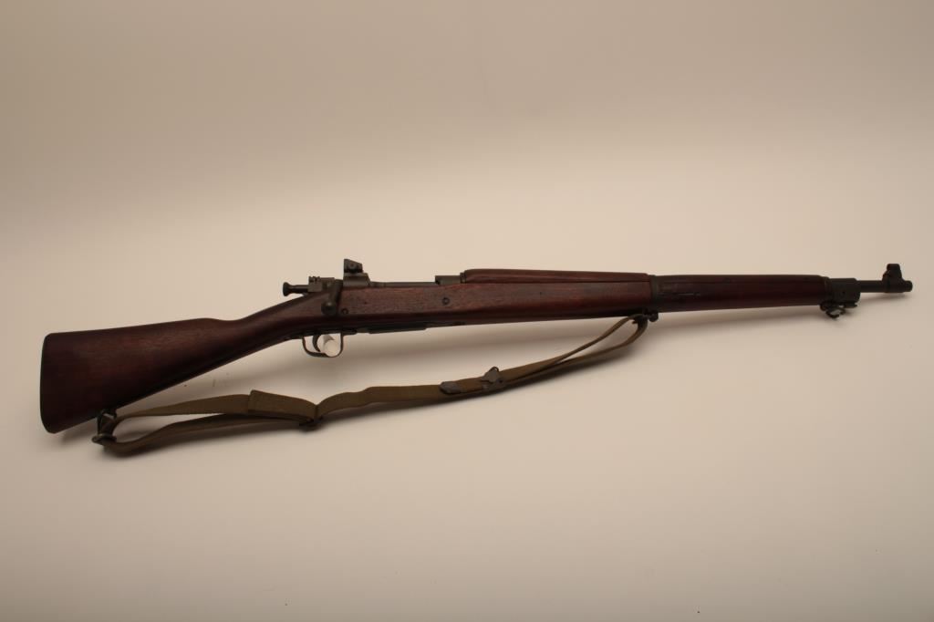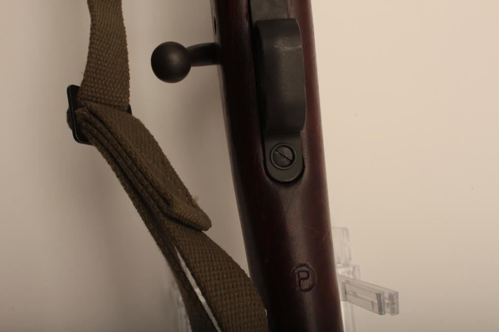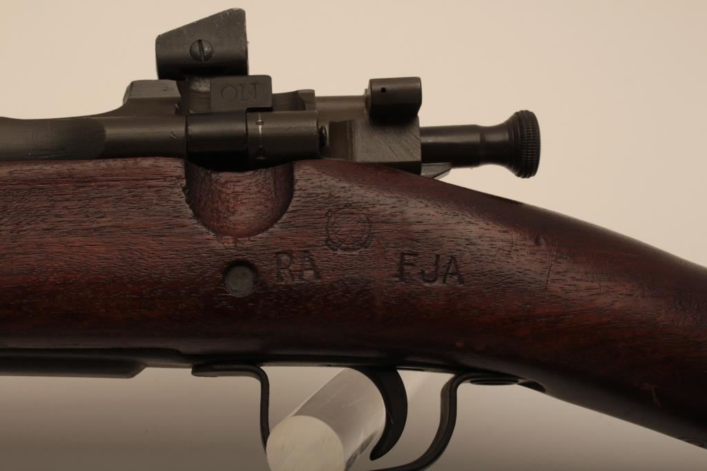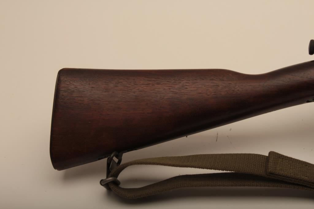 Remington Model 03-A3, #4147672, cal., 24" barrel, parkerized finish, "scant" stock. Rifle is in very good to near fine condition overall, showing nearly all of it's original military finish. Bore is very good, Remington barrel is dated 12-43, action is good, stock is fine overall, with minimal mars, crossed cannon, "RA" and "FJA" cartouches on the left side of the stock above the trigger guard. There is a circle "P" behind the trigger guard and a small "OG" half way down the left side of the stock. There are also 4 small inspection marks on the bottom of the stock forward of the floor plate screw. Front sight cover and nylon sling included. A very nice, original 03-A3 seldom seen in this condition. (C&R) Est. $600-1200