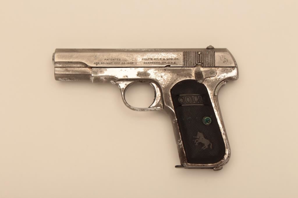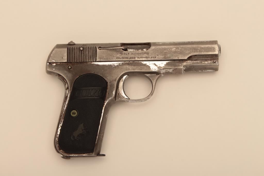 Colt Pocket Model 1908 semi-automatic pistol, .380 caliber, 3.75” barrel, traces of nickel finish, checkered hard rubber grips, S/N 42839; overall good condition with traces of nickel finish/balance of gun gone to a grey patina, good action, visible markings and overall good grips showing wear from carry. (C&R/PPT). Est.: $500-$1,000.