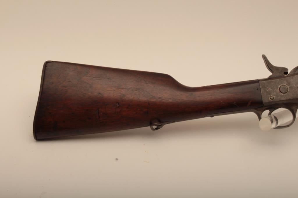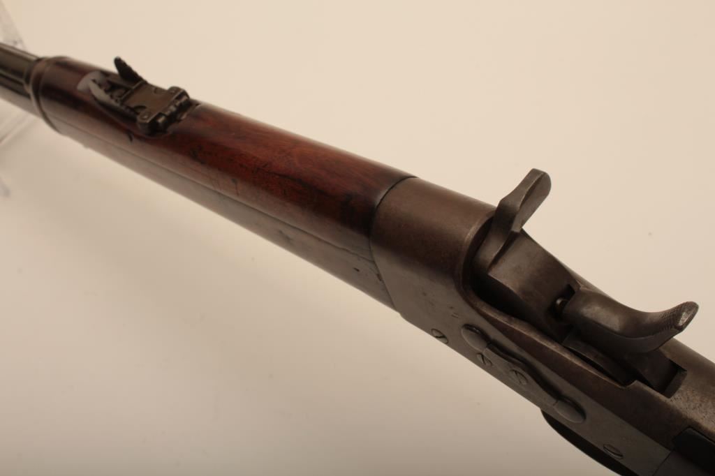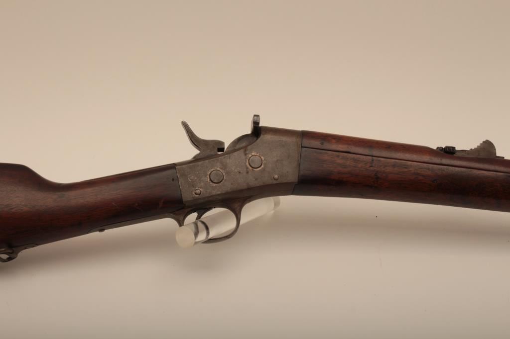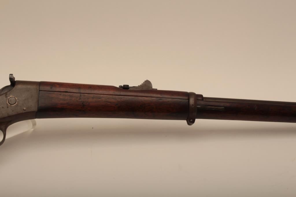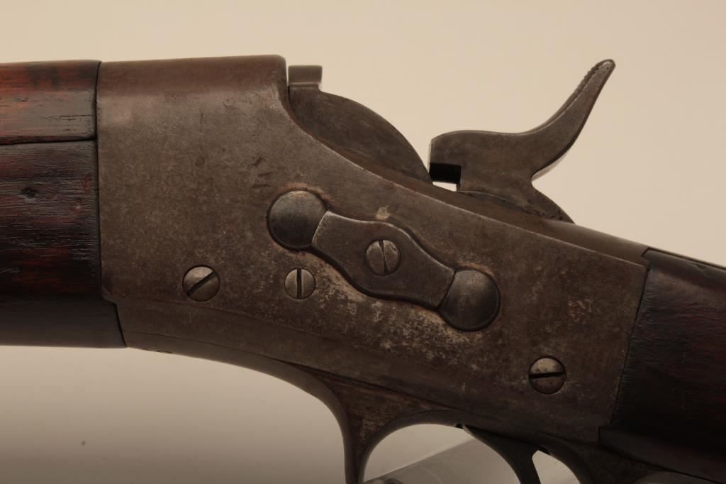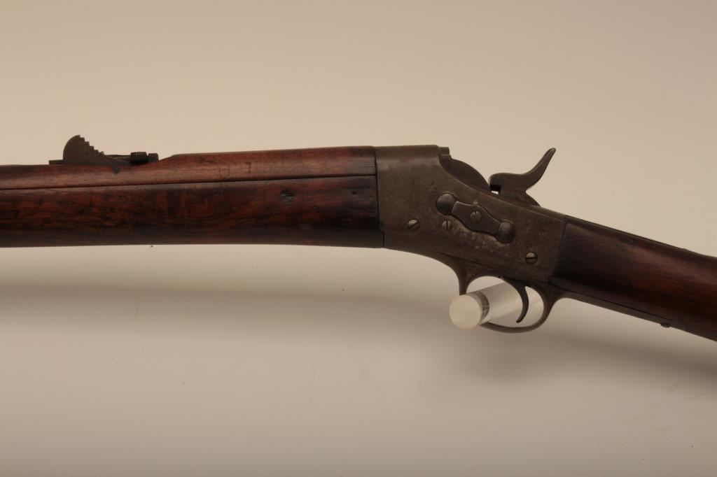 Remington 1901 Rolling Block single shot rifle, 7mm caliber, 30” barrel, blued and case hardened finish, wood stocks, no visible S/N; overall good condition with dark patina to metal surfaces; slight silver tone to protected areas of receiver, good bore, crisp action, good markings and wood. (C&R). Est.: $250-$500.