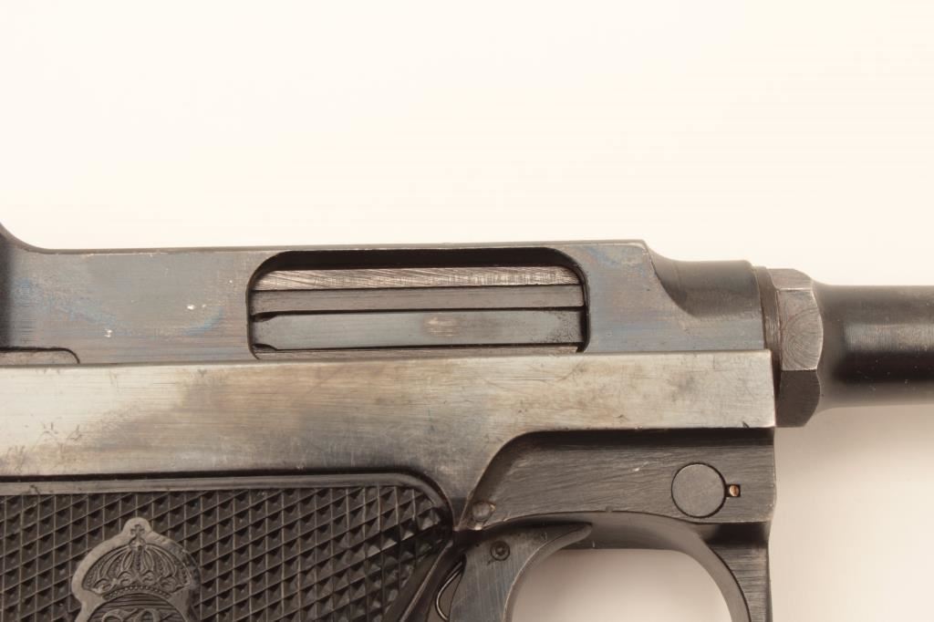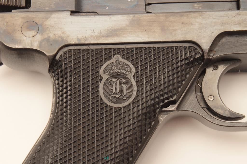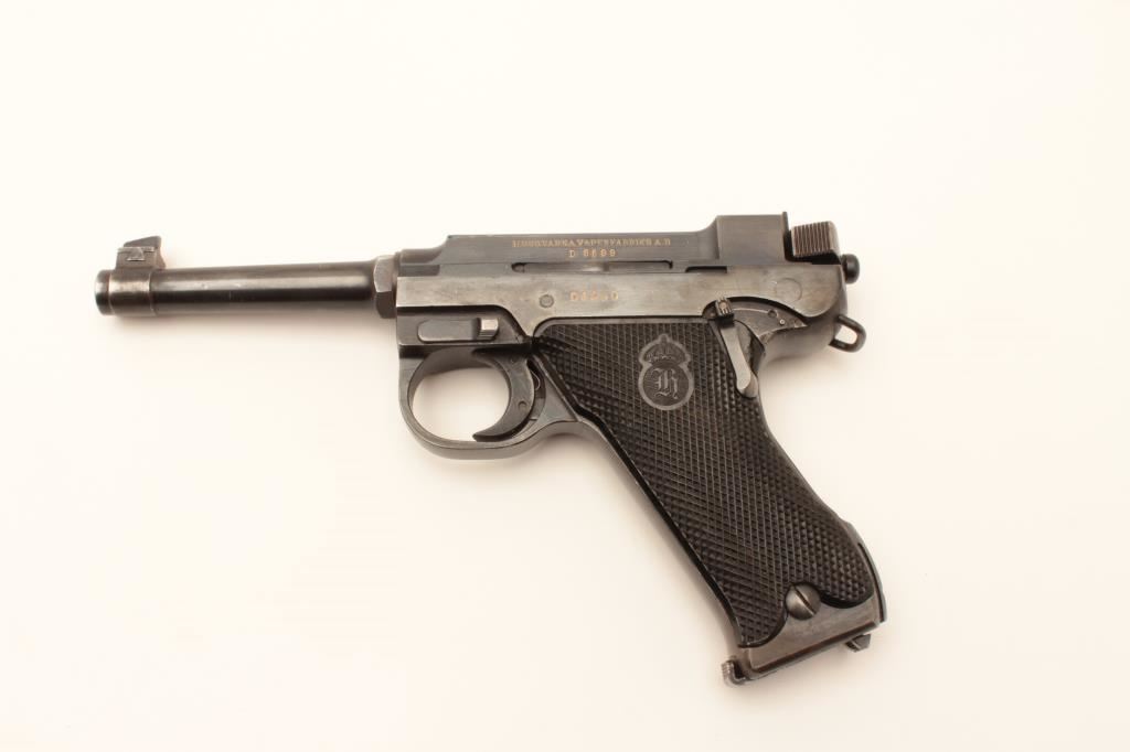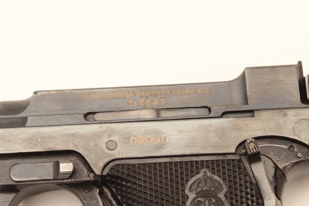 Swedish Husqvarna Lahti semi-automatic pistol, 9mm caliber, 4.75” barrel, blued finish, checkered plastic grips, S/N D5599; overall very good + showing the majority of original finish, very good bore, crisp action, sharp markings and very good grips; accompanied by a brown leather flap holster with two extra magazines, cleaning rod and loader. (C&R/PPT). Est.: $600-$1,200.