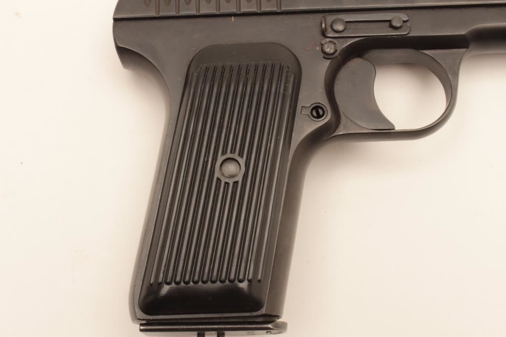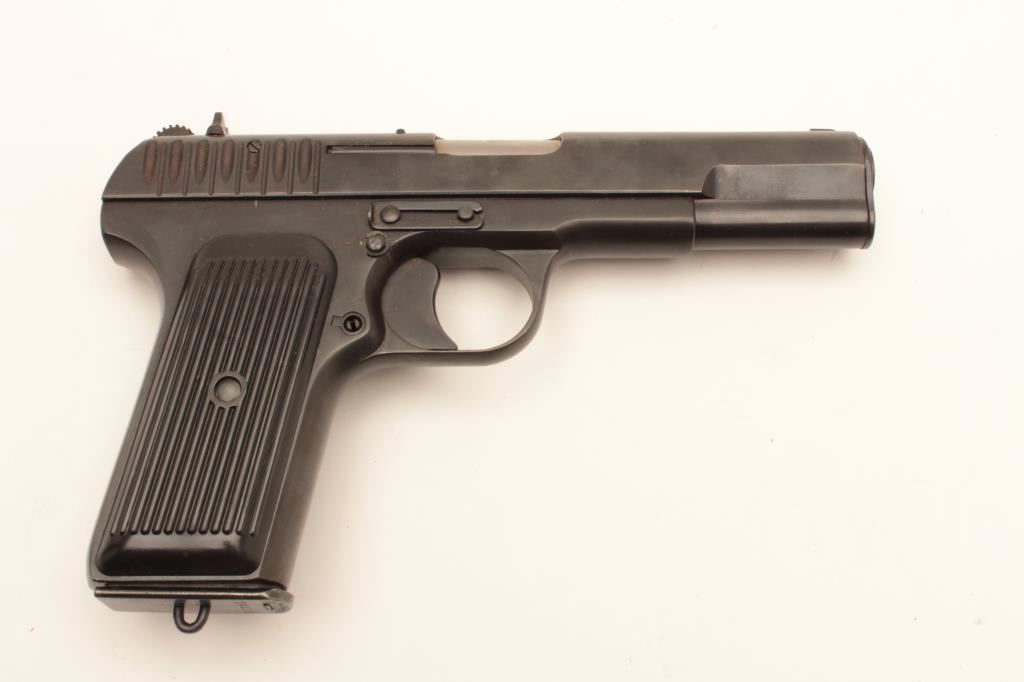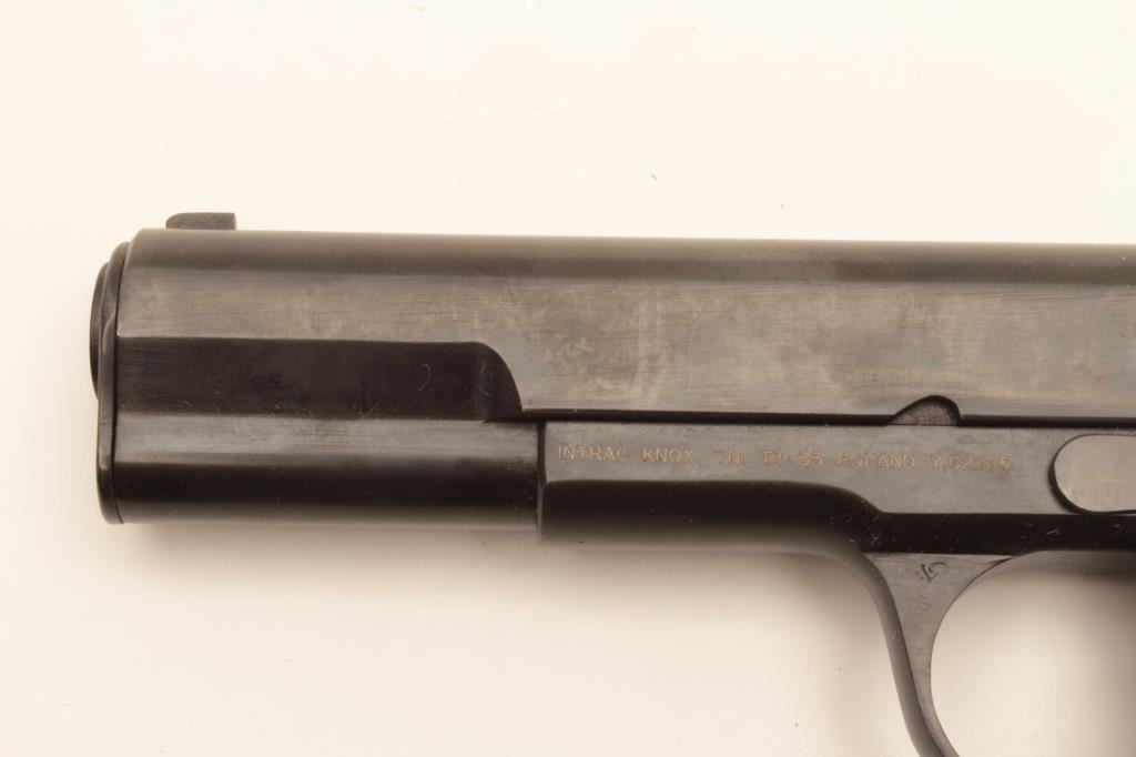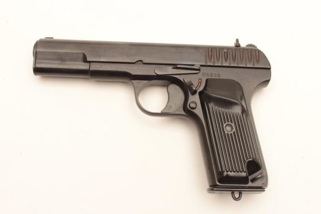 Polish Tokarev semi-automatic pistol, import marked, 7.62 x 25mm caliber, 4.5” barrel, blued finish, black hard rubber grips, S/N H623; overall good to very good condition with majority of finish remaining, very good bore, crisp action, good markings and very good grips. (C&R/PPT). Est.: $250-$500.
